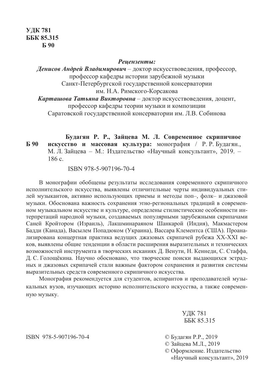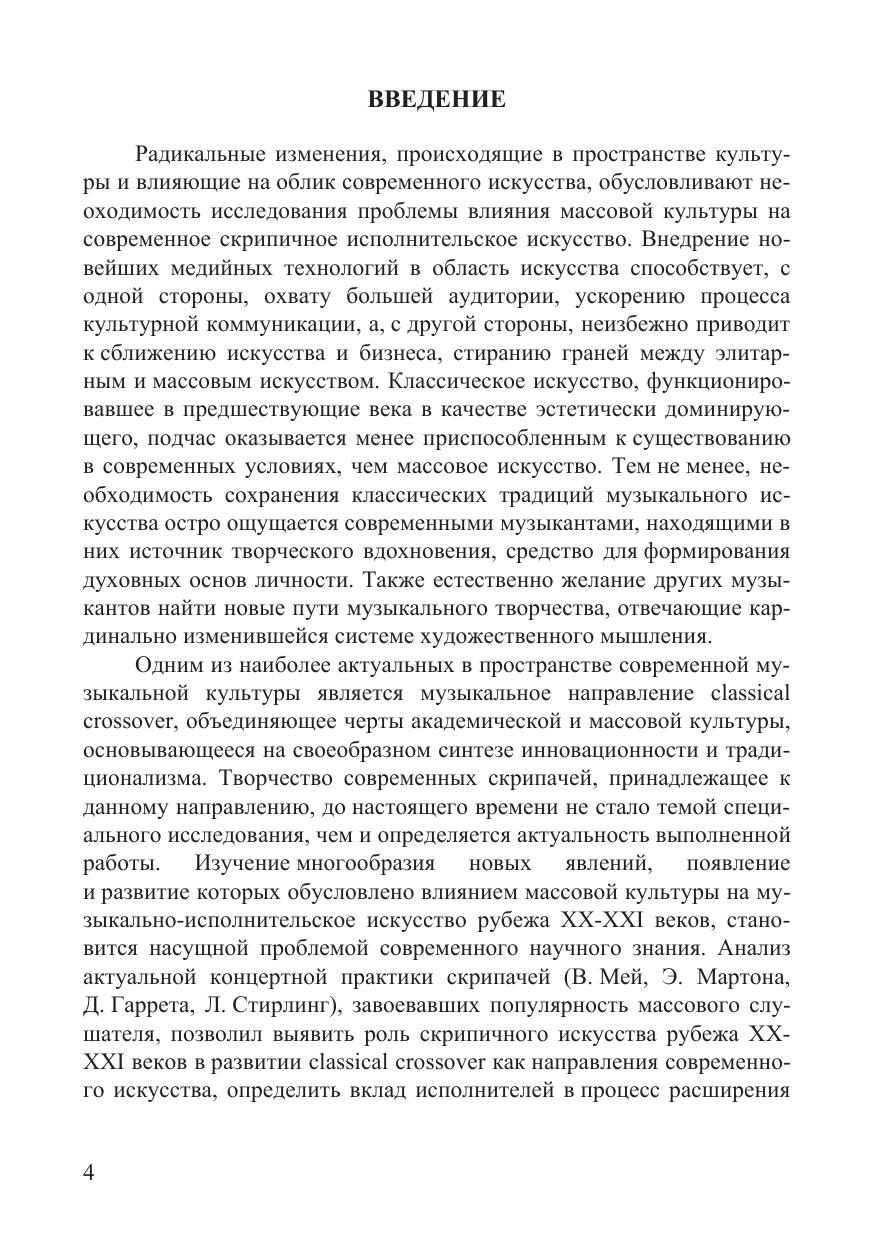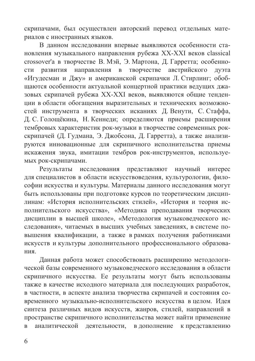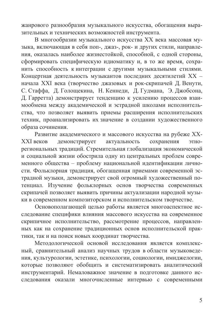 В монографии обобщены результаты исследования современного скрипичного исполнительского искусства, выявлены отличительные черты индивидуальных стилей музыкантов, активно использующих приемы и методы поп-, фолк- и джазовой музыки. Обоснована важность сохранения этно-региональных традиций в современном музыкальном искусстве и культуре, определены стилистические особенности интерпретаций народной музыки, создаваемых популярными зарубежными скрипачами Саней Кройтором (Израиль), Лакшминараяном Шанкарой (Индия), Макмастером Бадди (Канада), Васылем Попадюком (Украина), Вассара Клементса (США). Проанализирована концертная практика ведущих джазовых скрипачей рубежа XX-XXI веков, выявлены общие тенденции в области расширения выразительных и технических возможностей инструмента в творческих исканиях Д. Венути Н. Кеннеди С. Стаффа Д. С. Голощёкина. Научно обосновано, что творческие поиски выдающихся эстрадных и джазовых скрипачей стали важным фактором сохранения и развития системы выразительных средств современного скрипичного искусства. Монография рекомендуется для студентов, аспирантов и преподавателей музыкальных вузов, изучающих историю исполнительского искусства, а также современную музыку.
