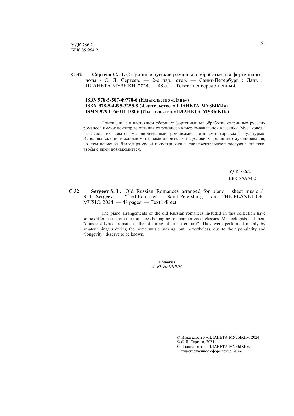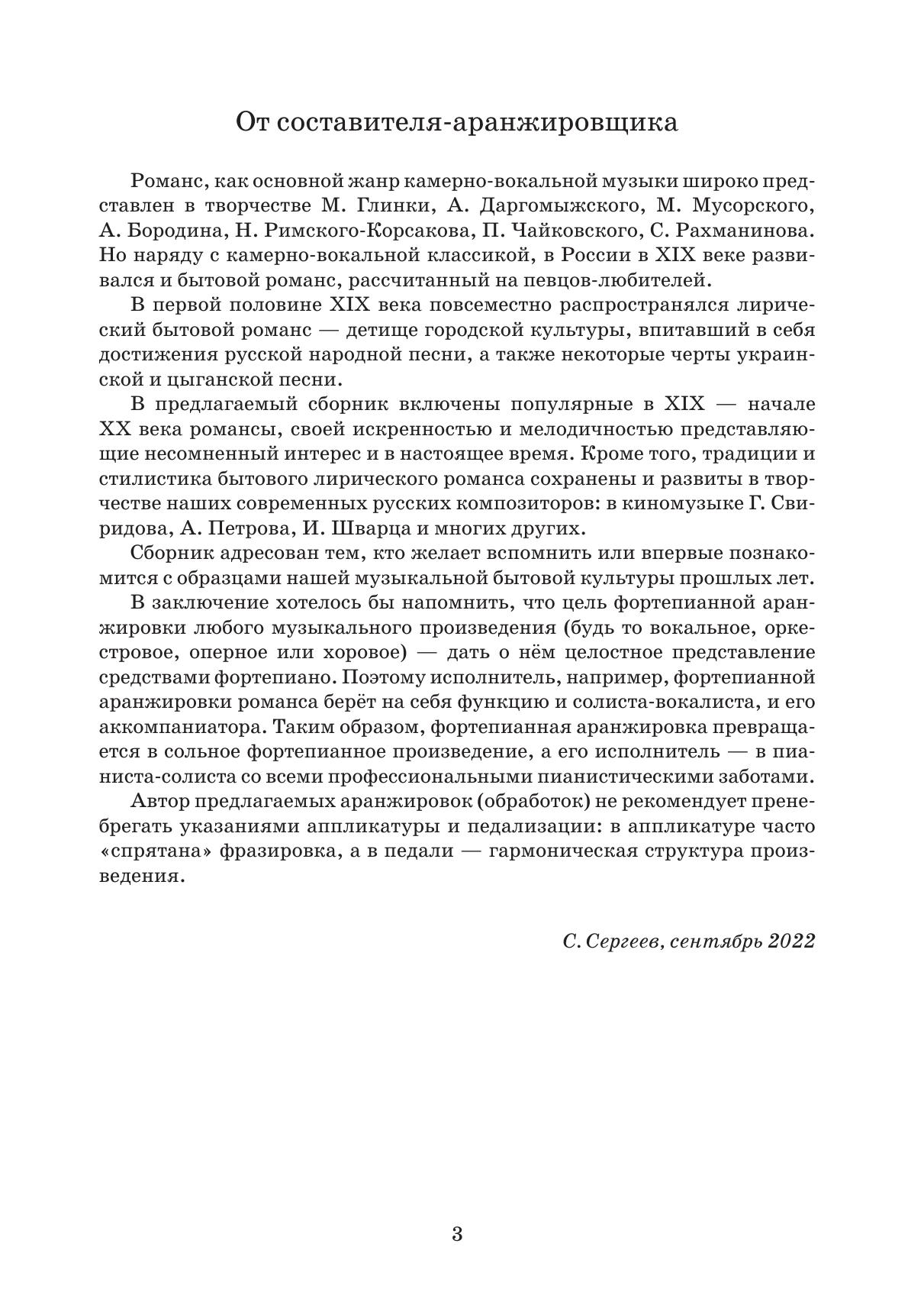 Помещённые в настоящем сборнике фортепианные обработки старинных русских романсов имеют некоторые отличия от романсов камерно-вокальной классики. Музыковеды называют их «бытовыми лирическими романсами, детищами городской культуры». Исполнялись они, в основном, певцами-любителями в условиях домашнего музицирования, но, тем не менее, их популярность и «долгожительство» заслуживают того, чтобы с ними познакомиться. The piano arrangements of the old Russian romances included in this collection have some differences from the romances belonging to chamber vocal classics. Musicologists call them “domestic lyrical romances, the offspring of urban culture”. They were performed mainly by amateur singers during the home music making, but, nevertheless, due to their popularity and “longevity” deserve to be known.