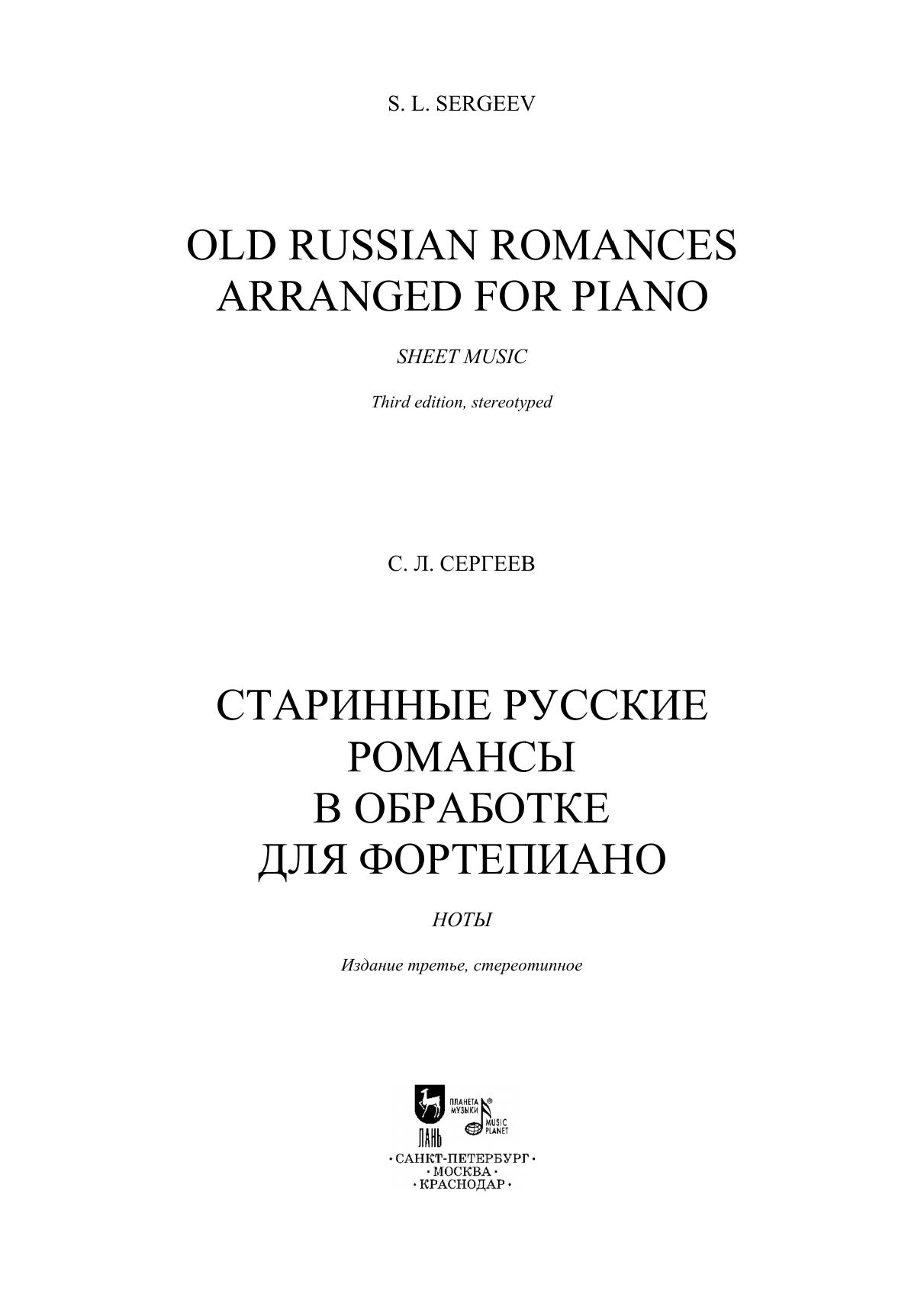 Помещённые в настоящем сборнике фортепианные обработки старинных русских романсов имеют некоторые отличия от романсов камерно-вокальной классики. Музыковеды называют их «бытовыми лирическими романсами, детищами городской культуры». Исполнялись они, в основном, певцами-любителями в условиях домашнего музицирования, но, тем не менее, их популярность и «долгожительство» заслуживают того, чтобы с ними познакомиться. The piano arrangements of the old Russian romances included in this collection have some differences from the romances belonging to chamber vocal classics. Musicologists call them “domestic lyrical romances, the offspring of urban culture”. They were performed mainly by amateur singers during the home music making, but, nevertheless, due to their popularity and “longevity” deserve to be known.