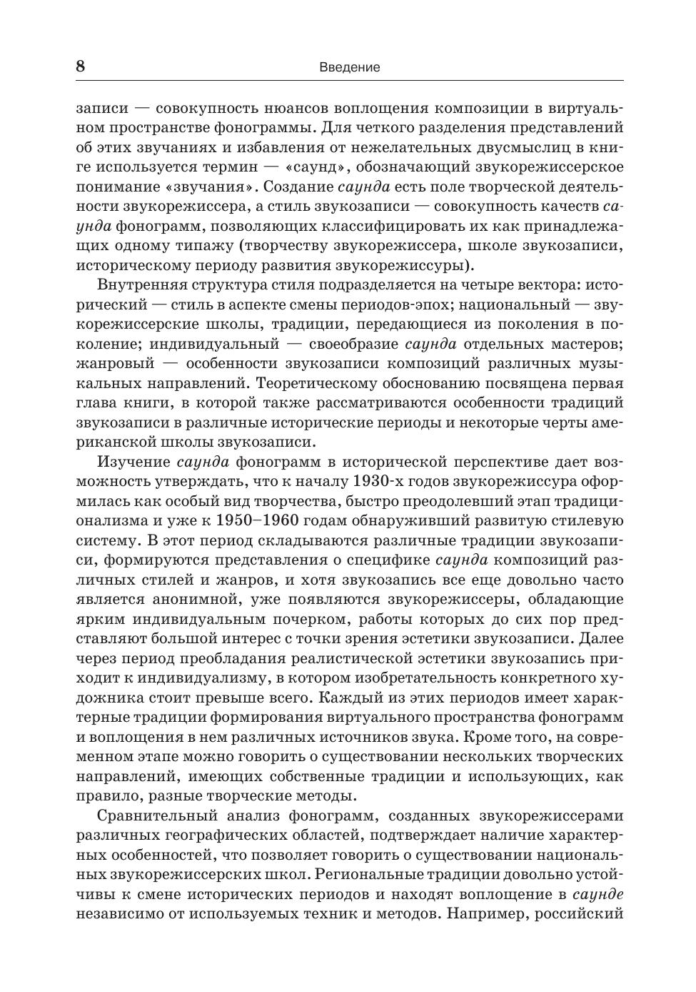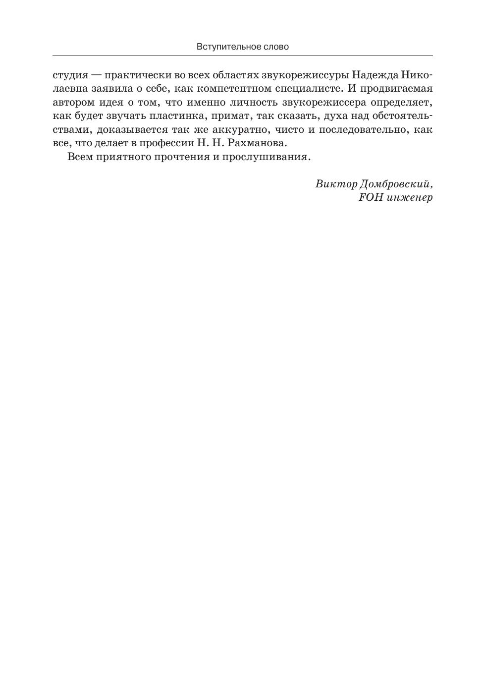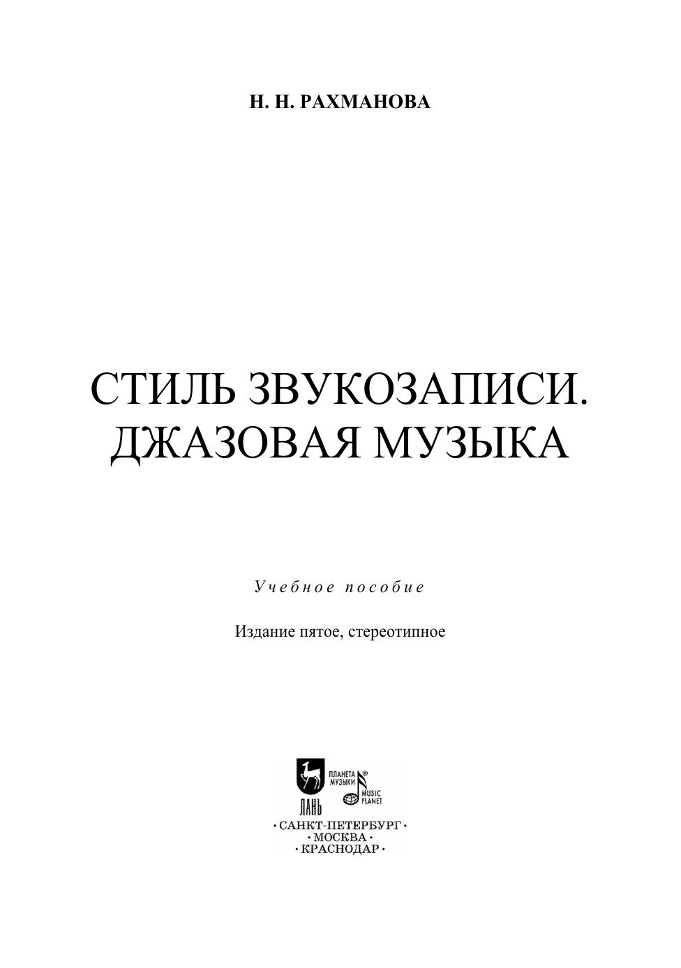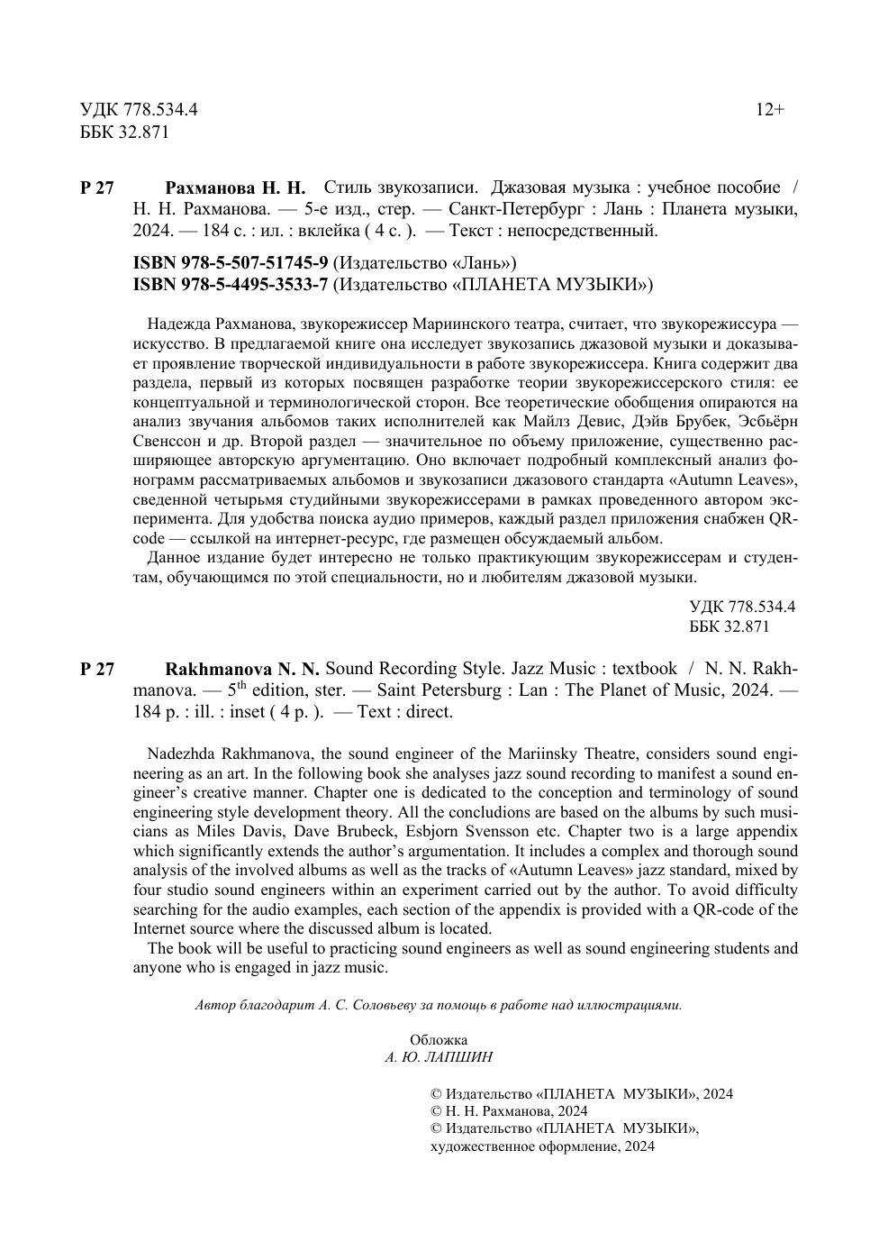 Надежда Рахманова, звукорежиссер Мариинского театра, считает, что звукорежиссура — искусство. В предлагаемой книге она исследует звукозапись джазовой музыки и до-казывает проявление творческой индивидуальности в работе звукорежиссера. Книга содержит два раздела, первый из которых посвящен разработке теории звукорежиссерского стиля: ее концептуальной и терминологической сторон. Все теоретические обобщения опираются на анализ звучания альбомов таких исполнителей как Майлз Девис, Дэйв Брубек, Эсбьёрн Свенссон и др. Второй раздел — значительное по объему приложение, существенно расширяющее авторскую аргументацию. Оно включает подробный комплексный ана-лиз фонограмм рассматриваемых альбомов и звукозаписи джазового стандарта «Autumn Leaves», сведенной четырьмя студийными звукорежиссерами в рамках проведенного авто-ром эксперимента. Для удобства поиска аудио примеров, каждый раздел приложения снабжен QR-code — ссылкой на интернет-ресурс, где размещен обсуждаемый альбом. Данное издание будет интересно не только практикующим звукорежиссерам и студентам, обучающимся по этой специальности, но и любителям джазовой музыки. Nadezhda Rakhmanova, the sound engineer of the Mariinsky Theatre, considers sound engineering as an art. In the following book she analyses jazz sound recording to manifest a sound engineer’s creative manner. Chapter one is dedicated to the conception and terminology of sound engineering style development theory. All the concludions are based on the albums by such musicians as Miles Davis, Dave Brubeck, Esbjorn Svensson etc. Chapter two is a large appendix which significantly extends the author’s argumentation. It includes a complex and thorough sound analysis of the involved albums as well as the tracks of «Autumn Leaves» jazz standard, mixed by four studio sound engineers within an experiment carried out by the author. To avoid difficulty searching for the audio examples, each section of the appendix is provided with a QR-code of the Internet source where