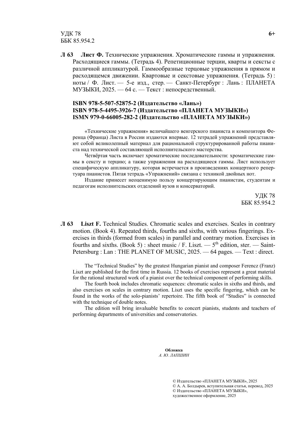 «Технические упражнения» величайшего венгерского пианиста и композитора, Ференца (Франца) Листа, в России издаются впервые. 12 тетрадей упражнений представляют собой великолепный материал для рациональной структурированной работы пианиста над технической составляющей исполнительского мастерства. Четвёртая часть включает хроматические последовательности: хроматические гаммы в сексту и терцию, а также упражнения на расходящиеся гаммы. Лист использует специфическую аппликатуру, которая встречается в произведениях концертного репертуара пианистов. Пятая тетрадь "Упражнений" связана с техникой двойных нот. Издание принесет неоценимую пользу концертирующим пианистам, студентам и педагогам исполнительских отделений вузов и консерваторий.
