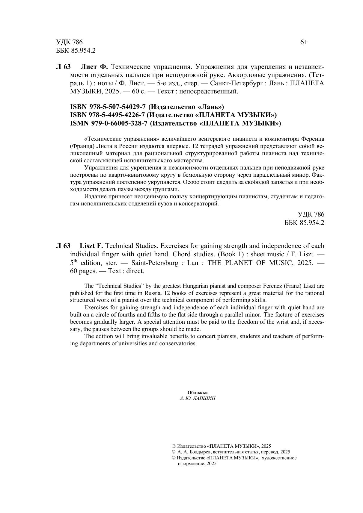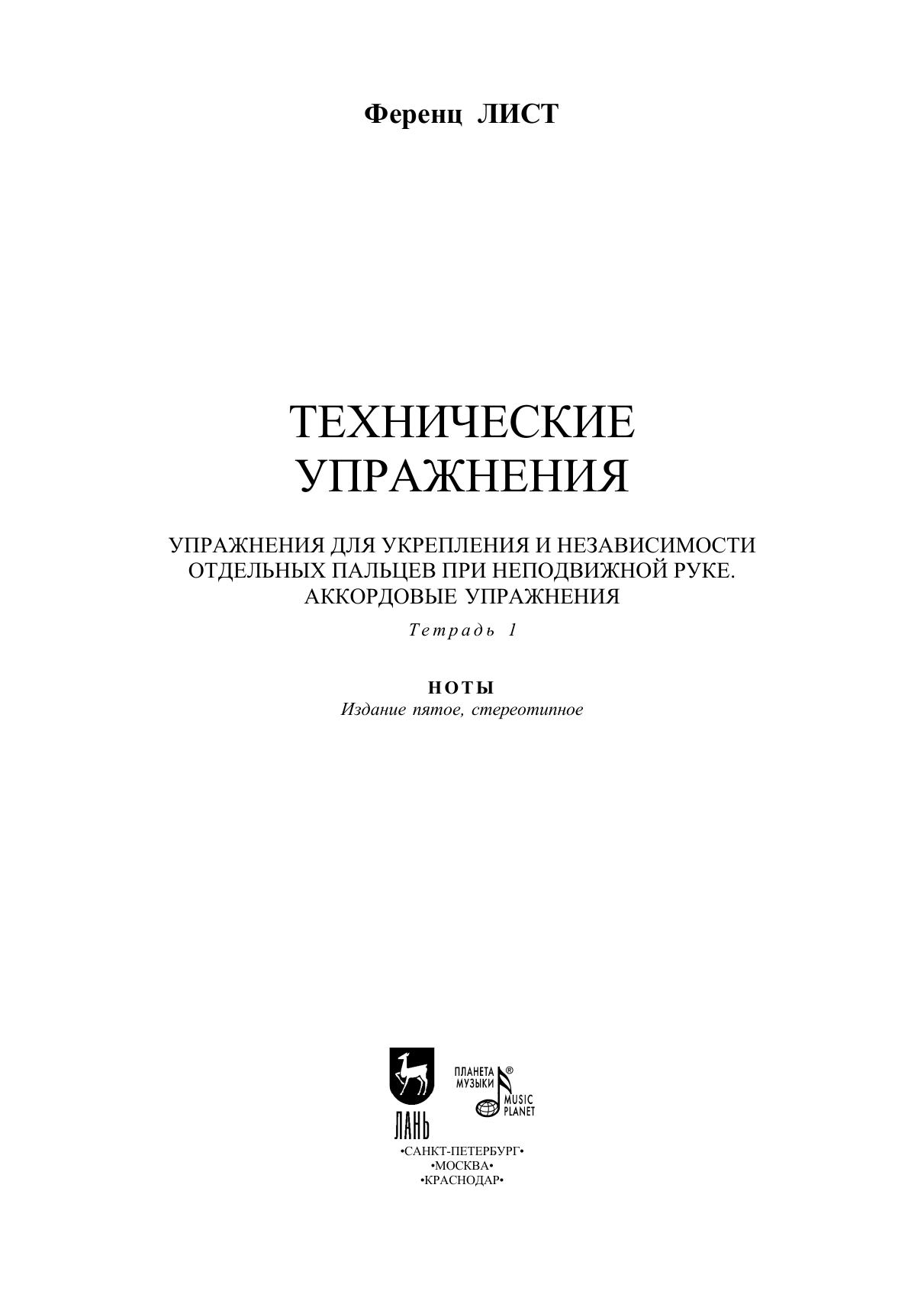 «Технические упражнения» величайшего венгерского пианиста и композитора, Ференца Листа, в России издаются впервые. 12 тетрадей упражнений представляют собой великолепный материал для рациональной структурированной работы пианиста над технической составляющей исполнительского мастерства. Упражнения для укрепления и независимости отдельных пальцев при неподвижной руке построены по кварто-квинтовому кругу в бемольную сторону через параллельный минор. Фактура упражнений постепенно укрупняется. Особо стоит следить за свободой запястья и при необходимости делать паузы между группами. Издание принесет неоценимую пользу концертирующим пианистам, студентам и педагогам исполнительских отделений вузов и консерваторий. The "Technical Studies" by the greatest Hungarian pianist and composer Ferencz (Franz) Liszt are published for the first time in Russia. 12 books of exercises represent a great material for the rational structured work of a pianist over the technical component of performing skills. Exercises for gaining strength and independence of each individual finger with quiet hand are built on a circle of fourths and fifths to a flat side through a parallel minor. The facture of exercises becomes gradually larger. A special attention must be paid to the freedom of the wrist and, if necessary, the pauses between the groups can be made. The edition will bring invaluable benefits to concert pianists, students and teachers of performing departments of universities and conservatories.