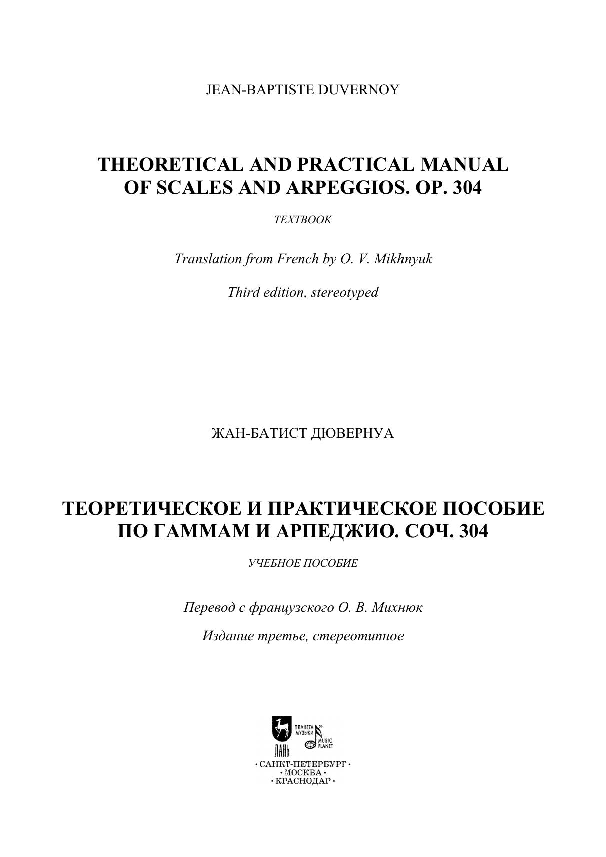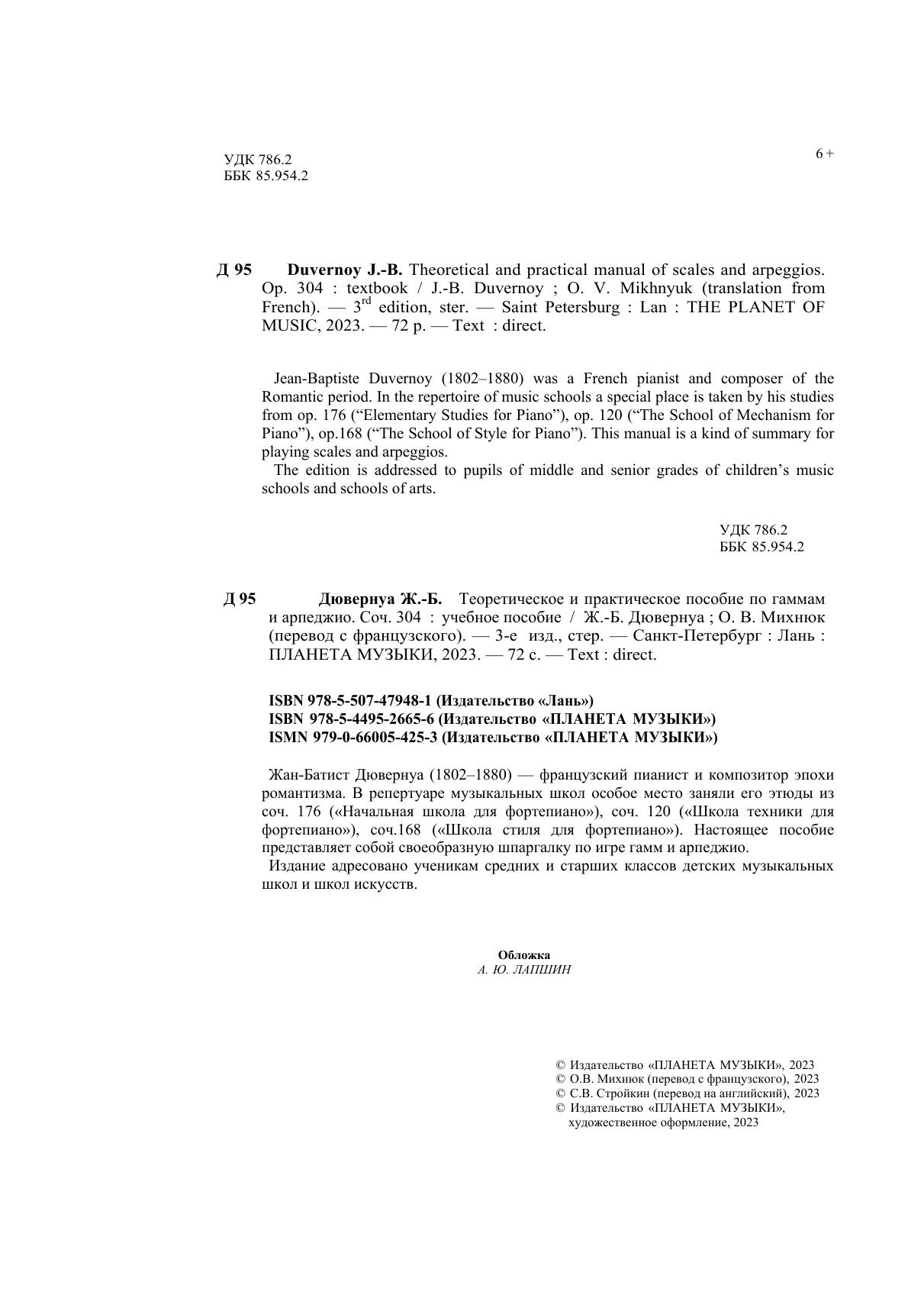 Жан-Батист Дювернуа (1802–1880) – французский пианист и композитор эпохи романтизма. В репертуаре музыкальных школ особое место заняли его этюды из coч. 176 ("Начальная школа для фортепиано"), соч. 120 ("Школа техники для фортепиано"), соч.168 (Школа стиля для фортепиано"). Настоящее пособие представляет собой своеобразную шпаргалку по игре гамм и арпеджио. Издание адресовано ученикам средних и старших классов детских музыкальных школ и школ искусств. Jean-Baptiste Duvernoy (1802–1880) was a French pianist and composer of the Romantic period. In the repertoire of music schools a special place is taken by his studies from op. 176 (“Elementary Studies for Piano”), op. 120 (“The School of Mechanism for Piano”), op.168 (“The School of Style for Piano”). This manual is a kind of summary for playing scales and arpeggios. The edition is addressed to pupils of middle and senior grades of children’s music schools and schools of arts.