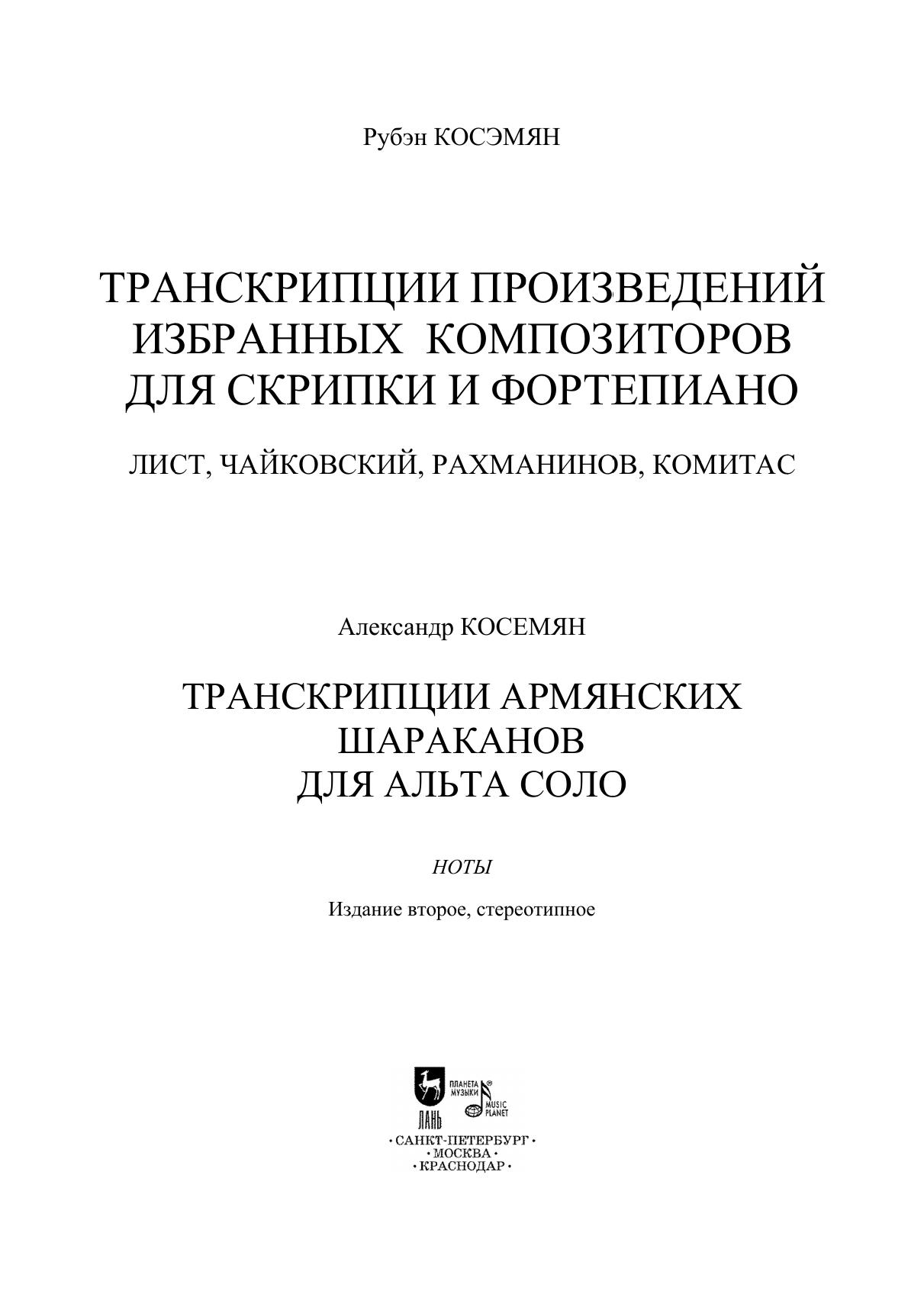 Данный сборник является первым из трёх частей собрания транскрипций Рубена Косемяна, редакция фортепианной партии – Наталья Мнацаканян. Здесь собраны транскрипции для скрипки и фортепиано произведений различных эпох, музыкальных направлений и стилей, в том числе четырёх пьес армянского композитора, музыковеда, фольклориста и хорового дирижёра Комитаса. Сборник также включает в себя переложения Александра Косемяна для альта соло шараканов – древних армянских духовных песнопений V и X вв.