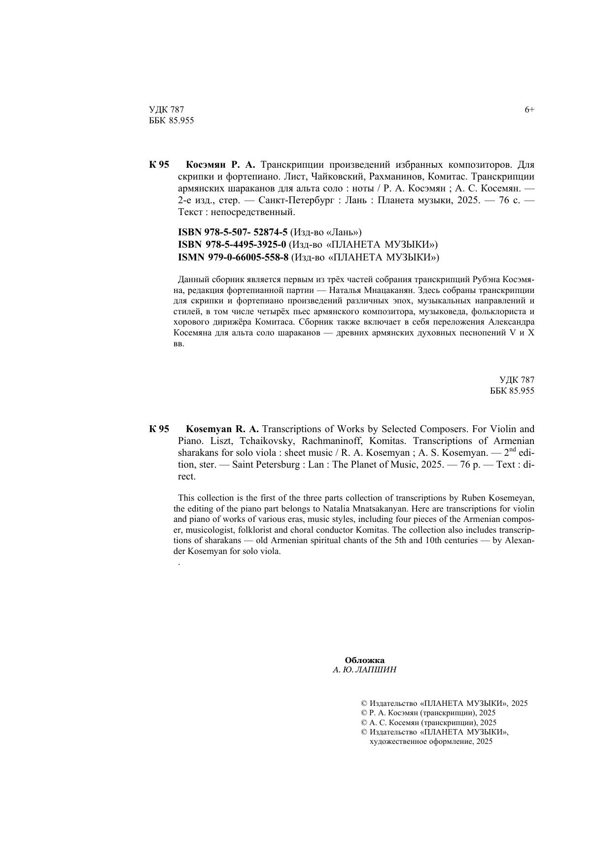 Транскрипции произведений избранных композиторов. Для скрипки и фортепиано. Лист, Чайковский, Рахманинов, Комитас