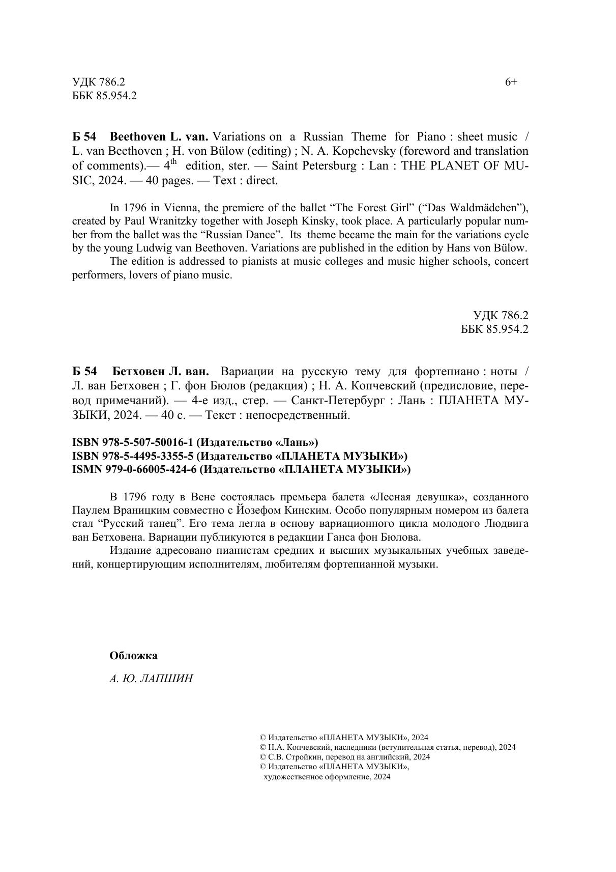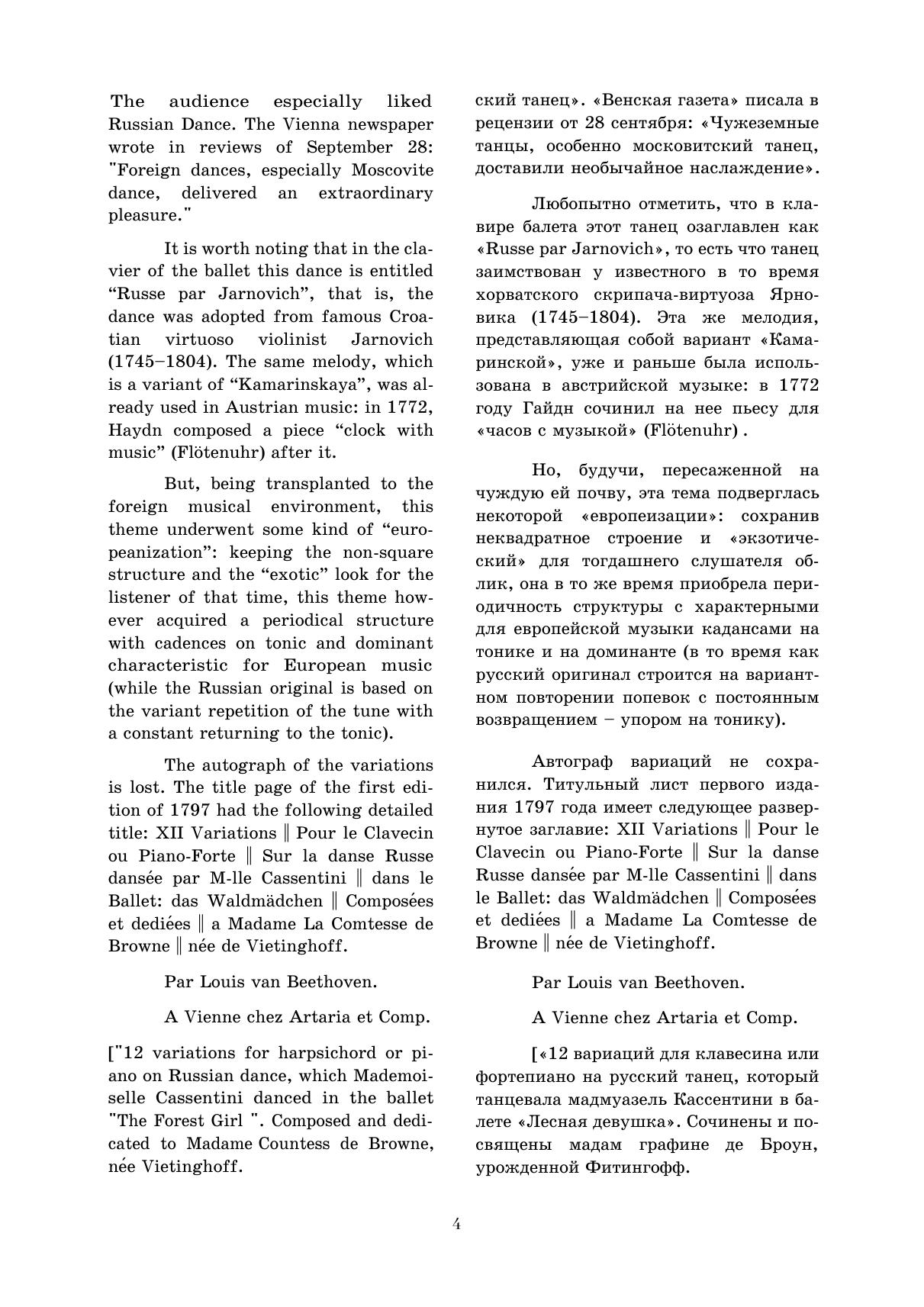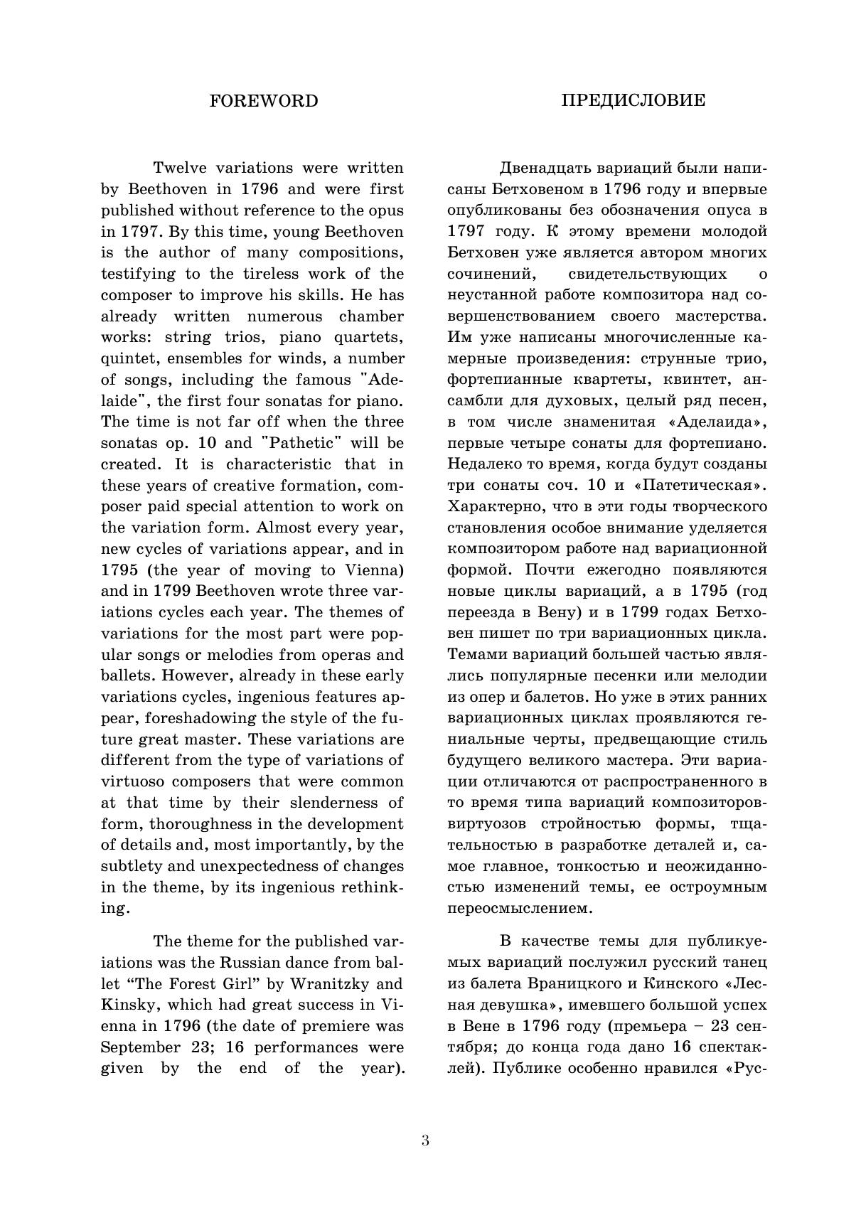 В 1796 году в Вене состоялась премьера балета Лесная девушка, созданного Паулем Враницким совместно с Йозефом Кинским. Особо популярным номером из балета стал Русский танец. Его тема легла в основу вариационного цикла молодого Людвига ван Бетховена. Вариации публикуются в редакции Ганса фон Бюлова. Издание адресовано пианистам средних и высших музыкальных учебных заведений, концертирующим исполнителям, любителям фортепианной музыки.