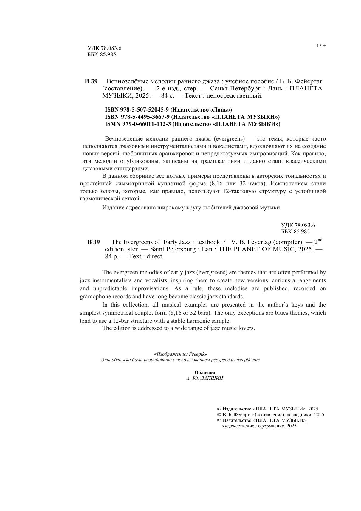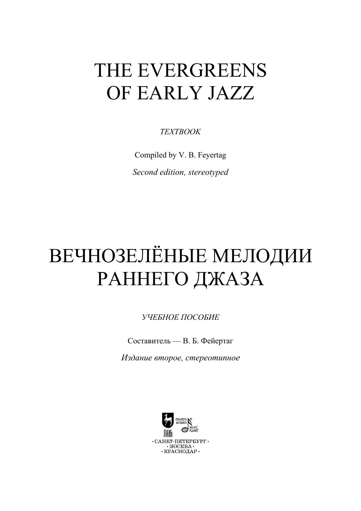 Вечнозеленые мелодии раннего джаза (evergreens) — это темы, которые часто исполняются джазовыми инструменталистами и вокалистами, вдохновляют их на создание новых версий, любопытных аранжировок и непредсказуемых импровизаций. Как правило, эти мелодии опубликованы, записаны на грампластинки и давно стали классическими джазовыми стандартами. В данном сборнике все нотные примеры представлены в авторских тональностях и простейшей симметричной куплетной форме (8,16, или 32 такта). Исключением стали только блюзы, которые, как правило, используют 12-титактовую структуру с устойчивой гармонической сеткой.