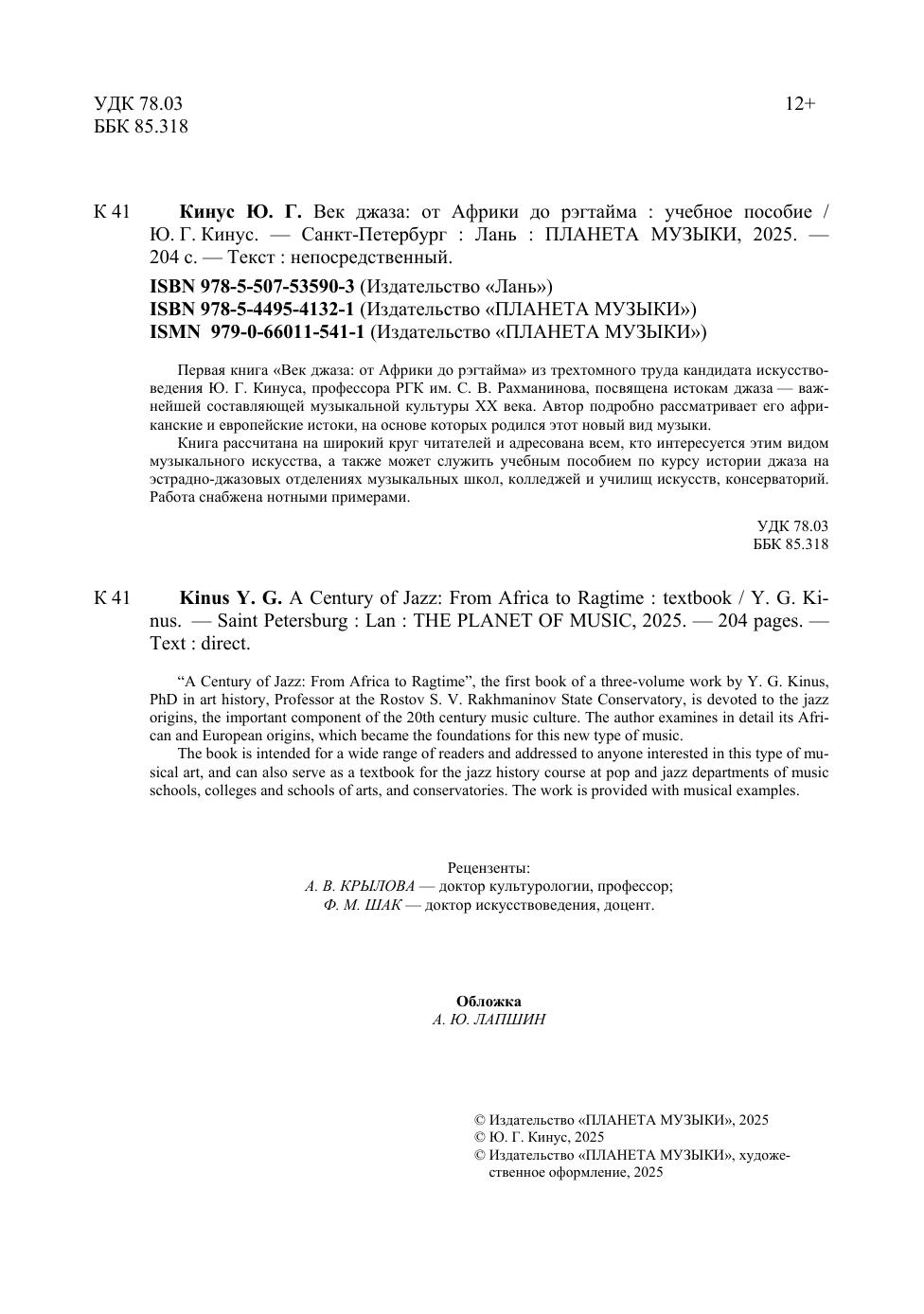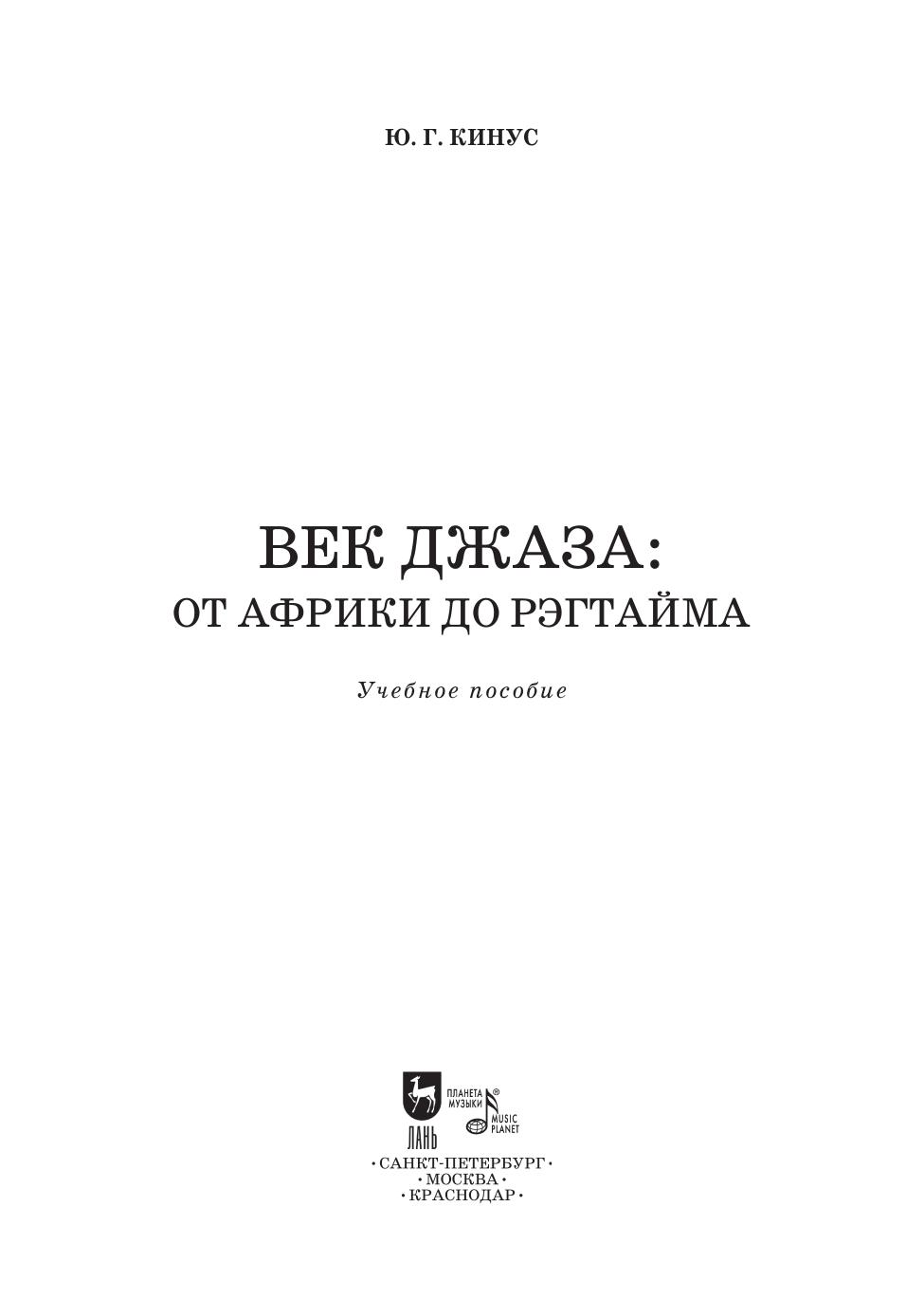 Первая книга «Век джаза: от Африки до рэгтайма» из трёхтомного труда кандидата искусствоведения Ю. Г. Кинуса, профессора РГК им. С. В. Рахманинова, посвящена истокам джаза – важнейшей составляющей музыкальной культуры ХХ века. Автор подробно рассматривает его африканские и европейские истоки, на основе которых родился этот новый вид музыки. Книга рассчитана на широкий круг читателей и будет интересна всем, кто интересуется этим видом музыкального искусства, а также может служить учебным пособием по курсу истории джаза на эстрадно-джазовых отделениях музыкальных школ, колледжей и училищ искусств, а также консерваторий. Работа снабжена нотными примерами. “A Century of Jazz: From Africa to Ragtime”, the first book of a three-volume work by Y. G. Kinus, PhD in art history, Professor at the Rostov S. V. Rakhmaninov State Conservatory, is devoted to the jazz origins, the important component of the 20th century music culture. The author examines in detail its African and European origins, which became the foundations for this new type of music. The book is intended for a wide range of readers and addressed to anyone interested in this type of musical art, and can also serve as a textbook for the jazz history course at pop and jazz departments of music schools, colleges and schools of arts, and conservatories. The work is provided with musical examples.