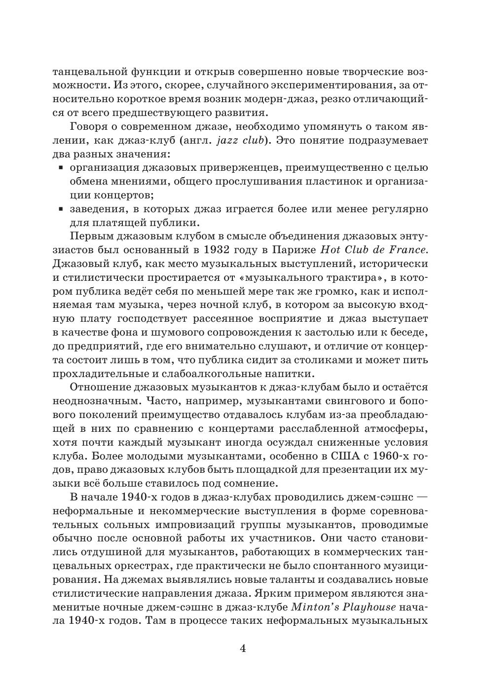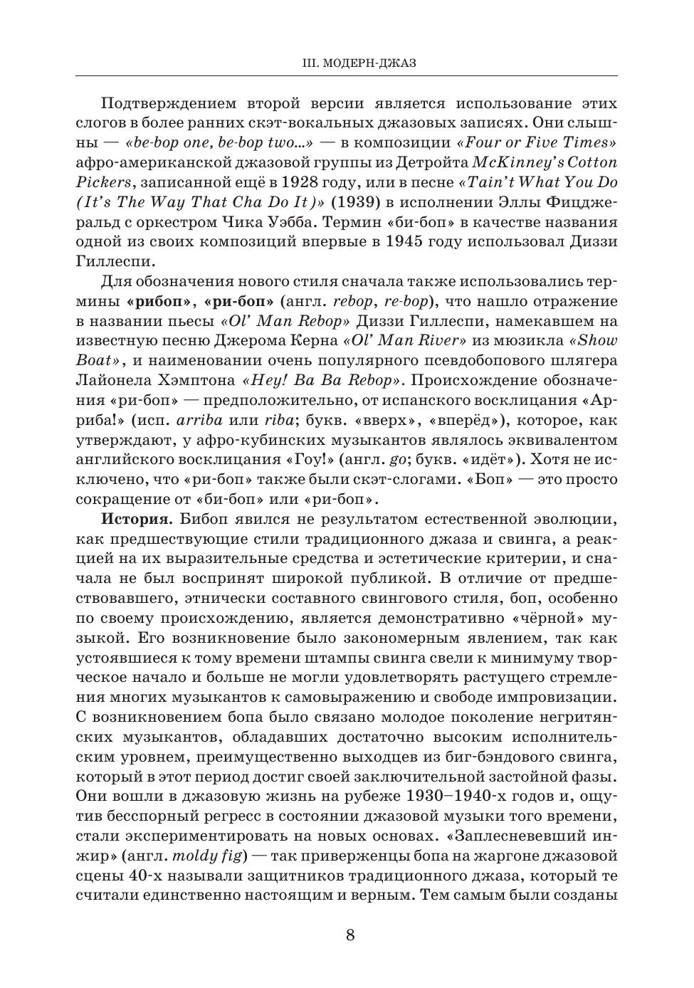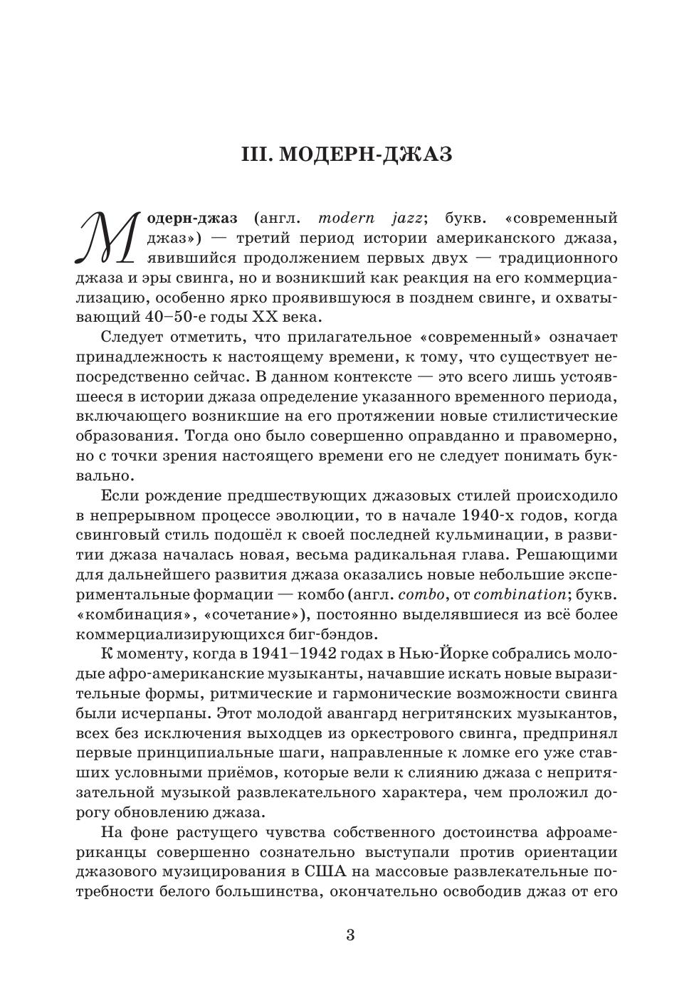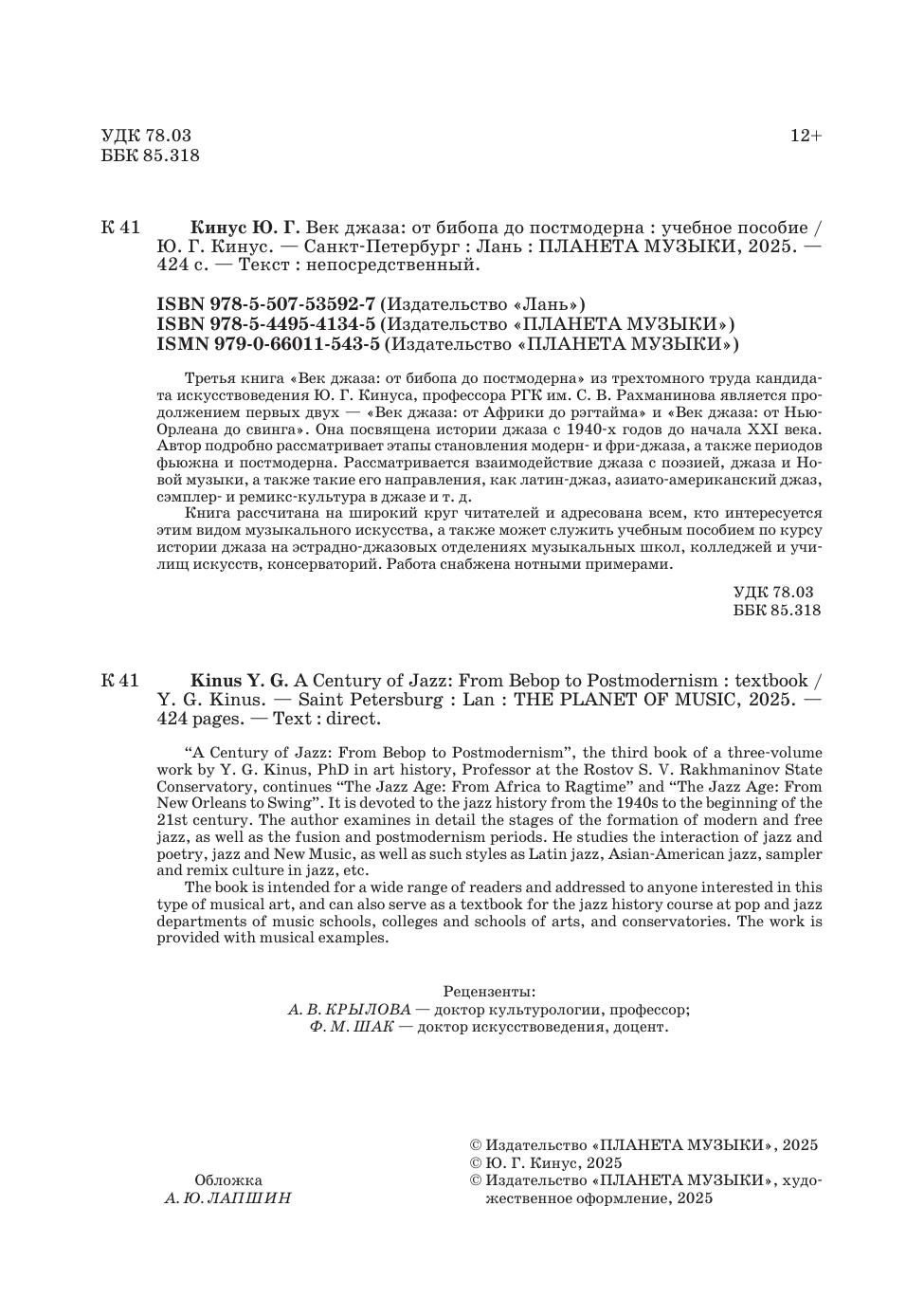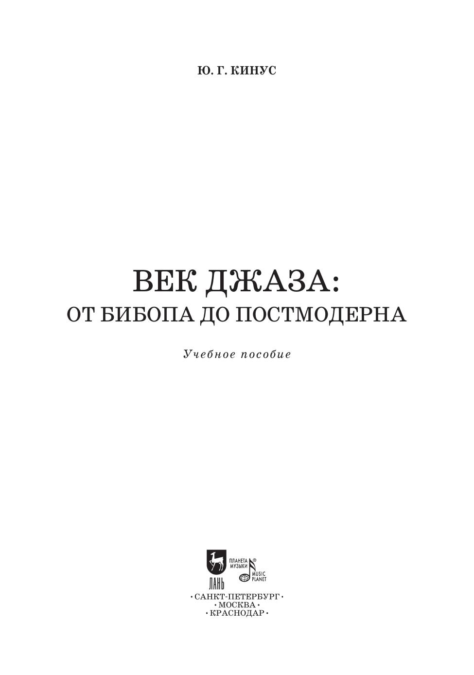 Третья книга «Век джаза: от бибопа до постмодерна» из трёхтомного труда кандидата искусствоведения Ю. Г. Кинуса, профессора РГК им. С. В. Рахманинова является продолжением первых двух – «Век джаза: от Африки до рэгтайма» и «Век джаза: от Нью-Орлеана до свинга». Она посвящена истории джаза с 1940-х годов до начала XXI века. Автор подробно рассматривает этапы становления модерн- и фри-джаза, а также периодов фьюжна и постмодерна. Рассматривается взаимодействие джаза с поэзией, джаза и Новой музыки, а также такие его направления, как латин-джаз, азиато-американский джаз, сэмплер- и ремикс-культура в джазе и т. д. Книга рассчитана на широкий круг читателей и будет интересна всем, кто интересуется этим видом музыкального искусства, а также может служить учебным пособием по курсу истории джаза на эстрадно-джазовых отделениях музыкальных школ, колледжей и училищ искусств, а также консерваторий. Работа снабжена нотными примерами. “A Century of Jazz: From Bebop to Postmodernism”, the third book of a three-volume work by Y. G. Kinus, PhD in art history, Professor at the Rostov S. V. Rakhmaninov State Conservatory, continues “The Jazz Age: From Africa to Ragtime” and “The Jazz Age: From New Orleans to Swing”. It is devoted to the jazz history from the 1940s to the beginning of the 21st century. The author examines in detail the stages of the formation of modern and free jazz, as well as the fusion and postmodernism periods. He studies the interaction of jazz and poetry, jazz and New Music, as well as such styles as Latin jazz, Asian-American jazz, sampler and remix culture in jazz, etc. The book is intended for a wide range of readers and addressed to anyone interested in this type of musical art, and can also serve as a textbook for the jazz history course at pop and jazz departments of music schools, colleges and schools of arts, and conservatories. The work is provided with musical examples.