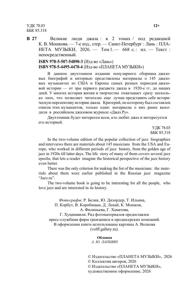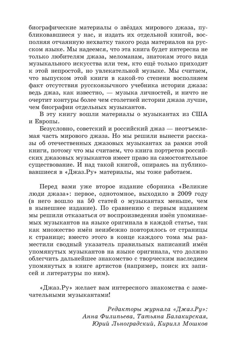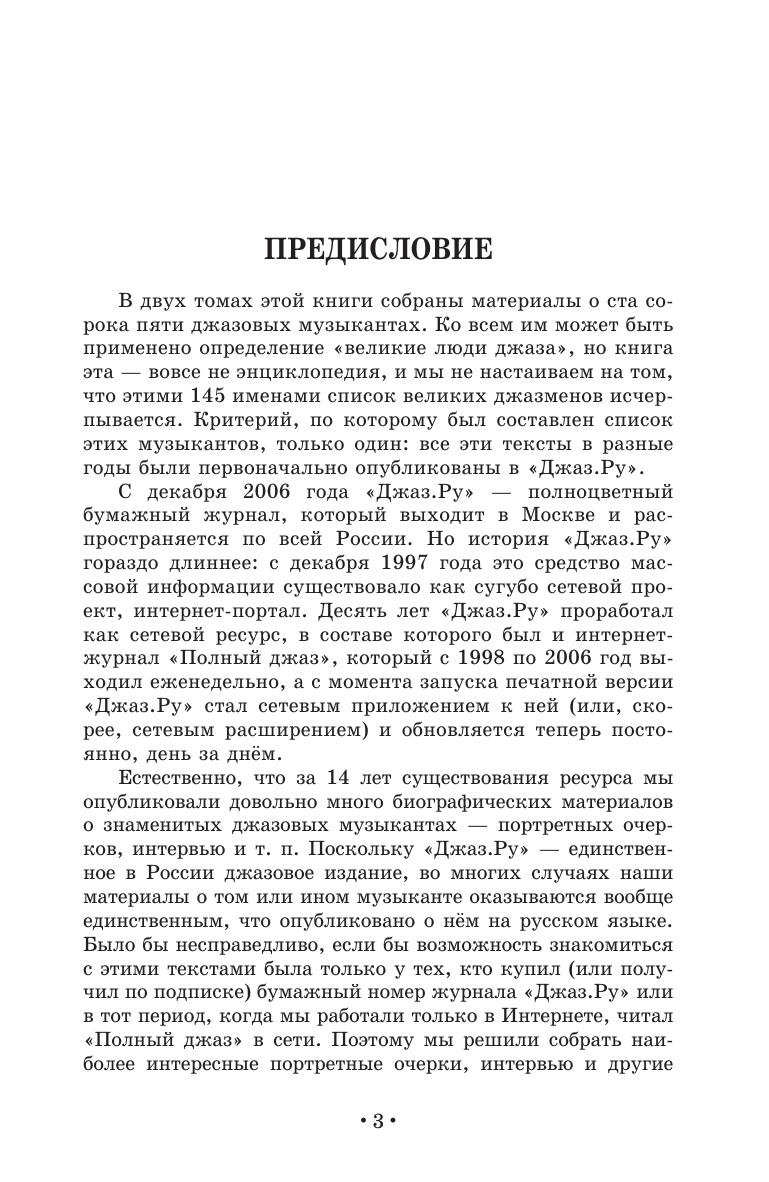 В данном двухтомном издании популярного сборника джазовых биографий и интервью представлены материалы о 145 джазовых музыкантах из США и Европы самых разных периодов джазовой истории — от эры первого расцвета джаза в 1920-е гг. до наших дней. У многих история жизни и творчества охватывает сразу несколько эпох, что позволяет читателю ещё лучше представить себе историческую перспективу истории джаза. Критерий, по которому был составлен список этих музыкантов, только один: материалы о них ранее выходили в российском джазовом журнале «Джаз.Ру». Двухтомник будет интересен всем, кто любит джаз и интересуется его историей. In the two-volume edition of the popular collection of jazz biographies and interviews there are materials about 145 musicians from the USA and Europe, who worked in different periods of jazz history, from the golden age of jazz in 1920-s till latter days. The life story of many of them covers several jazz epochs, that lets a reader imagine the historical perspective of the jazz history even better. There was the only criterion for making the list of the musicians: the materials about them were earlier published in Russian jazz magazine “Jazz.ru”. The two-volume book is going to be interesting for all the people, who love jazz and are interested in its history.