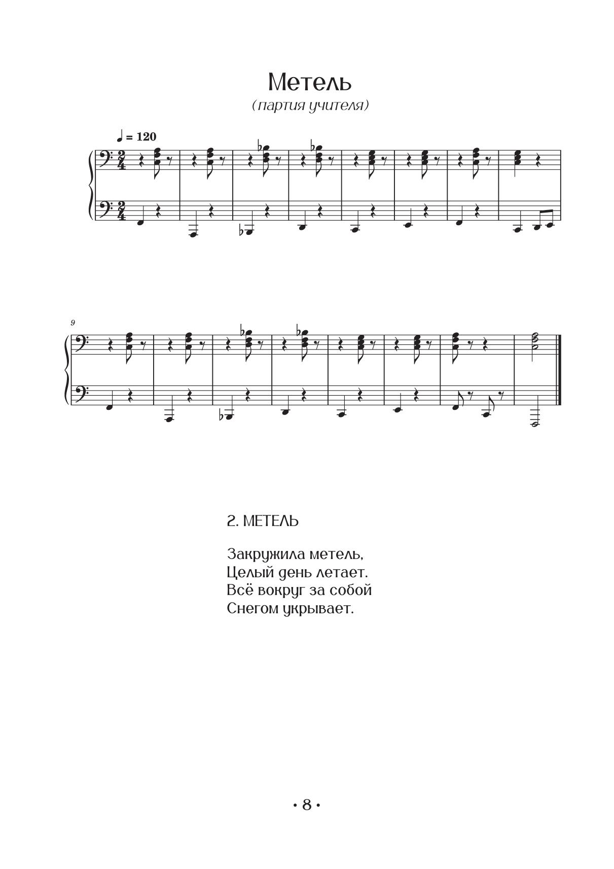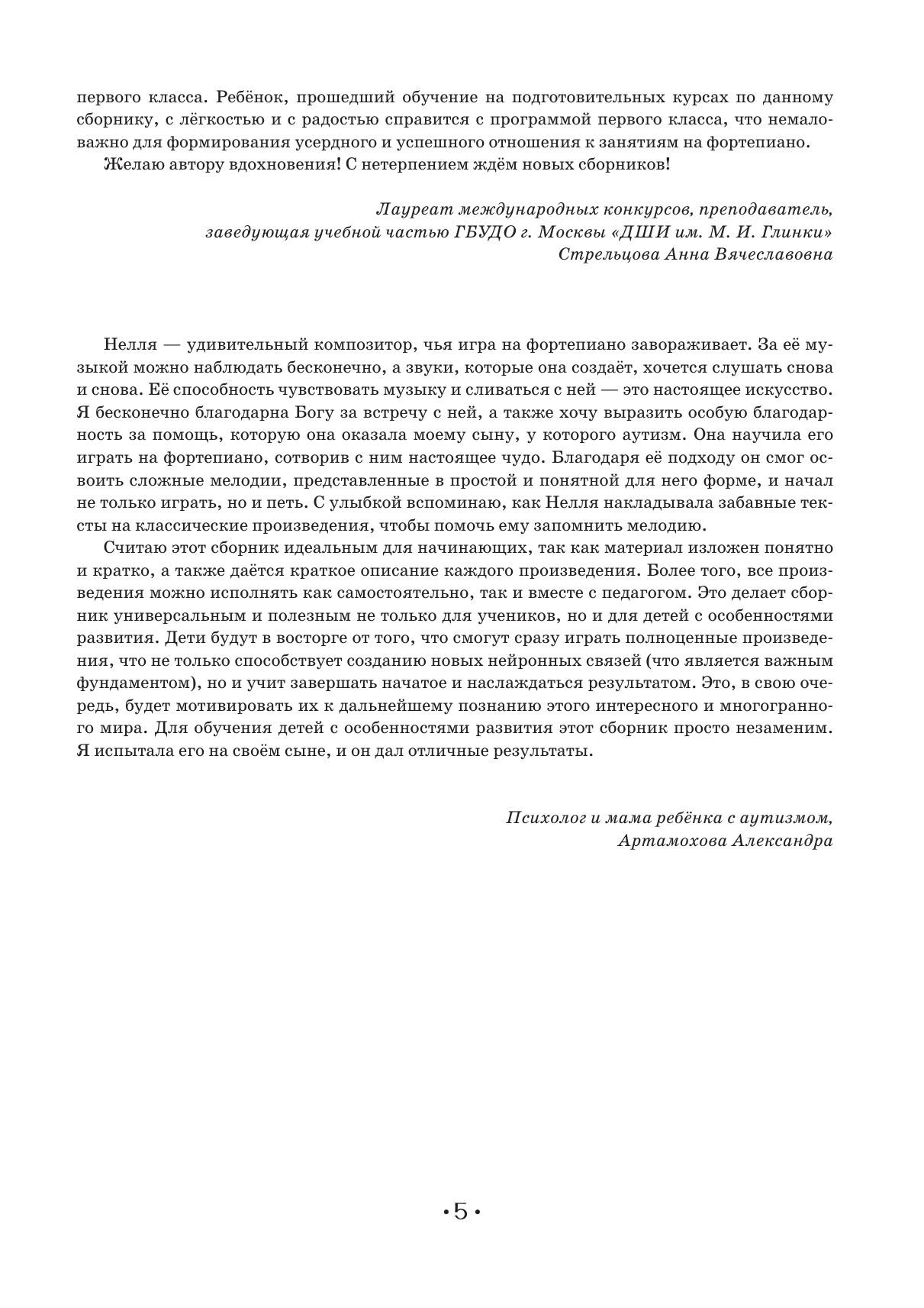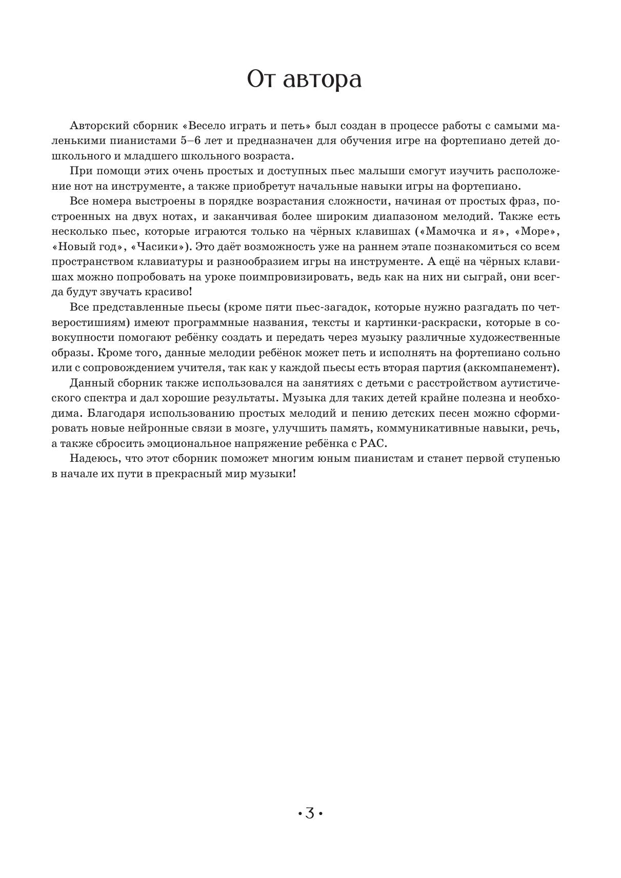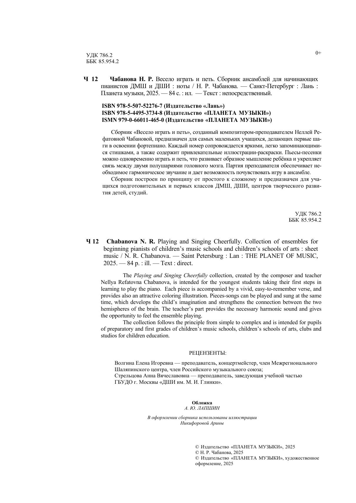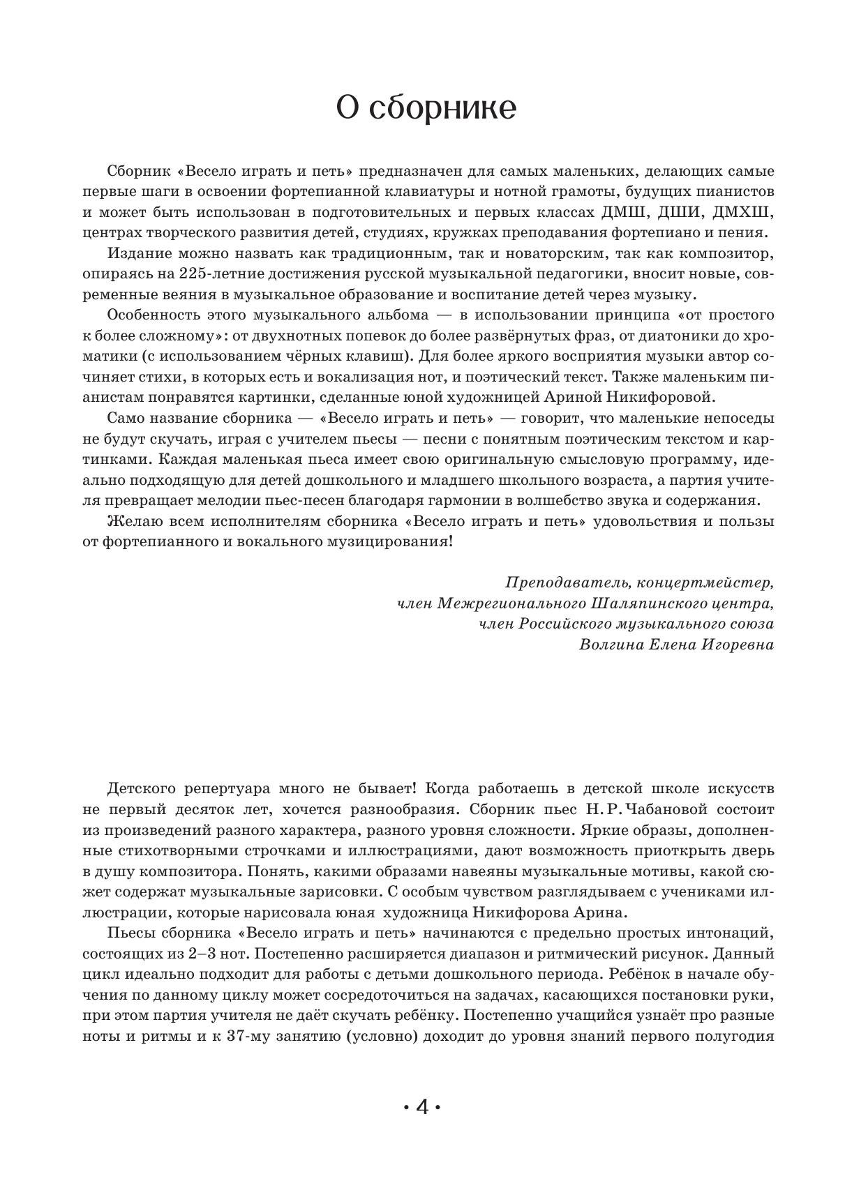 Сборник «Весело играть и петь», созданный композитором-преподавателем Неллей Рефатовной Чабановой, предназначен для самых маленьких учащихся, делающих первые шаги в освоении фортепиано. Каждый номер сопровождается яркими, легко запоминающимися стишками, а также содержит привлекательные иллюстрации-раскраски. Пьесы-песенки можно одновременно играть и петь, что развивает образное мышление ребёнка и укрепляет связь между двумя полушариями головного мозга. Партия преподавателя обеспечивает необходимое гармоническое звучание и дает возможность почувствовать игру в ансамбле. Сборник построен по принципу от простого к сложному и предназначен для учащихся подготовительных и первых классов ДМШ, ДШИ, центров творческого развития детей, студий. The Playing and Singing Cheerfully collection, created by the composer and teacher Nellya Refatovna Chabanova, is intended for the youngest students taking their first steps in learning to play the piano. Each piece is accompanied by a vivid, easy-to-remember verse, and provides also an attractive coloring illustration. Pieces-songs can be played and sung at the same time, which develops the child’s imagination and strengthens the connection between the two hemispheres of the brain. The teacher’s part provides the necessary harmonic sound and gives the opportunity to feel the ensemble playing. The collection follows the principle from simple to complex and is intended for pupils of preparatory and first grades of children’s music schools, children’s schools of arts, clubs and studios for children education.