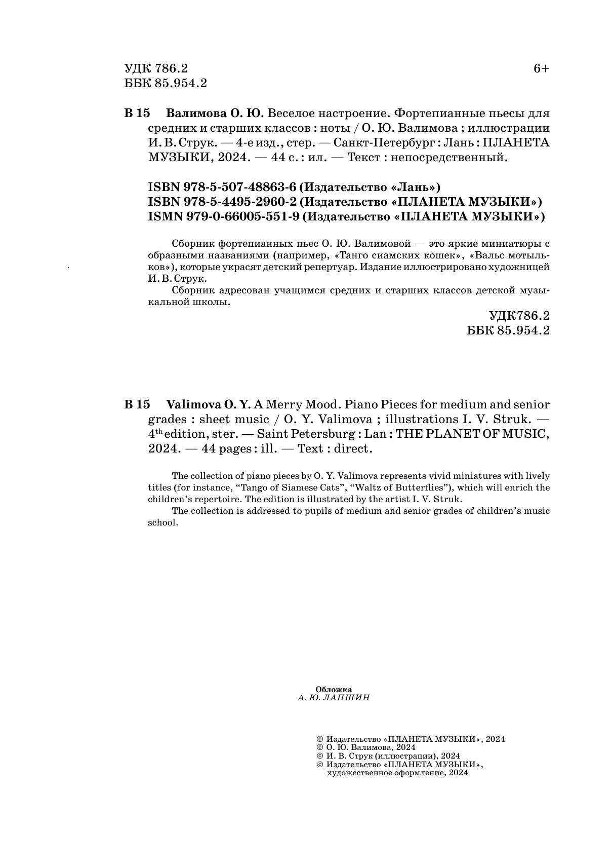 Сборник фортепианных пьес О. Ю. Валимовой - это яркие миниатюры с образными названиями (например, "Танго сиамских кошек", "Вальс мотыльков"), которые украсят детский репертуар. Издание иллюстрировано художницей И. В. Струк. Сборник адресован учащимся средних и старших классов музыкальной школы.