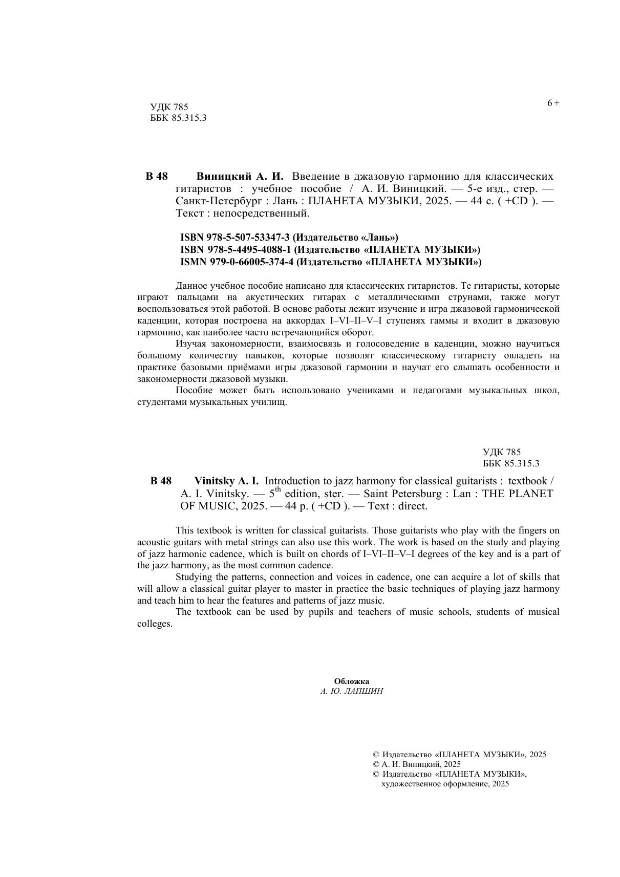 Данное учебное пособие написано для классических гитаристов. Те гитаристы, которые играют пальцами на акустических гитарах с металлическими струнами, также могут воспользоваться этой работой. В основе работы лежит изучение и игра джазовой гармонической каденции, которая построена на аккордах I – VI – II – V – I ступенях гаммы и входит в джазовую гармонию, как наиболее часто встречающийся оборот. Изучая закономерности, взаимосвязь и голосоведение в каденции, можно научиться большому количеству навыков, которые позволят классическому гитаристу овладеть на практике базовыми приёмами игры джазовой гармонии и научат его слышать особенности и закономерности джазовой музыки. Пособие может быть использовано учениками и педагогами музыкальных школ, студентами музыкальных училищ.