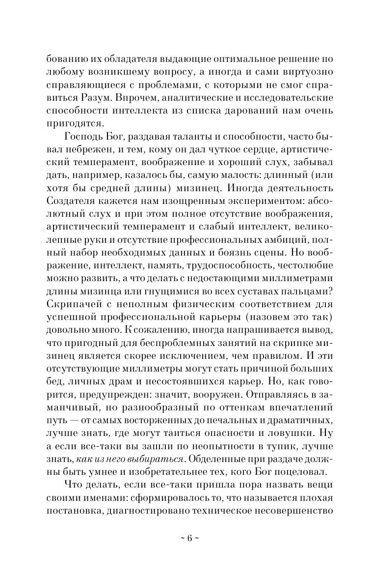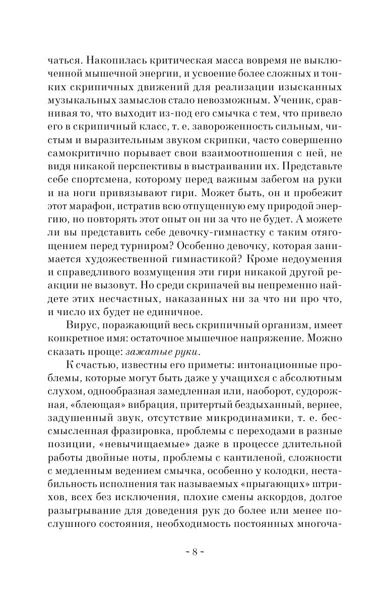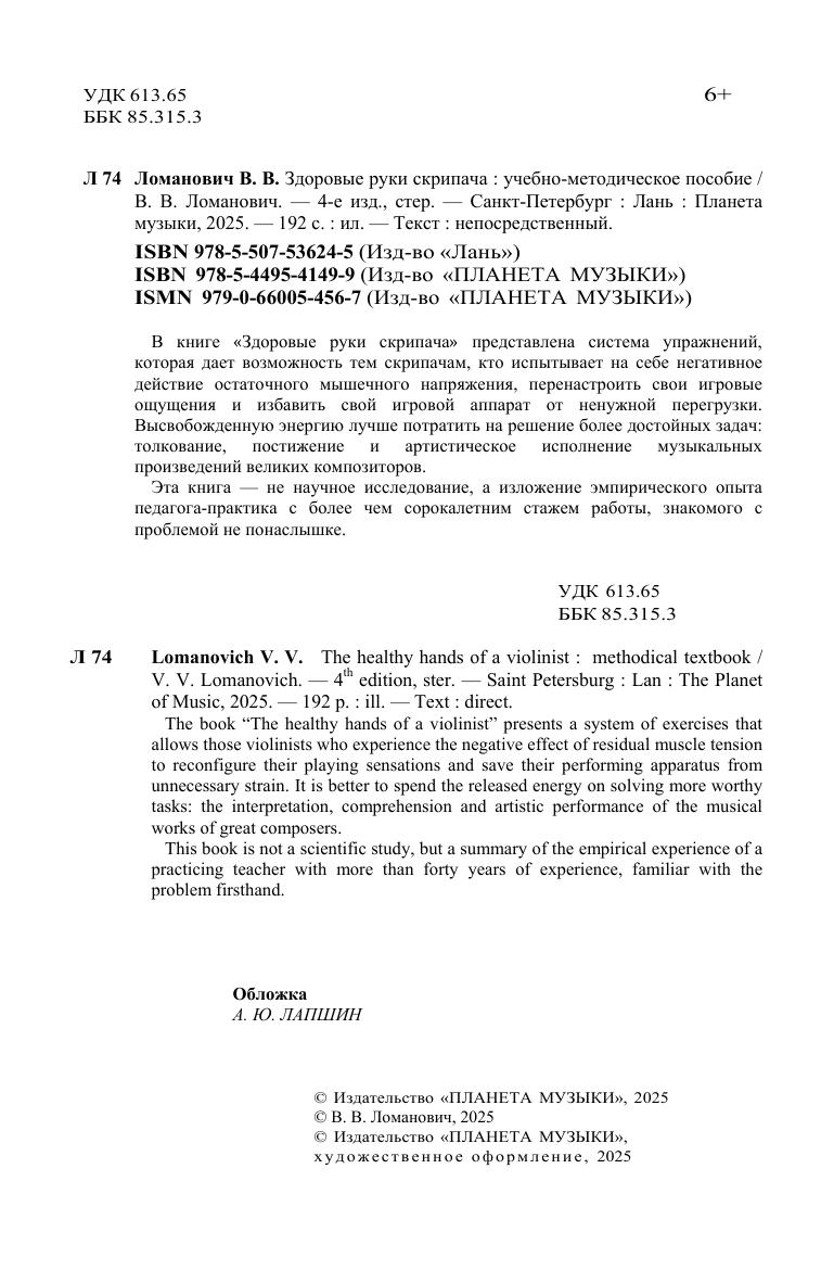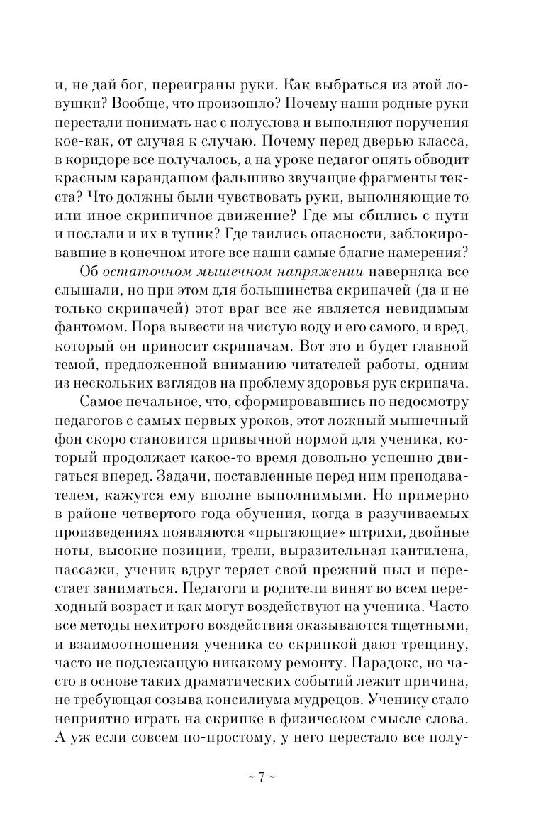 В книге «Здоровые руки скрипача» представлена система упражнений, которая дает возможность тем скрипачам, кто испытывает на себе негативное действие остаточного мышечного напряжения перенастроить свои игровые ощущения и избавить свой игровой аппарат от ненужной перегрузки. Высвобожденную энергию лучше потратить на решение более достойных задач: толкование, постижение и артистическое исполнение музыкальных произведений великих композиторов. Эта книга – не научное исследование, а изложение эмпирического опыта педагога-практика с более чем сорокалетним стажем работы, знакомого с проблемой не понаслышке. The book “The healthy hands of a violinist” presents a system of exercises that allows those violinists who experience the negative effect of residual muscle tension to reconfigure their playing sensations and save their performing apparatus from unnecessary strain. It is better to spend the released energy on solving more worthy tasks: the interpretation, comprehension and artistic performance of the musical works of great composers. This book is not a scientific study, but a summary of the empirical experience of a practicing teacher with more than forty years of experience, familiar with the problem firsthand.