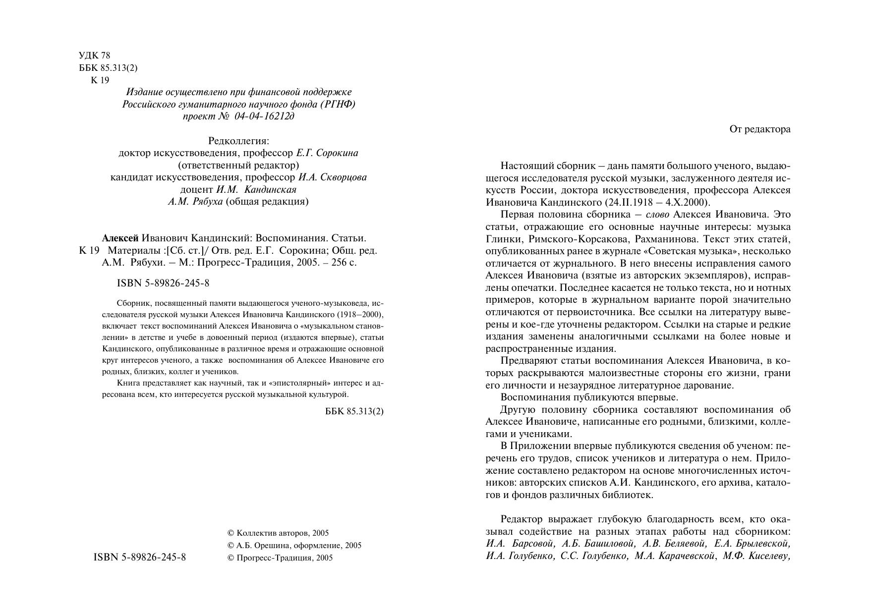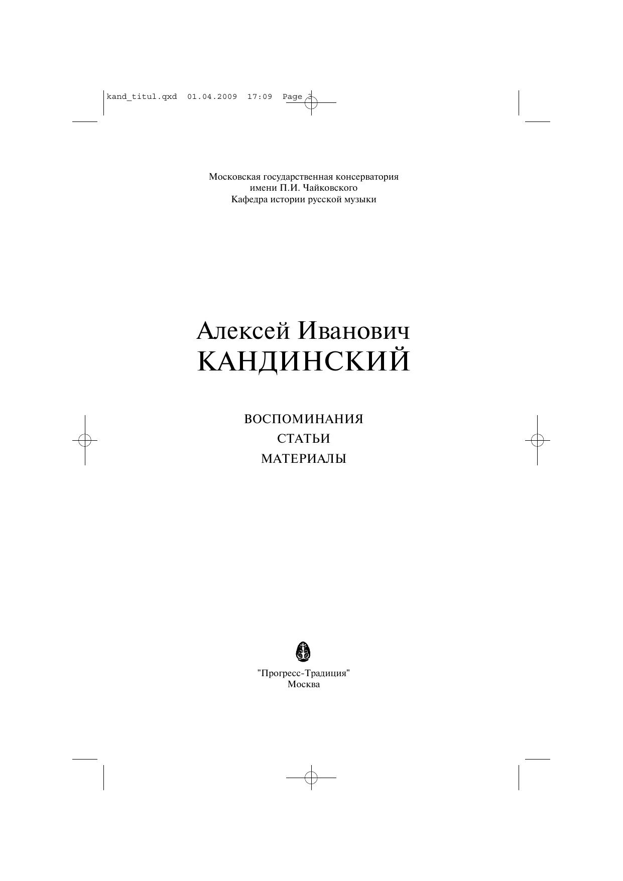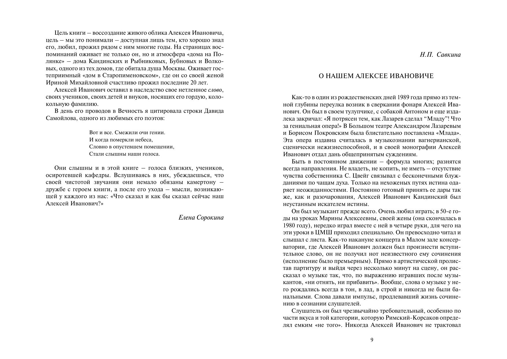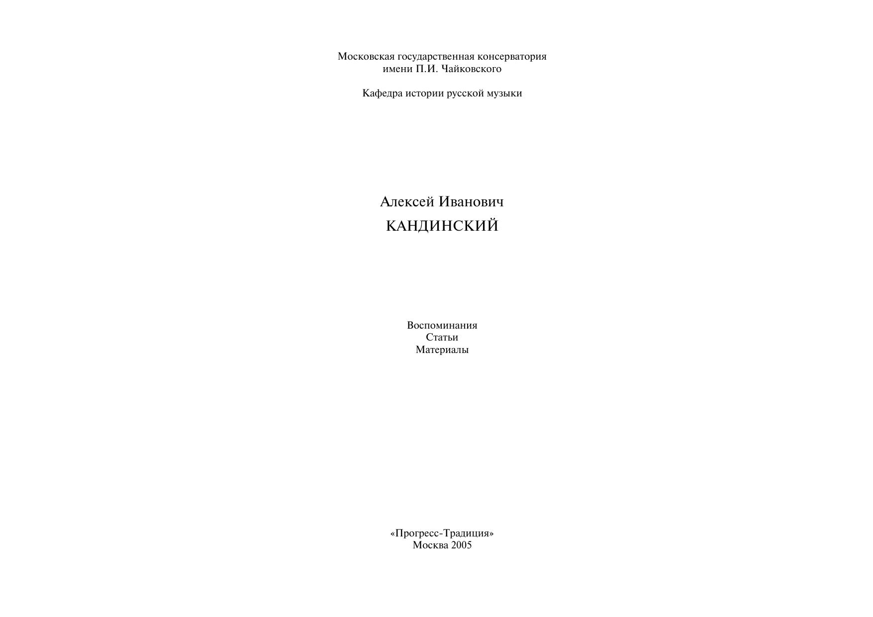 Сборник, посвященный памяти выдающегося ученого-музыковеда, исследователя русской музыки Алексея Ивановича Кандинского (1918–2000), включает текст воспоминаний Алексея Ивановича о "музыкальном становлении" в детстве и учебе в довоенный период (издаются впервые), статьи Кандинского, опубликованные в различное время и отражающие основной круг интересов ученого, а также воспоминания об Алексее Ивановиче его родных, близких, коллег и учеников.
