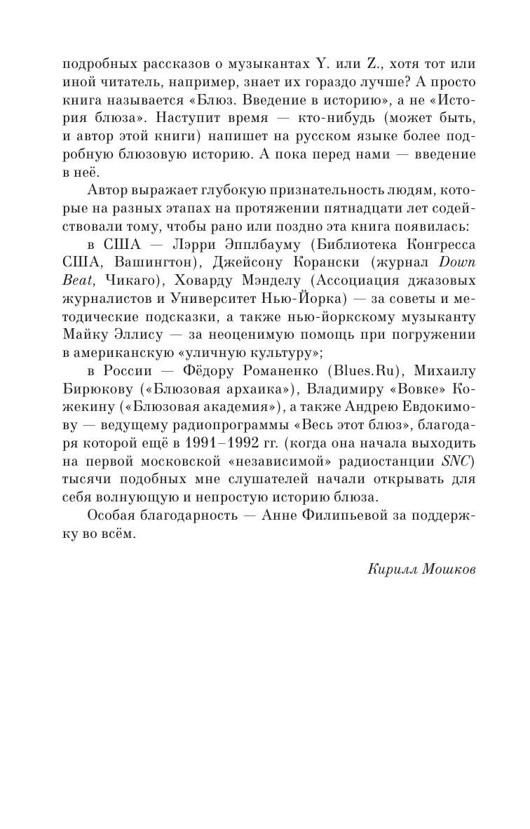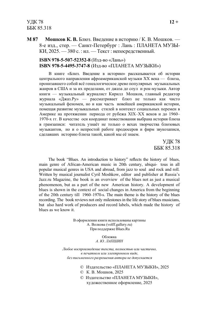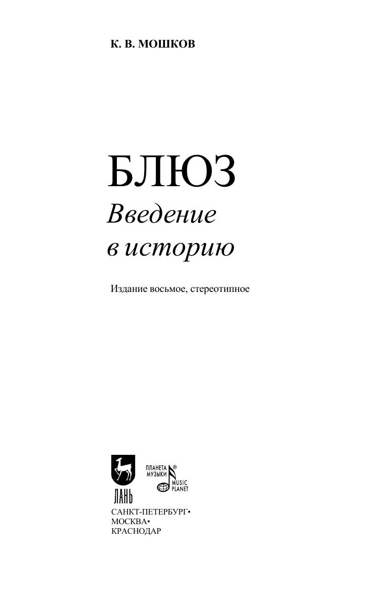 В книге «Блюз. Введение в историю» рассказывается об истории центрального направления афроамериканской музыки XX века — блюза, пронизавшего собой всё генеалогическое древо популярных музыкальных жанров в США и за их пределами, от джаза до соул и рок-музыки. Автор книги — музыкальный журналист Кирилл Мошков, главный редактор журнала «Джаз.Ру» — рассматривает блюз не только как чисто музыкальный феномен, но и как часть новейшей американской истории, помещая развитие музыкальных стилей в контекст социальных перемен в Америке на протяжении периода от рубежа XIX–XX веков и до 1960–1970-х гг. В качестве оси координат повествования выбрана история блюза в грамзаписи: читатель узнаёт не только о вехах творчества блюзовых музыкантов, но и о непростой работе продюсеров и фирм звукозаписи, сделавших историю блюза такой, какой мы её знаем. The book “Blues. An introduction to history” reflects the history of blues, main genre of African-American music in 20th century, ubiquitous in all popular musical genres in USA and abroad, from jazz to soul and rock and roll. Written by musical journalist Cyril Moshkow, editor and publisher at Russia’s Jazz.ru Magazine, the book is an overview of the blues not as just a musical phenomenon, but as a part of the new American history. A development of blues is shown in the context of social changes in America from the beginning of the 20th century till 1960–1970-s. The main theme is the history of the blues recording. The book reviews not only milestones in the life story of blues musicians, but also hard work of producers and record labels, which made the history of blues as we know it.