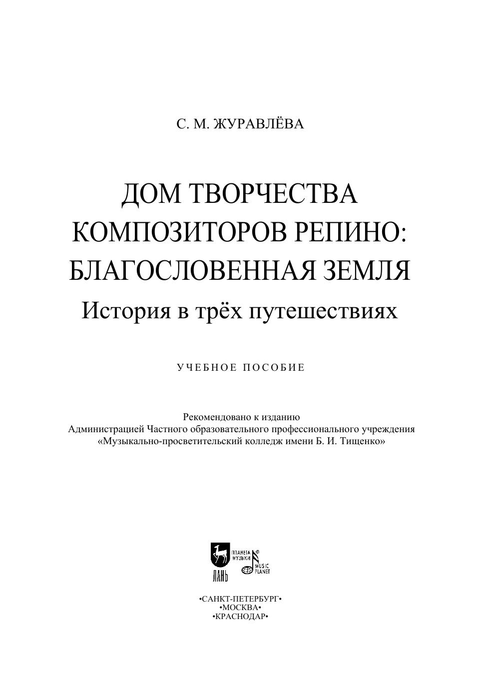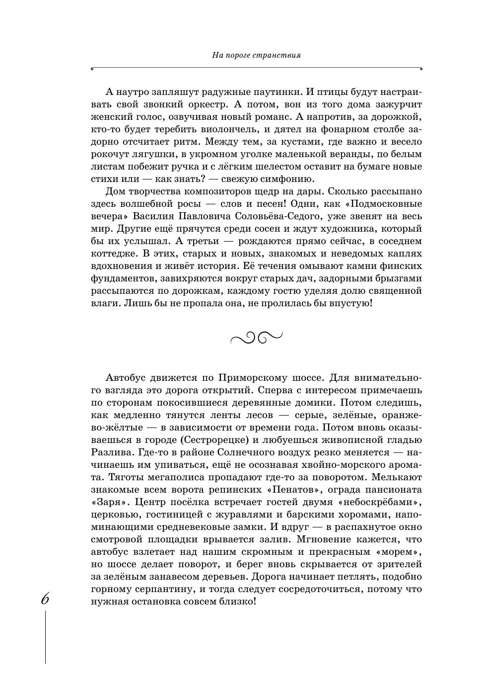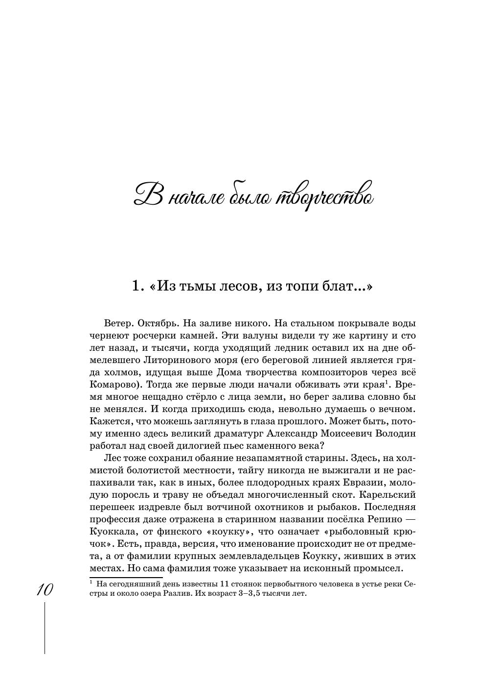 Эта книга – о «творческом посёлке», расположенном в 50 километрах от Санкт-Петербурга, на самой границе Репино и Комарово. «Посёлку» меньше века, но кажется, его история вмещает тысячелетия – так много гениев перебывало в этом удивительном месте! И хотя площадь репинского Дома творчества композиторов легко измерить шагами за один день, такого путешествия для него мало. Нужно ещё как минимум три: во времени, по волнам памяти и дорогам искусства. Поэтому книга включает и наукообразное изложение фактов, и творчество, и прямую речь героев: музыкантов, поэтов, художников, живых и ушедших. Многие интервью, фотографии и архивные материалы публикуются впервые. Издание адресовано студентам творческих вузов, краеведам, деятелям искусства и широкому кругу читателей, интересующихся историей и культурой России. Подготовлено к 80-летию Дома творчества композиторов Репино. This book is about a “creative village” located 50 kilometers from St. Petersburg, on the very border of Repino and Komarovo. The “village” is less than a century old, but its history seems to span thousands of years, while so many geniuses have visited this wonderful place! Although the area of The Repino House of the Composers’ Creativity can be easily measured in steps of a one day walk, such a journey is not enough for it. It needs at least three more journeys: a journey in time, a journey along the waves of memory and a journey through the paths of art. Therefore, the book includes both a scholar presentation of facts, and creative pieces, and direct speech of the characters: musicians, poets, artists, living and deceased. Many interviews, photographs and archival content are published for the first time. The edition is addressed to students of higher schools of arts, local historians, artists and a wide range of readers interested in the history and culture of Russia. It is devoted to the 80th anniversary of the Repino House of the Composers’ Creativity.