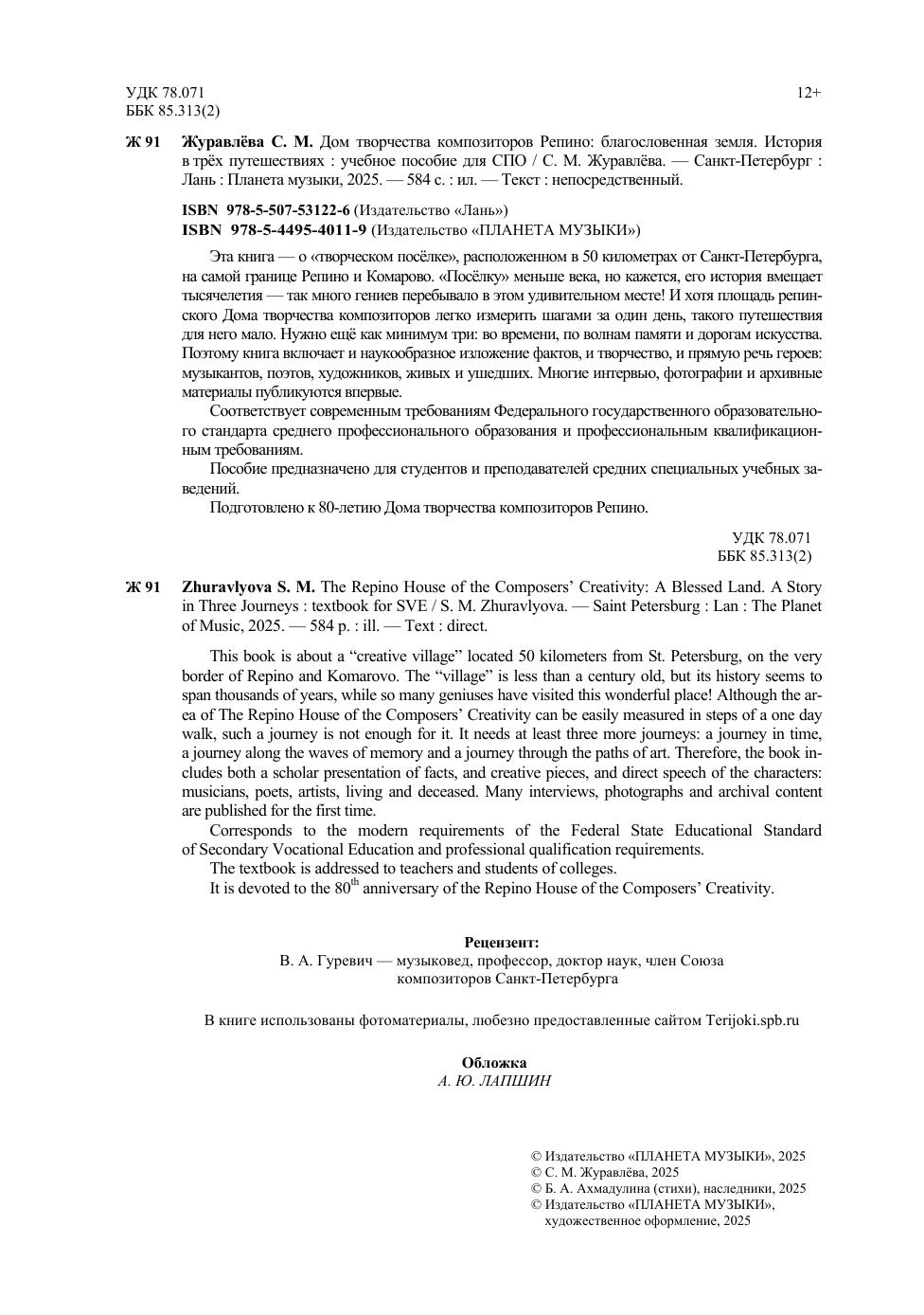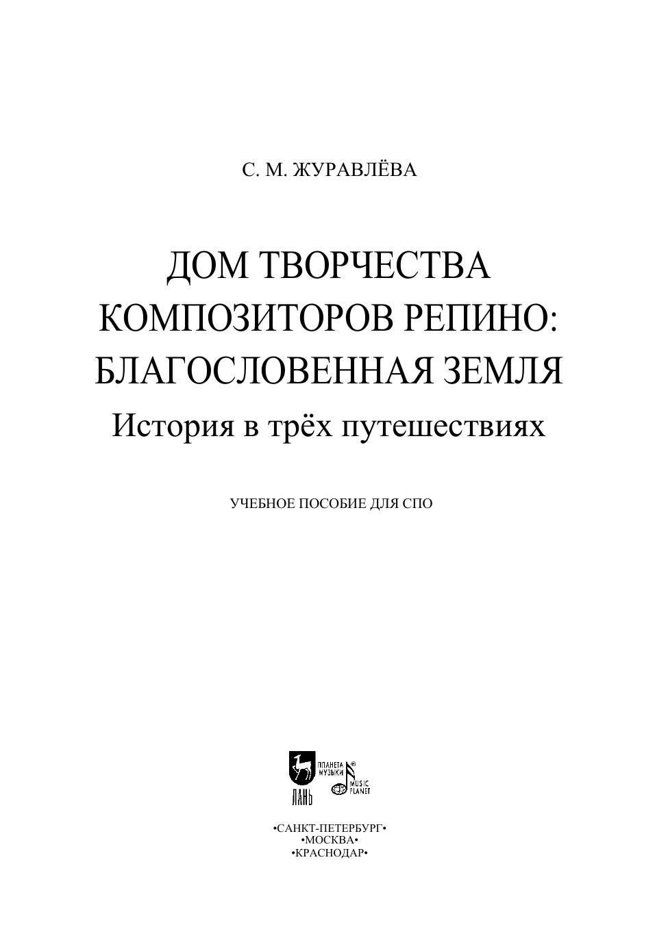 Эта книга – о «творческом посёлке», расположенном в 50 километрах от Санкт-Петербурга, на самой границе Репино и Комарово. «Посёлку» меньше века, но кажется, его история вмещает тысячелетия – так много гениев перебывало в этом удивительном месте! И хотя площадь репинского Дома творчества композиторов легко измерить шагами за один день, такого путешествия для него мало. Нужно ещё как минимум три: во времени, по волнам памяти и дорогам искусства. Поэтому книга включает и наукообразное изложение фактов, и творчество, и прямую речь героев: музыкантов, поэтов, художников, живых и ушедших. Многие интервью, фотографии и архивные материалы публикуются впервые. Соответствует современным требованиям Федерального государственного образовательного стандарта среднего профессионального образования и профессиональным квалификационным требованиям. Пособие предназначено для студентов и преподавателей средних специальных учебных заведений. Подготовлено к 80-летию Дома творчества композиторов Репино. This book is about a “creative village” located 50 kilometers from St. Petersburg, on the very border of Repino and Komarovo. The “village” is less than a century old, but its history seems to span thousands of years, while so many geniuses have visited this wonderful place! Although the area of The Repino House of the Composers’ Creativity can be easily measured in steps of a one day walk, such a journey is not enough for it. It needs at least three more journeys: a journey in time, a journey along the waves of memory and a journey through the paths of art. Therefore, the book includes both a scholar presentation of facts, and creative pieces, and direct speech of the characters: musicians, poets, artists, living and deceased. Many interviews, photographs and archival content are published for the first time. Corresponds to the modern requirements of the Federal State Educational Standard of Secondary Vocational Education and professional qualification requirements. The textbook is addressed to teachers and students of colleges. It is devoted to the 80th anniversary of the Repino House of the Composers’ Creativity.