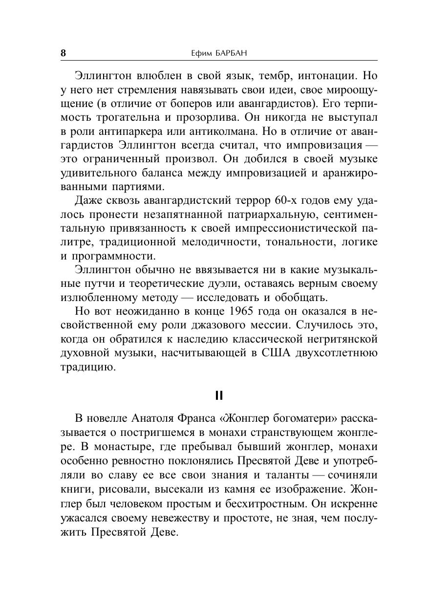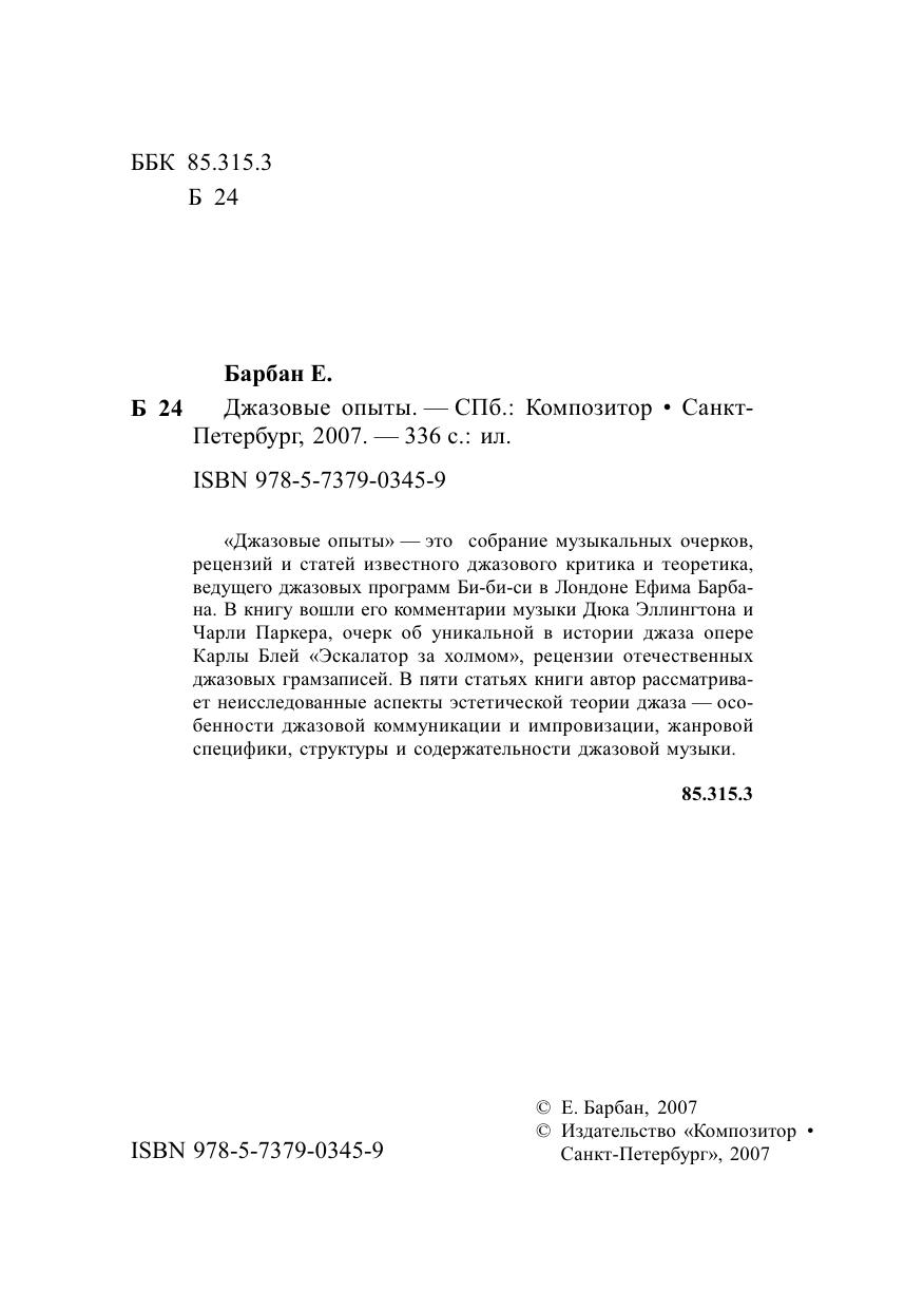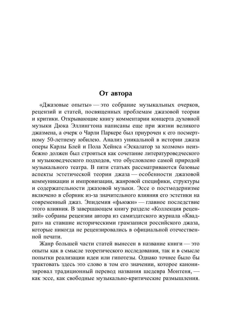 «Джазовые опыты» — это собрание музыкальных очерков, рецензий и статей известного джазового критика и теоретика, ведущего джазовых программ Би-би-си в Лондоне Ефима Барбана. В книгу вошли его комментарии музыки Дюка Эллингтона иЧарли Паркера, очерк об уникальной в истории джаза опере Карлы Блей «Эскалатор за холмом», рецензии отечественных джазовых грамзаписей. В пяти статьях книги автор рассматривает неисследованные аспекты эстетической теории джаза — особенности джазовой коммуникации и импровизации, жанровой специфики, структуры и содержательности джазовой музыки.