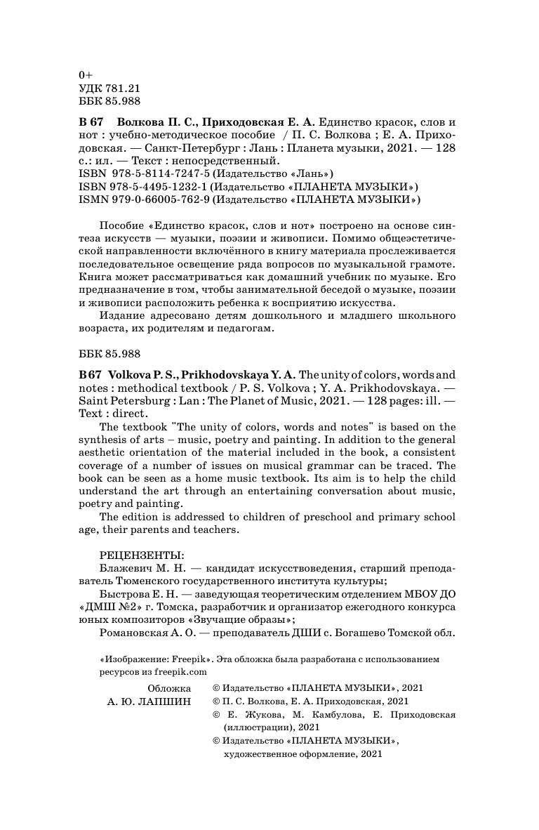 The textbook "The unity of colors, words and notes" is based on the synthesis of arts – music, poetry and painting. In addition to the general aesthetic orientation of the material included in the book, a consistent coverage of a number of issues on musical grammar can be traced. The book can be seen as a home music textbook. Its aim is to help the child understand the art through an entertaining conversation about music, poetry and painting.