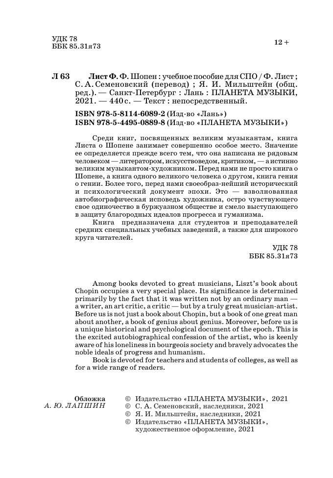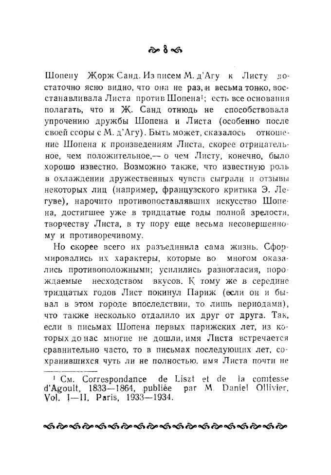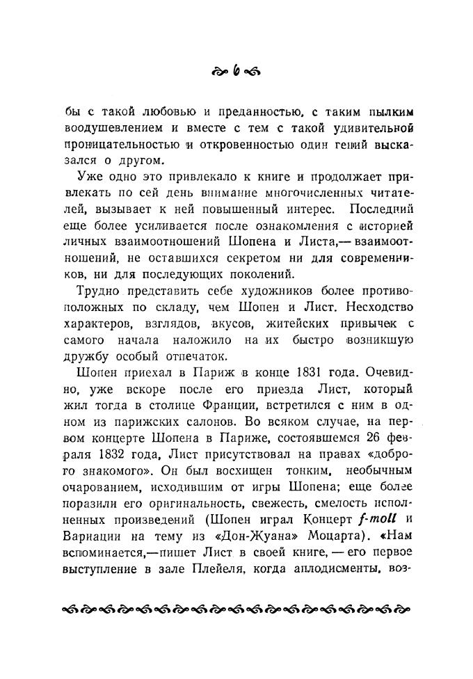 Среди книг, посвященных великим музыкантам, книга Листа о Шопене занимает совершенно особое место. Значение ее определяется прежде всего тем, что она написана не рядовым человеком — литератором, искусствоведом, критиком, — а истинно великим музыкантом-художником. Перед нами не просто книга о Шопене, а книга одного великого человека о другом, книга гения о гении. Более того, перед нами своеобраз-нейший исторический и психологический документ эпохи. Это — взволнованная автобиографическая исповедь художника, остро чувствующего свое одиночество в буржуазном обществе и смело выступающего в защиту благородных идеалов прогресса и гуманизма.