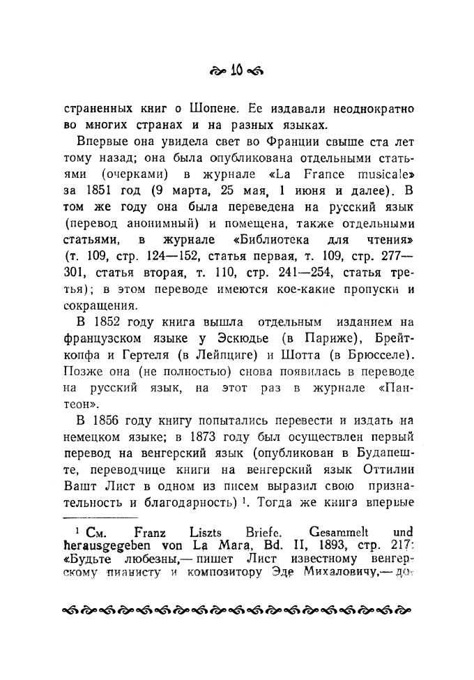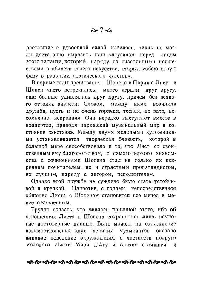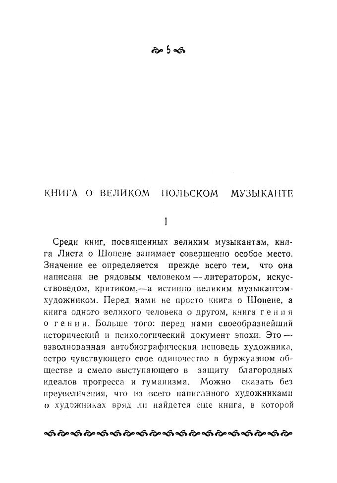 Среди книг, посвященных великим музыкантам, книга Листа о Шопене занимает совершенно особое место. Значение ее определяется прежде всего тем, что она написана не рядовым человеком — литератором, искусствоведом, критиком, — а истинно великим музыкантом-художником. Перед нами не просто книга о Шопене, а книга одного великого человека о другом, книга гения о гении. Более того, перед нами своеобраз-нейший исторический и психологический документ эпохи. Это — взволнованная автобиографическая исповедь художника, остро чувствующего свое одиночество в буржуазном обществе и смело выступающего в защиту благородных идеалов прогресса и гуманизма.