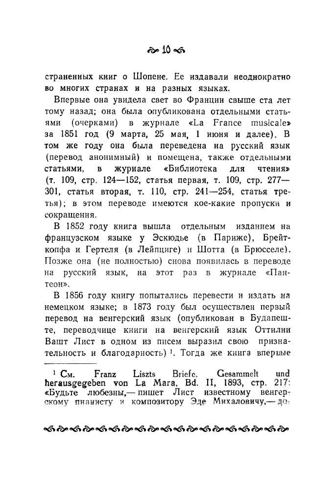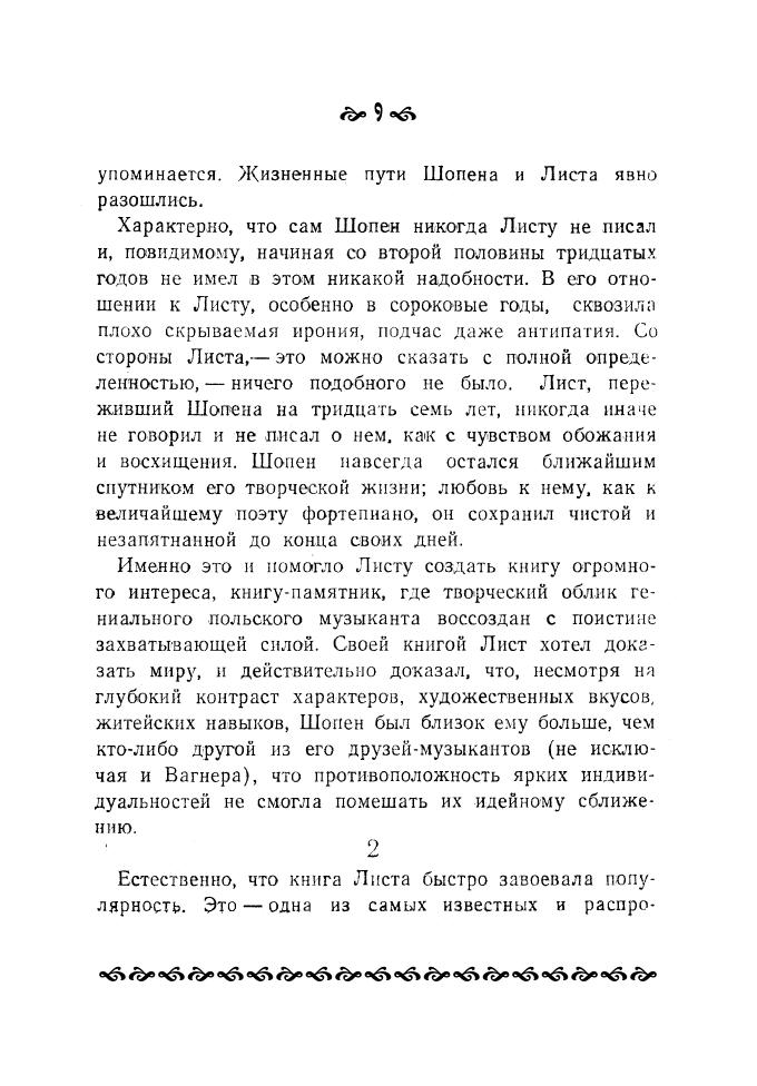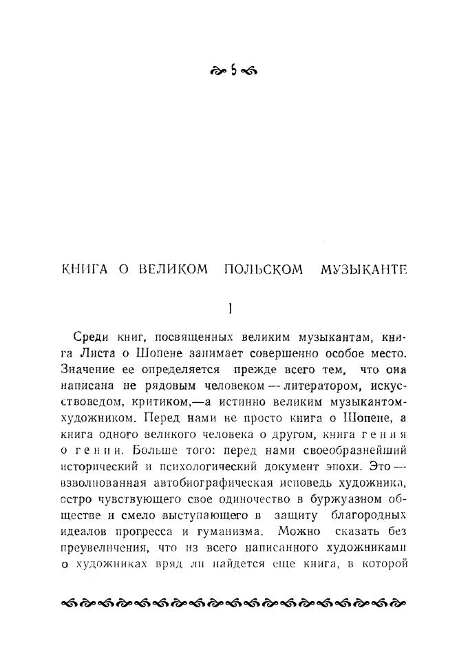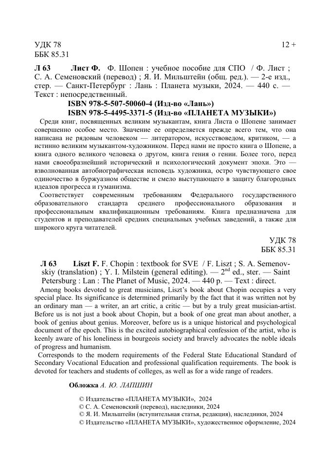 Среди книг, посвященных великим музыкантам, книга Листа о Шопене занимает совершенно особое место. Значение ее определяется прежде всего тем, что она написана не рядовым человеком — литератором, искусствоведом, критиком, — а истинно великим музыкантом-художником. Перед нами не просто книга о Шопене, а книга одного великого человека о другом, книга гения о гении. Более того, перед нами своеобраз-нейший исторический и психологический документ эпохи. Это — взволнованная автобиографическая исповедь художника, остро чувствующего свое одиночество в буржуазном обществе и смело выступающего в защиту благородных идеалов прогресса и гуманизма. Книга предназначена для студентов и преподавателей средних специальных учебных заведений, а также для широкого круга читателей. Among books devoted to great musicians, Liszt’s book about Chopin occupies a very special place. Its significance is determined primarily by the fact that it was written not by an ordinary man — a writer, an art critic, a critic — but by a truly great musician-artist. Before us is not just a book about Chopin, but a book of one great man about another, a book of genius about genius. Moreover, before us is a unique historical and psychological document of the epoch. This is the excited autobiographical confession of the artist, who is keenly aware of his loneliness in bourgeois society and bravely advocates the noble ideals of progress and humanism. Book is devoted for teachers and students of colleges, as well as for a wide range of readers.