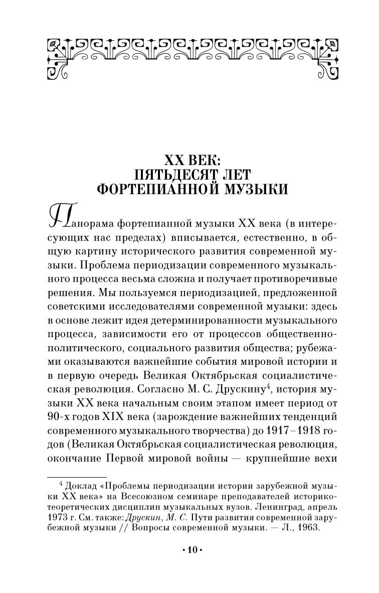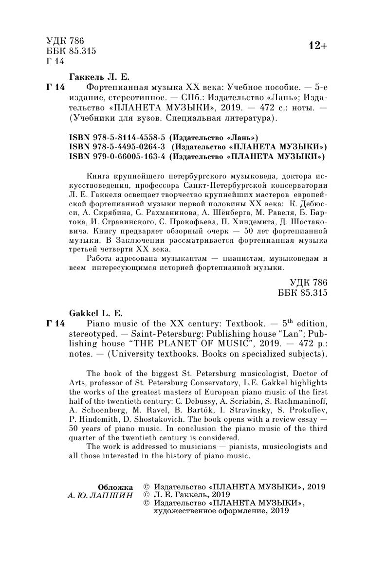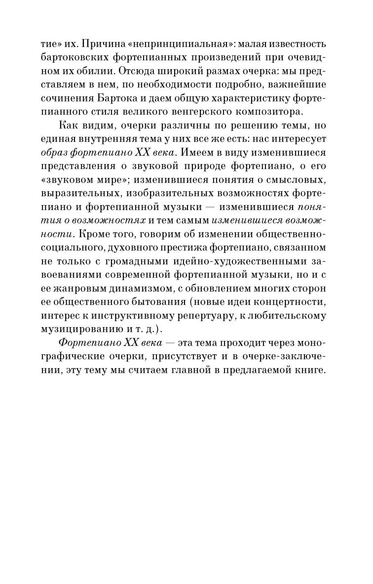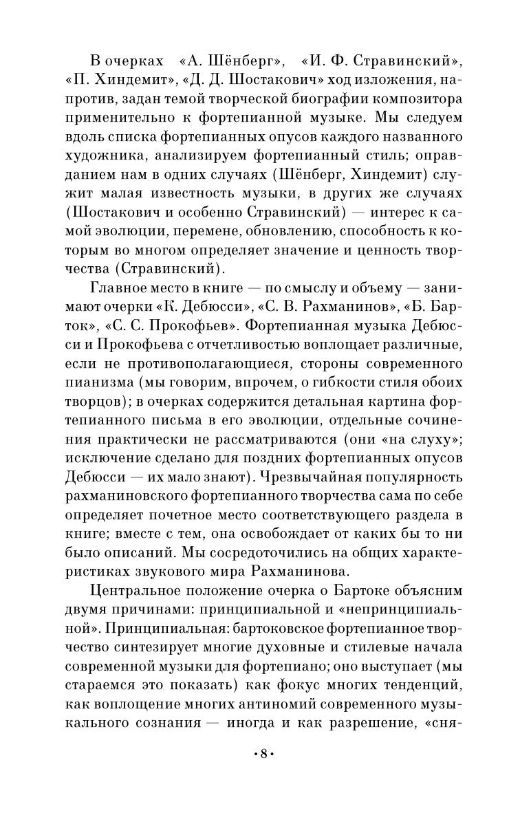 Книга крупнейшего петербургского музыковеда, доктора искусствоведения, профессора Санкт-Петербургской консерватории, Л. Е. Гаккеля освящает творчество крупнейших мастеров европейской фортепианной музыки первой половины ХХ века: К. Дебюсси, А . Скрябина, С. Рахманинова, А. Шенберга, М. Равеля, Б. Бартока, И. Стравинского, С. Прокофьева , П . Хиндемита, Д. Шостаковича. Книгу предваряет обзорный очерк - 50 лет фортепианной музыки. В Заключении рассматривается фортепианная музыка третьей четверти ХХ века.