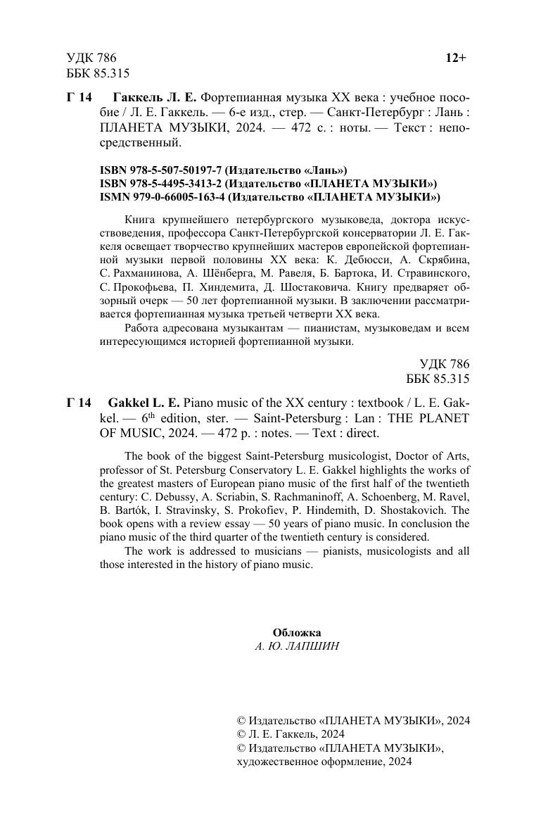 Книга крупнейшего петербургского музыковеда, доктора искусствоведения, профессора Санкт-Петербургской консерватории, Л. Е. Гаккеля освящает творчество крупнейших мастеров европейской фортепианной музыки первой половины ХХ века: К. Дебюсси, А . Скрябина, С. Рахманинова, А. Шенберга, М. Равеля, Б. Бартока, И. Стравинского, С. Прокофьева , П . Хиндемита, Д. Шостаковича. Книгу предваряет обзорный очерк - 50 лет фортепианной музыки. В Заключении рассматривается фортепианная музыка третьей четверти ХХ века. Работа адресована музыкантам-пианистам, музыковедам и всем, интересующимся историей фортепианной музыки.