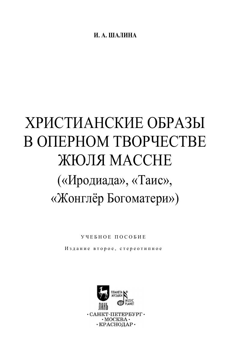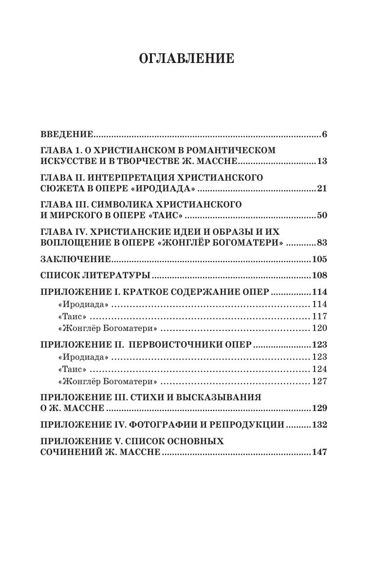Книга основывается на материале трёх опер Ж. Массне (1842–1912), которые наиболее тесно связаны с христианскими идеями и образами: «Иродиада» (1881), «Таис» (1892), «Жонглёр Богоматери» (1900). Эти произведения являются одной из творческих удач композитора. Христианская тематика в операх Массне не только вписывается в религиозные искания во французском искусстве рубежа XIX—XX веков, но и предвосхищает тенденции французского музыкального театра ХХ века. Книга содержит большое количество нотных примеров и иллюстраций. Данная книга может быть адресована студентам и педагогам музыкальных вузов и ссузов, в первую очередь специализирующихся на музыковедении, композиции, актёрском мастерстве, а также любителям музыки.