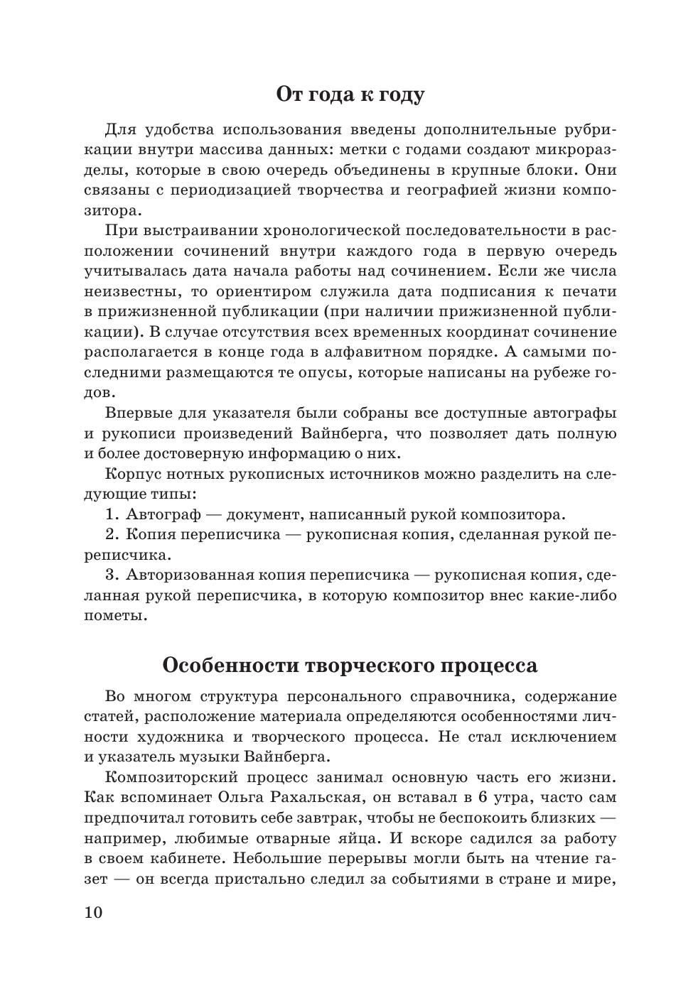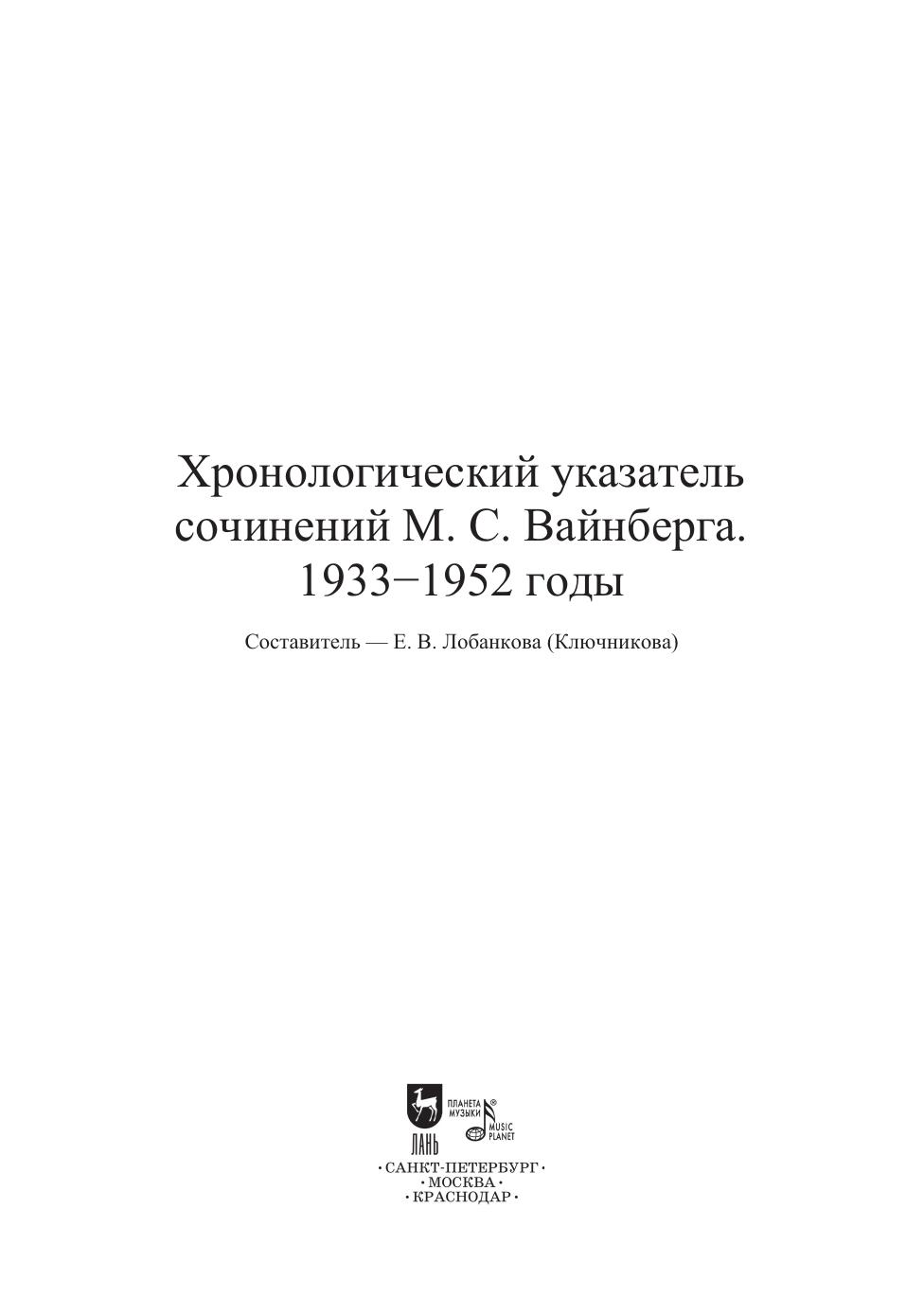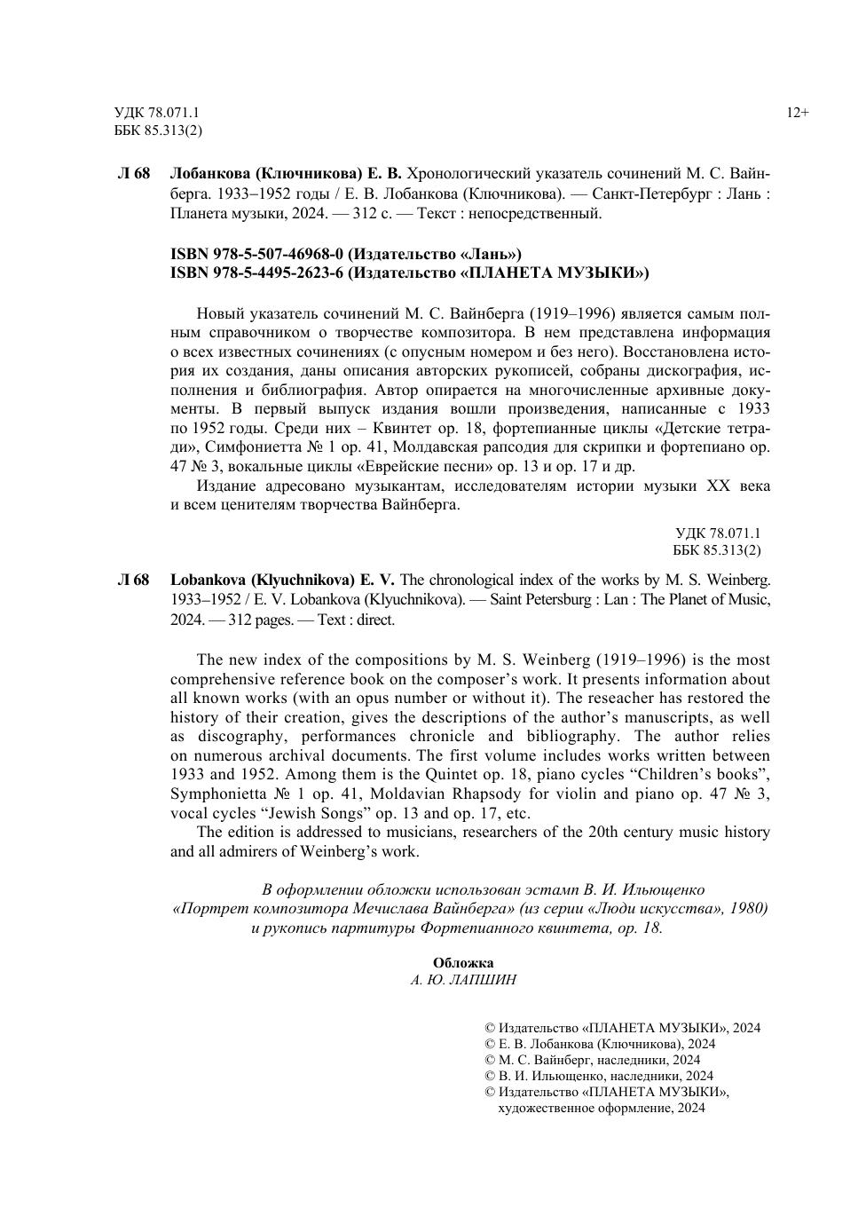Новый указатель сочинений М. С. Вайнберга (1919–1996) является самым полным справочником о творчестве композитора. В нем представлена информация о всех известных сочинениях (с опусным номером и без него). Восстановлена история их создания, даны описания авторских рукописей, собраны дискография, исполнения и библиография. Автор опирается на многочисленные архивные документы. В первый выпуск издания вошли произведения, написанные с 1933 по 1952 годы. Среди них – Квинтет ор. 18, фортепианные циклы «Детские тетради», Симфониетта № 1 ор. 41, Молдавская рапсодия для скрипки и фортепиано ор. 47 № 3, вокальные циклы «Еврейские песни» ор. 13 и ор. 17 и др. Издание адресовано музыкантам, исследователям истории музыки XX века и всем ценителям творчества Вайнберга. The new index of the compositions by M. S. Weinberg (1919–1996) is the most comprehensive reference book on the composer’s work. It presents information about all known works (with an opus number or without it). The reseacher has restored the history of their creation, gives the descriptions of the author’s manuscripts, as well as discography, performances chronicle and bibliography. The author relies on numerous archival documents. The first volume includes works written between 1933 and 1952. Among them is the Quintet op. 18, piano cycles “Children’s books”, Symphonietta № 1 op. 41, Moldavian Rhapsody for violin and piano op. 47 № 3, vocal cycles “Jewish Songs” op. 13 and op. 17, etc. The edition is addressed to musicians, researchers of the 20th century music history and all admirers of Weinberg’s work.
