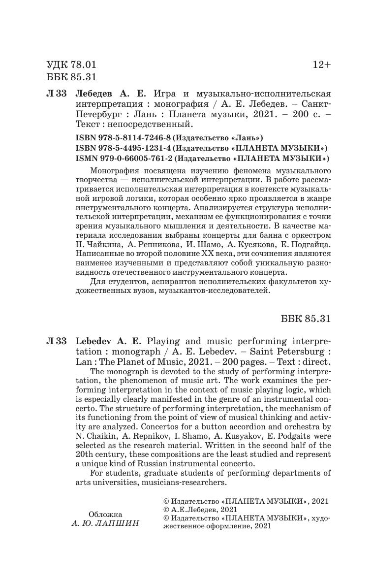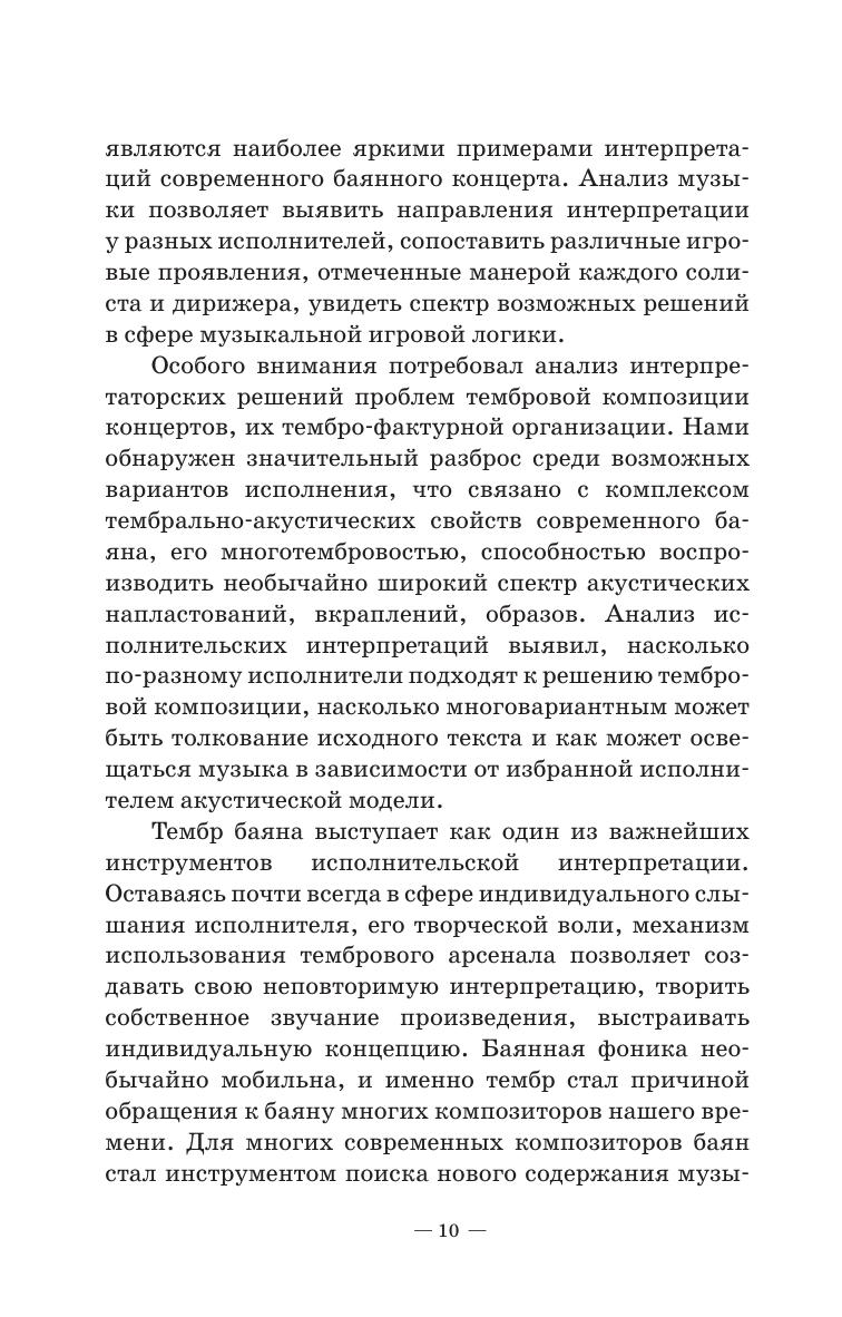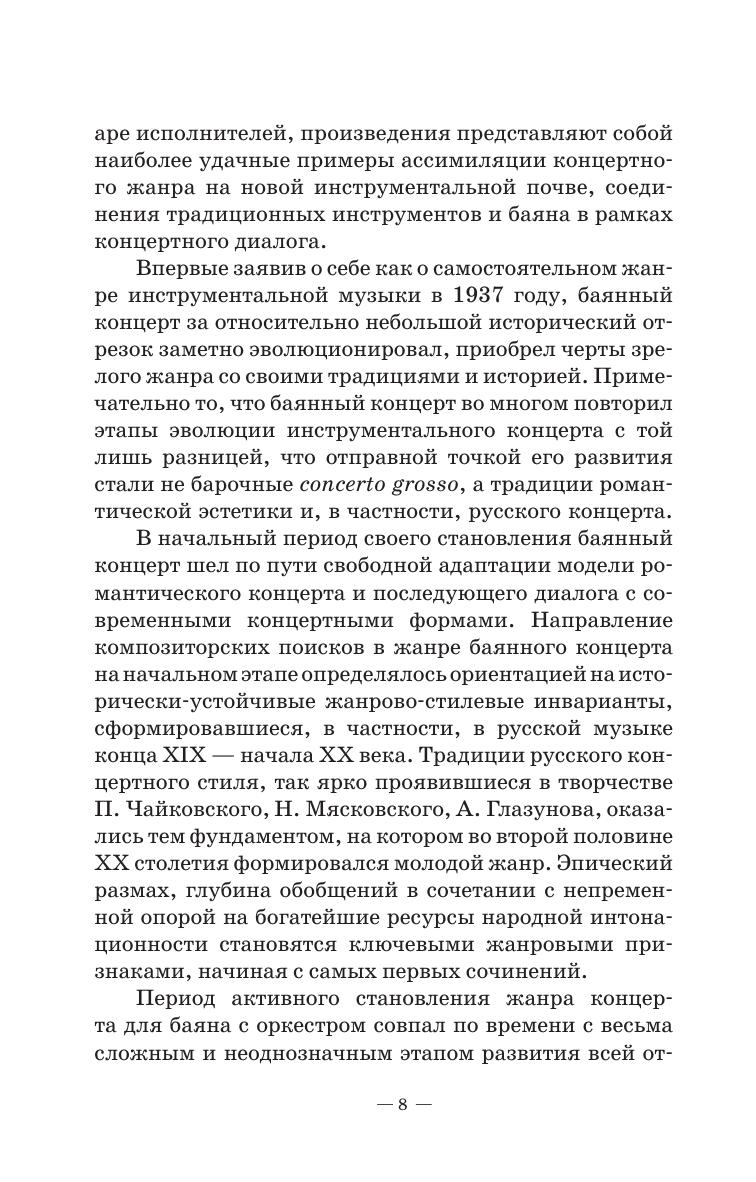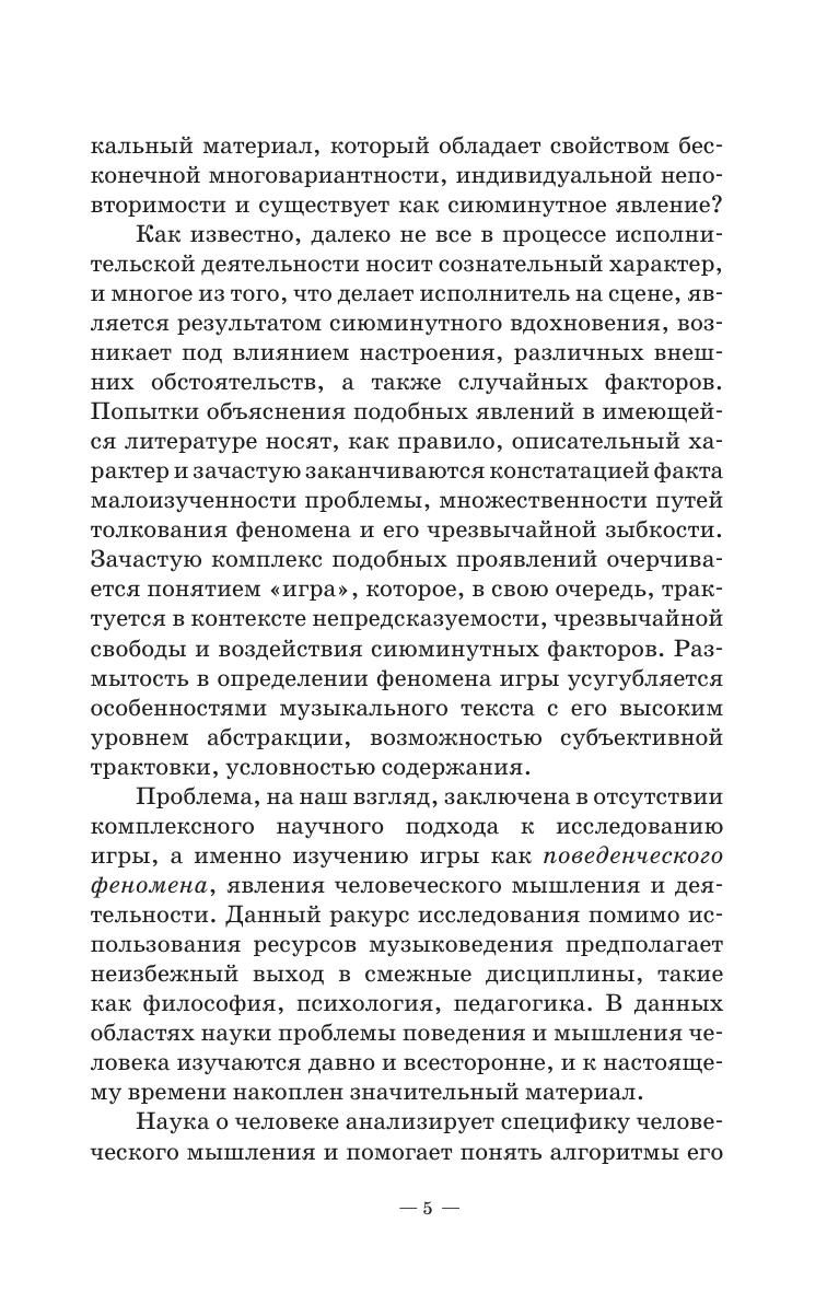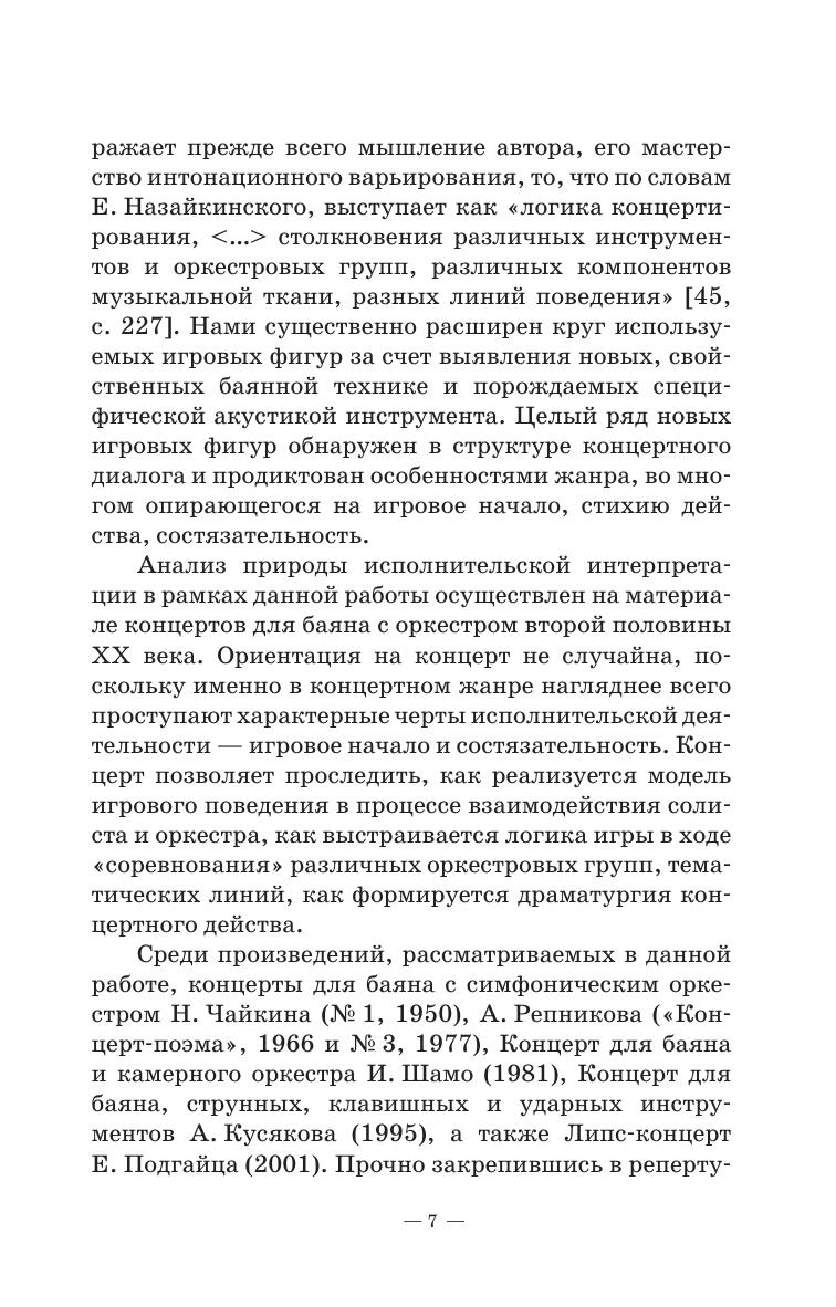 Монография посвящена изучению феномена музыкального творчества – исполнительской интерпретации. В работе рассматривается исполнительская интерпретация в контексте музыкальной игровой логики, которая особенно ярко проявляется в жанре инструментального концерта. Анализируется структура исполнительской интерпретации, механизм ее функционирования с точки зрения музыкального мышления и деятельности. В качестве материала исследования выбраны концерты для баяна с оркестром Н. Чайкина, А. Репникова, И. Шамо, А. Кусякова, Е. Подгайца. Написанные во второй половине XX века, эти сочинения являются наименее изученными и представляют собой уникальную разновидность отечественного инструментального концерта.
