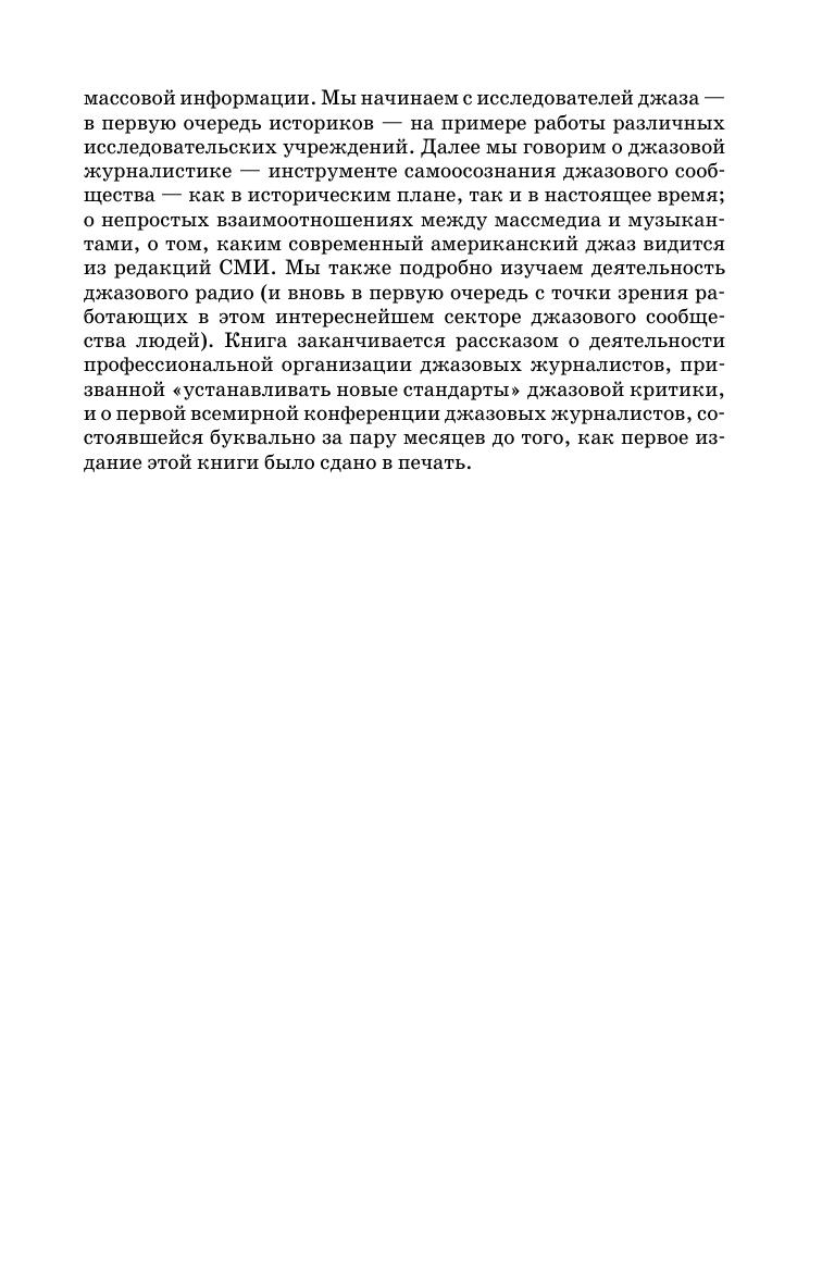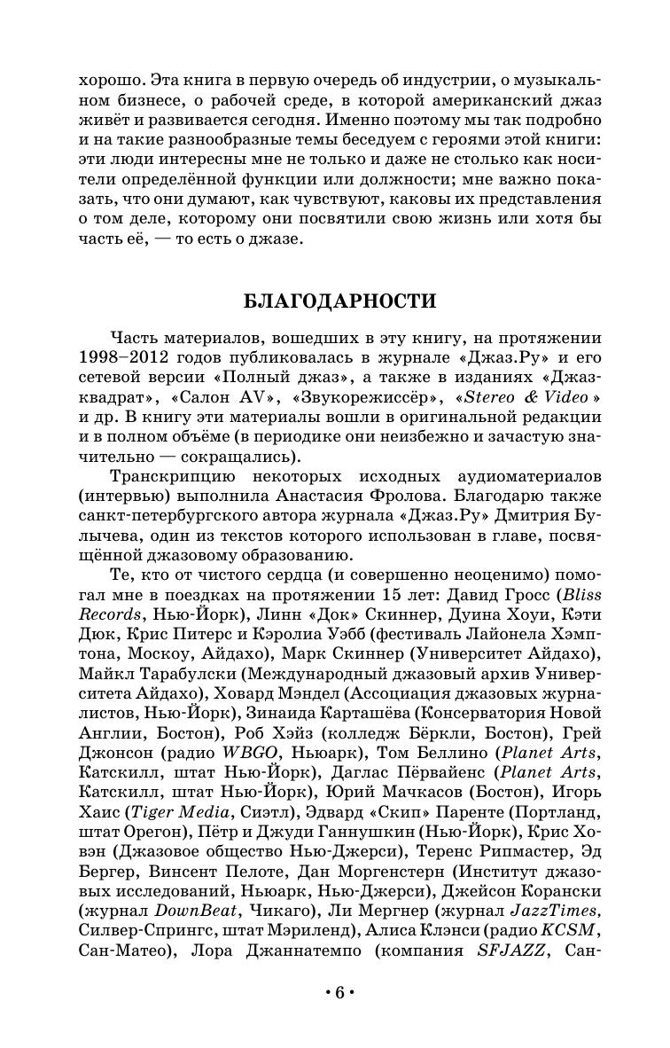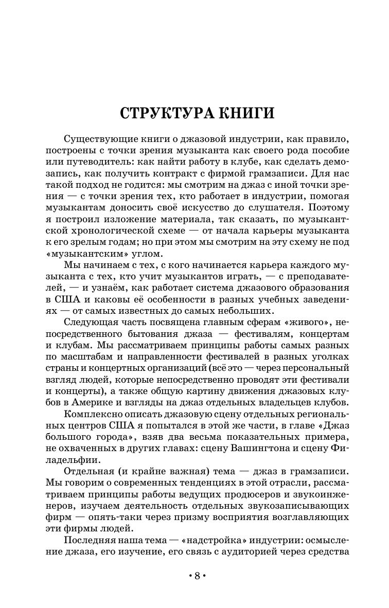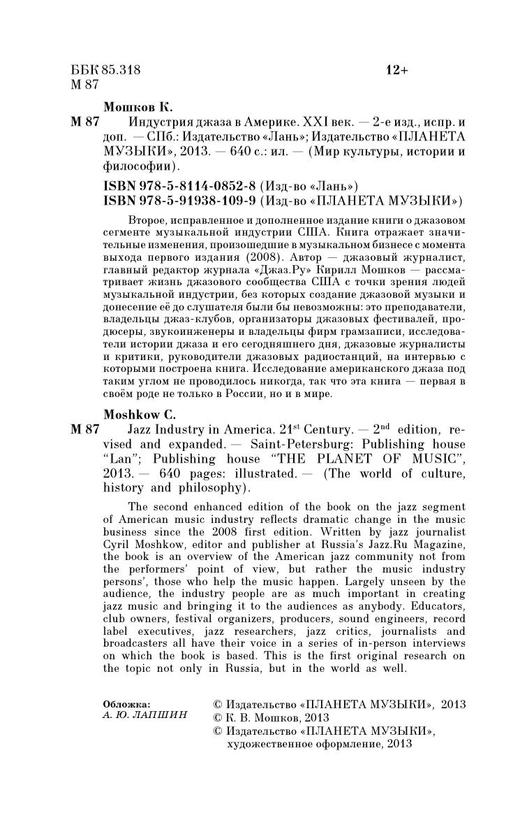 Второе, исправленное и дополненное издание книги о джазовом сегменте музыкальной индустрии США. Книга отражает значительные изменения, произошедшие в музыкальном бизнесе с момента выхода первого издания (2008). Автор — джазовый журналист, главный редактор журнала «Джаз.Ру» Кирилл Мошков — рассматривает жизнь джазового сообщества США с точки зрения людей музыкальной индустрии, без которых создание джазовой музыки и донесение её до слушателя были бы невозможны: это преподаватели, владельцы джаз-клубов, организаторы джазовых фестивалей, продюсеры, звукоинженеры и владельцы фирм грамзаписи, исследователи истории джаза и его сегодняшнего дня, джазовые журналисты и критики, руководители джазовых радиостанций, на интервью с которыми построена книга. Исследование американского джаза под таким углом не проводилось никогда, так что эта книга — первая в своем роде не только в России, но и в мире.