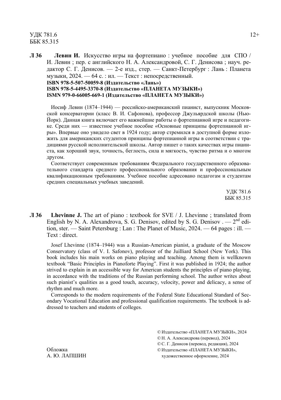 Иосиф Левин (1874 – 1944) – российско-американский пианист, выпускник Московской консерватории (класс В. Сафонова), музыкальный педагог, преподававший в Джульярдской школе (Нью-Йорк). Данная книга – известное учебное пособие по фортепианной игре. Впервые оно увидело свет в 1924 году, автор стремился в доступной форме изложить для американских студентов принципы фортепианной игры в соответствии с традициями русской исполнительской школы. Автор пишет о таких качествах игры пианиста как хороший звук, точность, беглость, сила и мягкость, чувство ритма и о многом другом. Учебное пособие адресовано педагогам и студентам средних специальных учебных заведений. Josef Lhevinne (1874 – 1944) was a Russian-American pianist, a graduate of the Moscow Conservatory (class of V. Safonov), a music teacher, who taught at the Juilliard School (New York). This book is a well-known textbook on piano playing. First it was published in 1974, the author strived to explain in an accessible way for American students the principles of piano playing, in accordance with the traditions of the Russian performing school. The author writes about such pianist’s qualities as a good touch, accuracy, velocity, power and delicacy, a sense of rhythm and much more. The textbook is addressed to teachers and students of colleges.