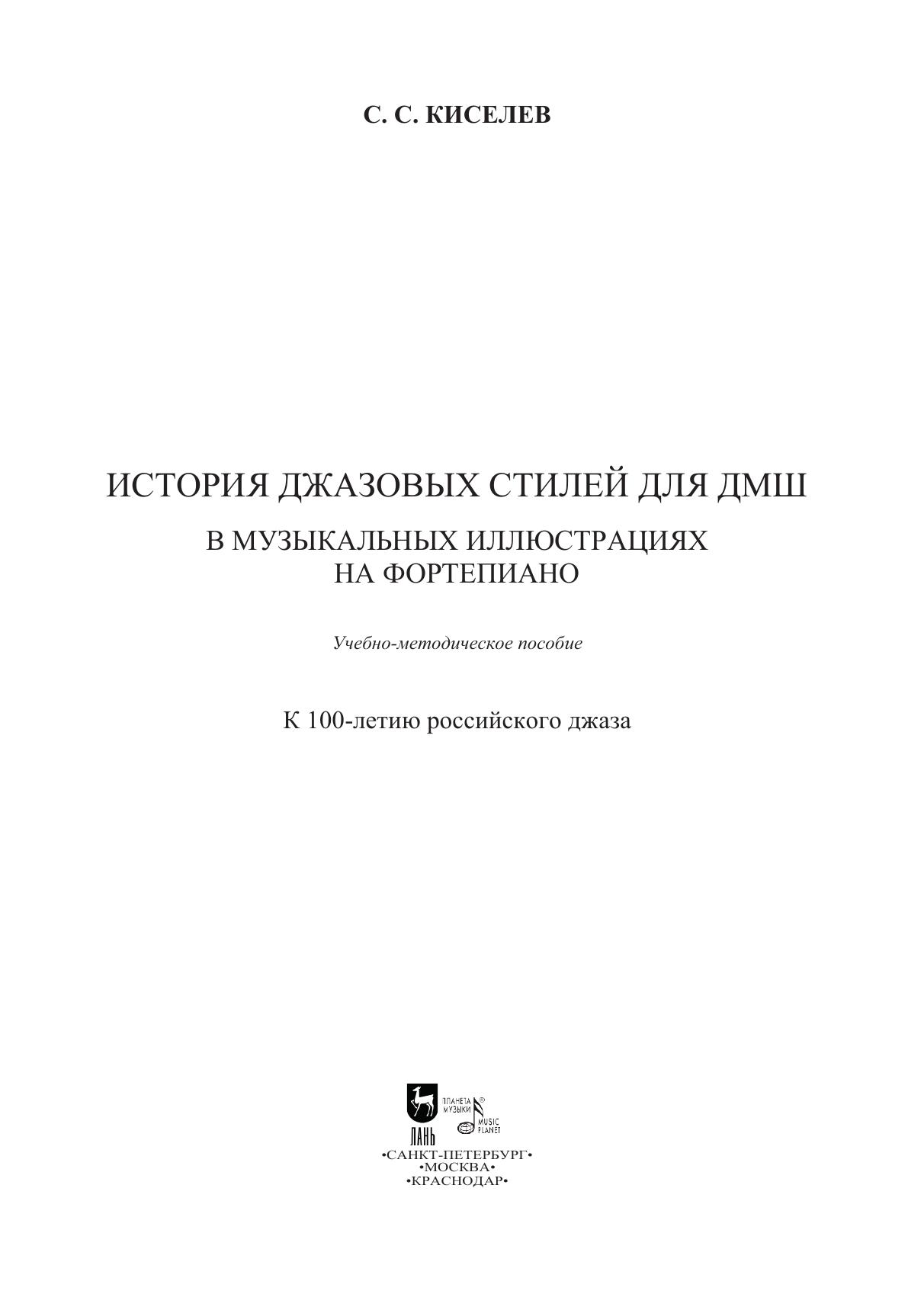Учебно-методическое пособие содержит 14 пьес для фортепиано разной джазовой стилистики: от спиричуэл до джаз-рока средней трудности. Каждый стиль снабжен кратким описанием его особенностей и специфических приемов исполнения. Главная цель издания — помочь юным музыкантам познакомиться с миром живого исполнения и понимания джаза. В конце предложен краткий словарь джазовых терминов. Пособие будет интересно учащимся музыкальных школ, студентам вузов и ссузов, преподавателям и просто любителям джаза. The methodical textbook includes 14 piano pieces of different jazz styles: from spirituals to jazz-rock of a medium level. There are comments on each style: a brief description of its features and specific performing techniques. The edition is aimed to help young musicians get acquainted with the world of live performance and understanding of jazz. At the end, there’s a brief glossary of jazz terms. The textbook will be of interest to students of music schools, students of colleges and higher schools, teachers and just jazz fans.