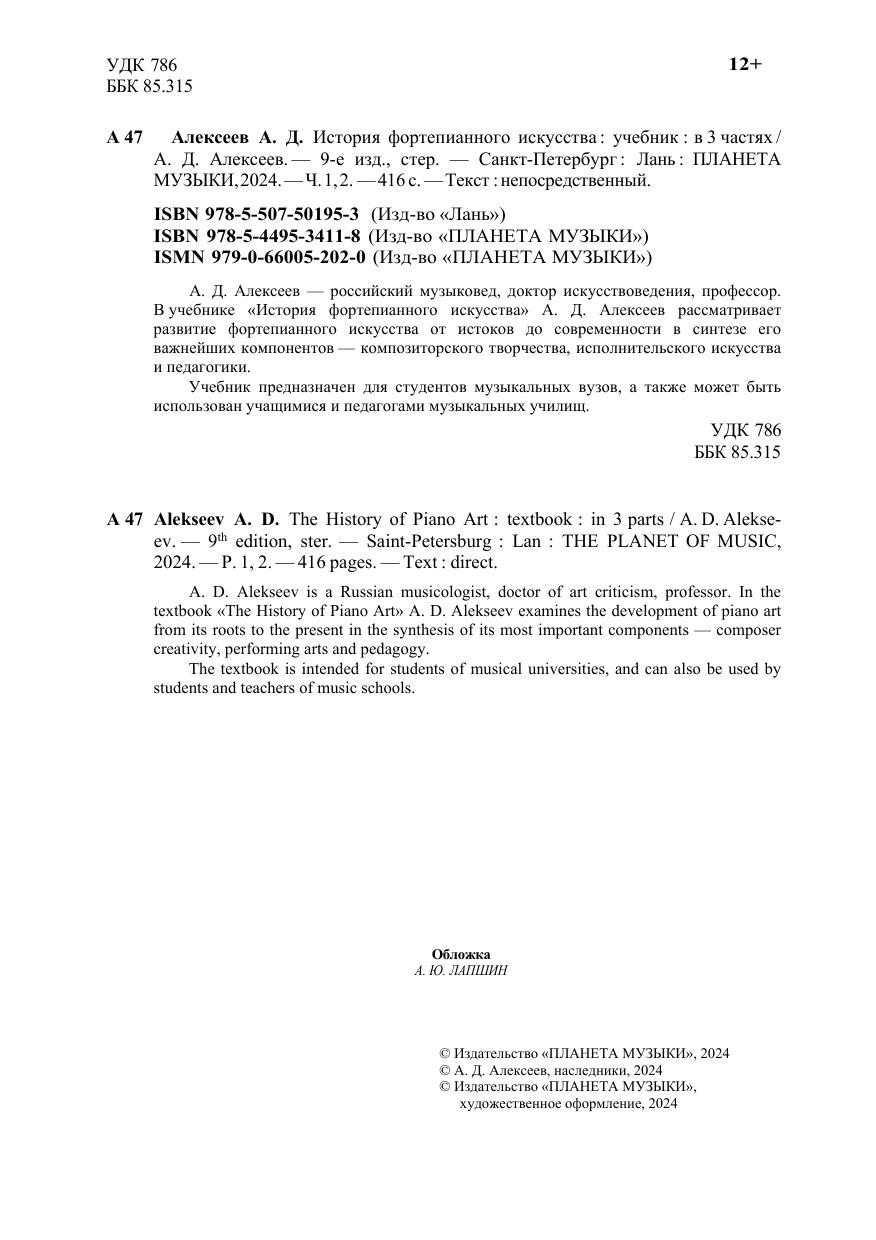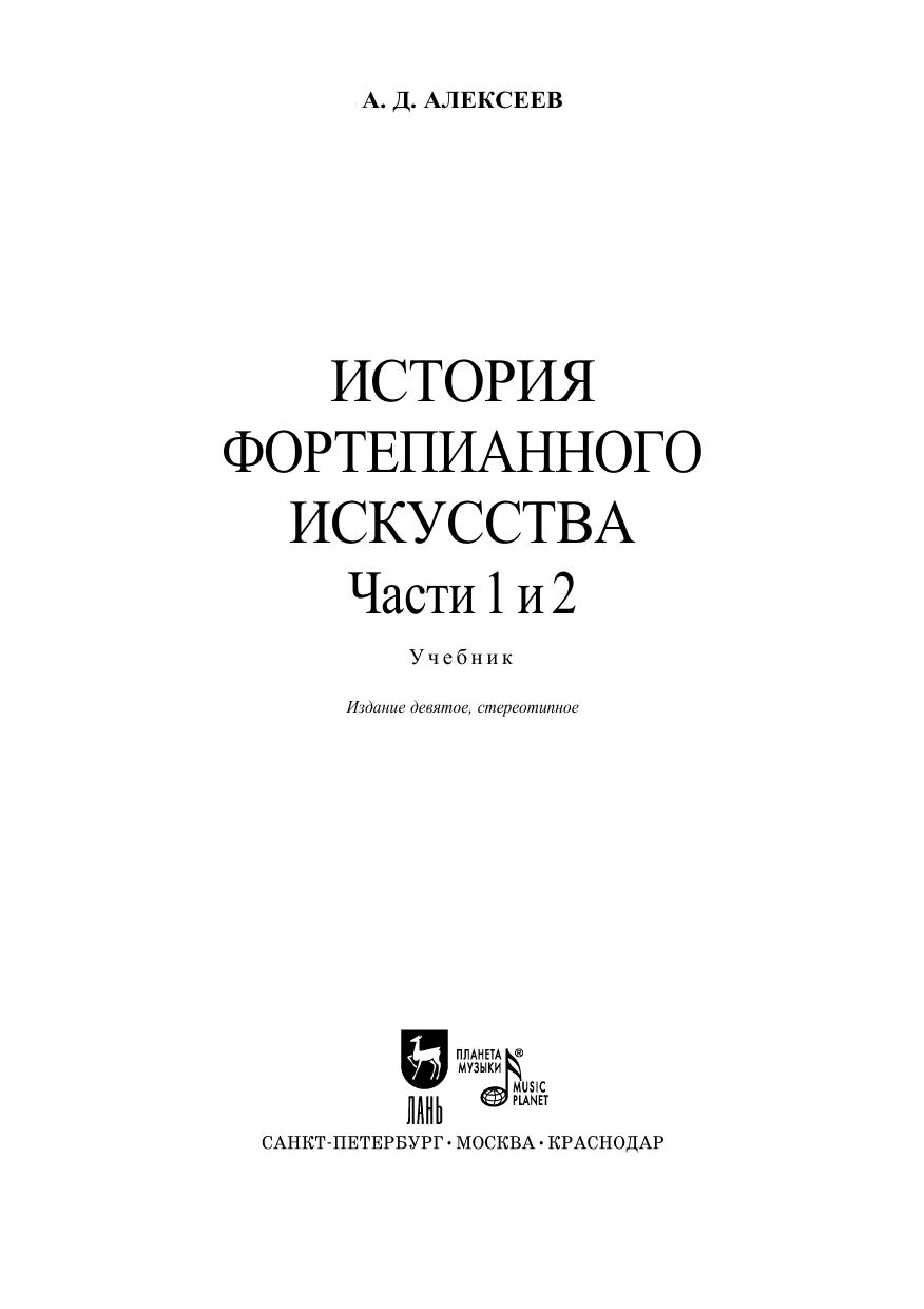 А. Д. Алексеев — российский музыковед, доктор искусствоведения, профессор. В учебнике «История фортепианного искусства» А. Д. Алексеев рассматривает развитие фортепианного искусства от истоков до современности в синтезе его важнейших компонентов — композиторского творчества, исполнительского искусства и педагогики. Учебник предназначен для студентов музыкальных вузов, а также может быть использован учащимися и педагогами музыкальных училищ. A. D. Alekseev is a Russian musicologist, doctor of art criticism, professor. In the textbook "The History of Piano Art" A. D. Alekseev examines the development of piano art from its roots to the present in the synthesis of its most important components — composer creativity, performing arts and pedagogy. The textbook is intended for students of musical universities, and can also be used by students and teachers of music schools.