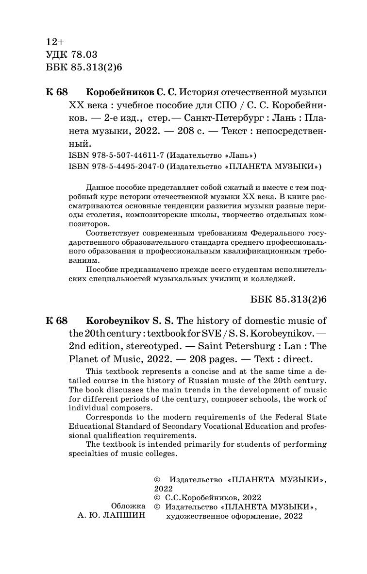 This textbook represents a concise and at the same time a detailed course in the history of Russian music of the 20th century. The book discusses the main trends in the development of music for different periods of the century, composer schools, the work of individual composers. The textbook is intended for the students of colleges.