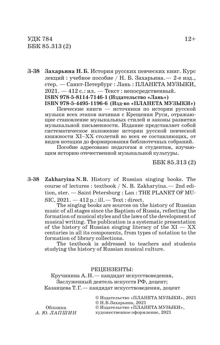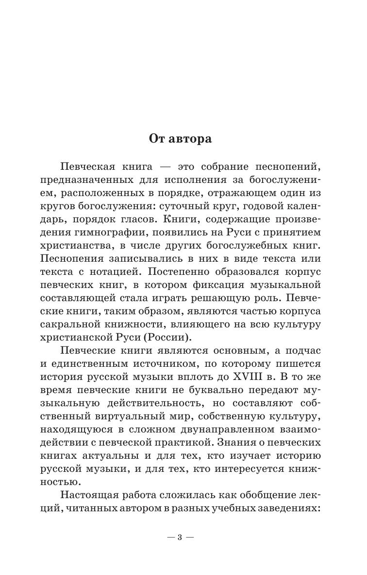 Певческие книги - источники по истории русской музыки всех этапов начиная с Крещения Руси, отражающие становление музыкальных стилей и законы развития музыкальной письменности. Издание представляет собой систематическое изложение истории русской певческой книжности XI–ХХ столетий во всех ее составляющих, от видов нотации до формирования библиотечных собраний.