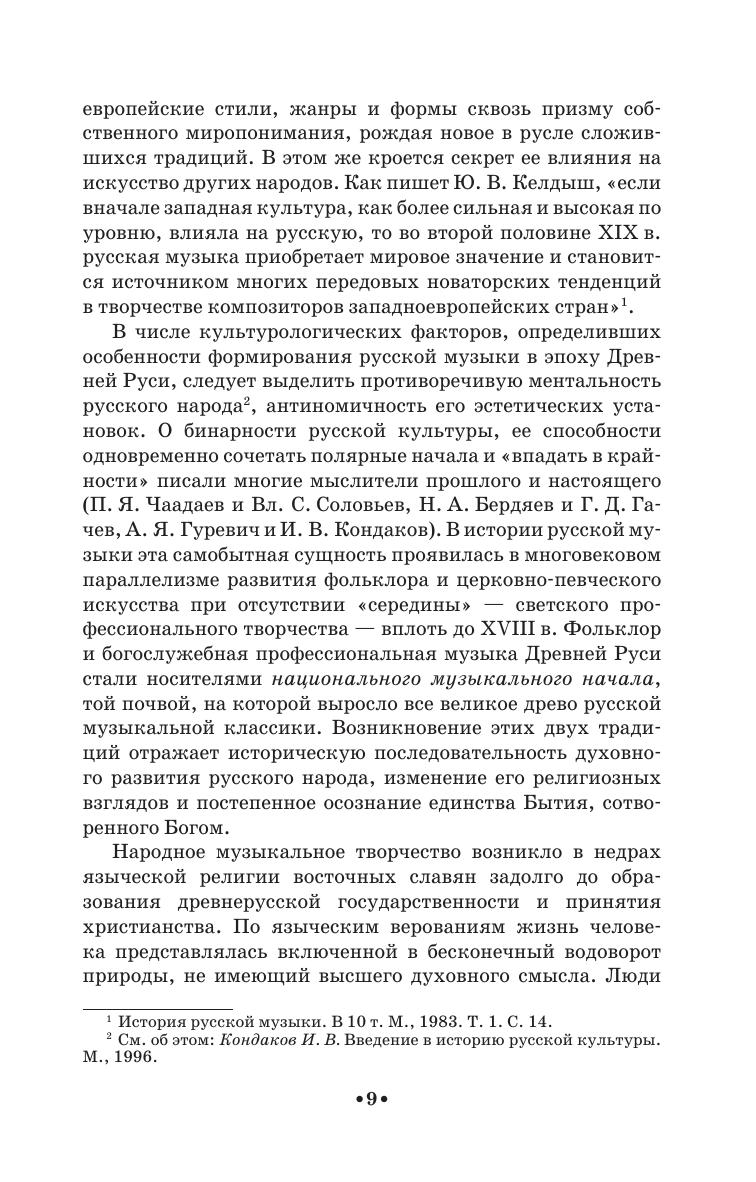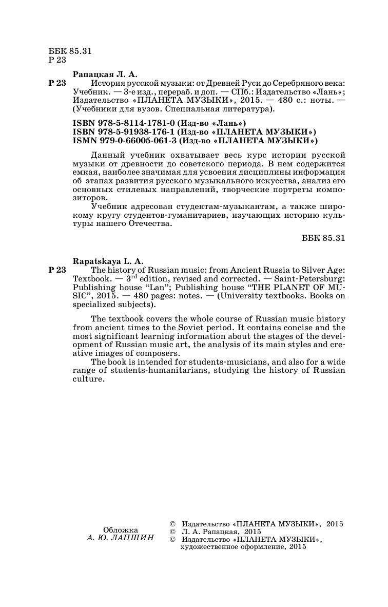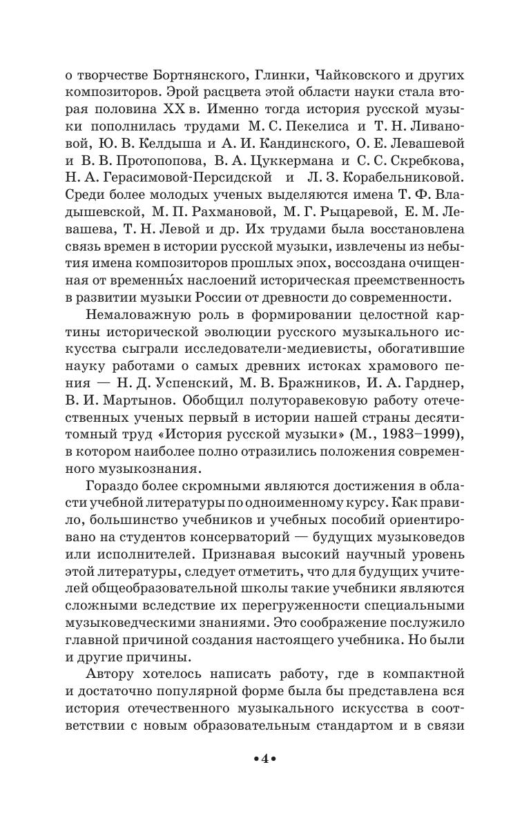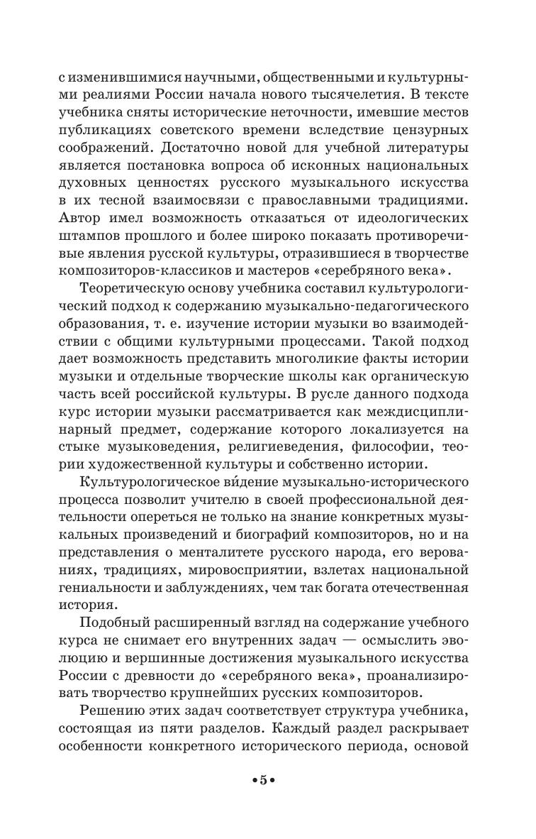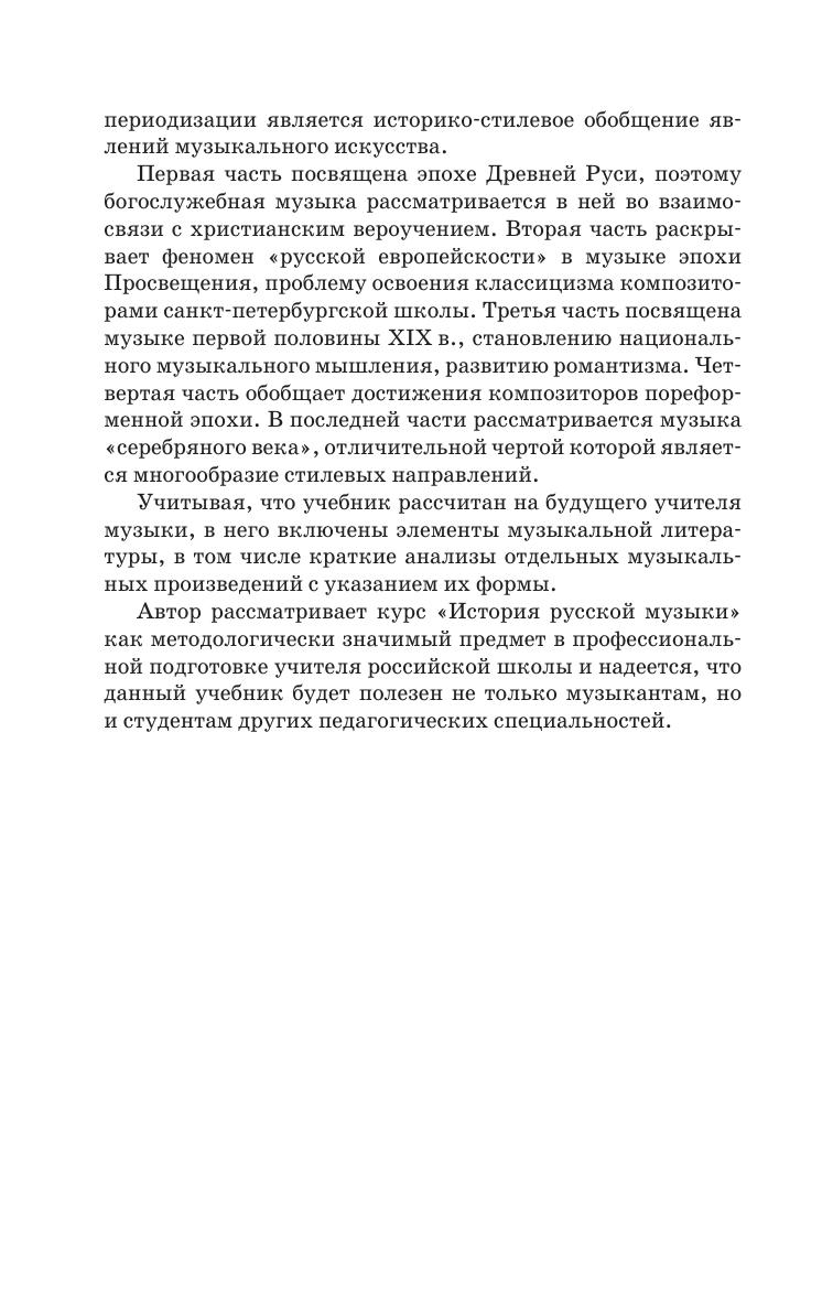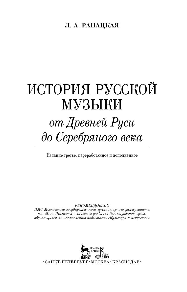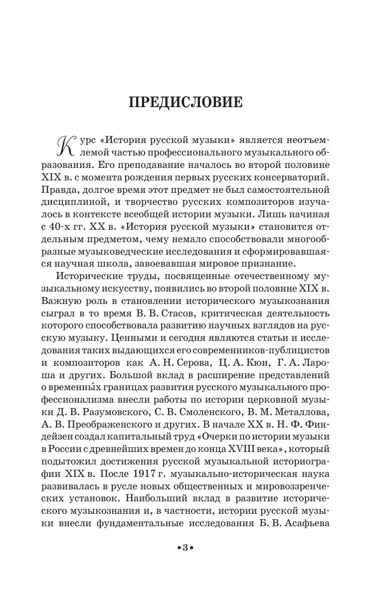 The textbook covers the whole course of Russian music history from ancient times to the Soviet period. It contains concise and the most significant learning information about the stages of the development of Russian music art, the analysis of its main styles and creative images of composers. The book is intended for students-musicians, and also for a wide range of students-humanitarians, studying the history of Russian culture.