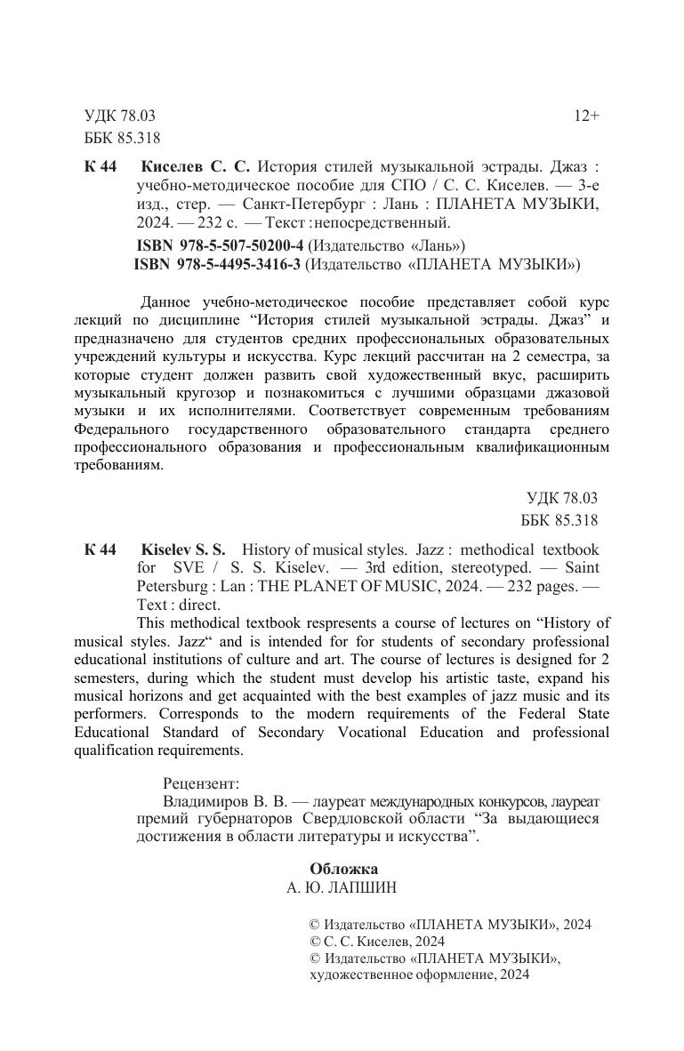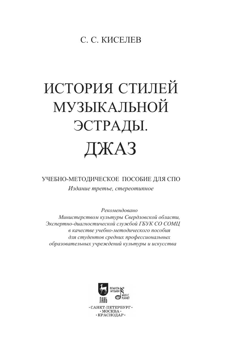 Данное учебное пособие представляет собой курс лекций по дисциплине “История стилей музыкальной эстрады. Джаз” и предназначено для студентов средних профессиональных образовательных учреждений культуры и искусства. Курс лекций рассчитан на 2 семестра, за которые студент должен развить свой художественный вкус, расширить музыкальный кругозор и познакомиться с лучшими образцами джазовой музыки и их исполнителями. Соответствует современным требованиям Федерального государственного образовательного стандарта среднего профессионального образования и профессиональным квалификационным требованиям. This textbook respresents a course of lectures on "History of music styles. Jazz " and is intended for for students of secondary professional educational institutions of culture and art. The course of lectures is designed for 2 semesters, during which the student must develop his artistic taste, expand his musical horizons and get acquainted with the best examples of jazz music and its performers. Corresponds to the modern requirements of the Federal State Educational Standard of Secondary Vocational Education and professional qualification requirements.