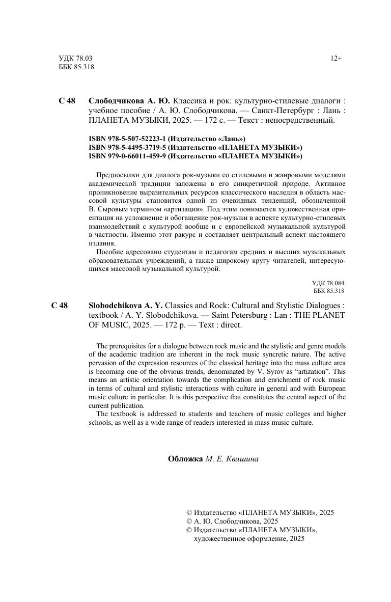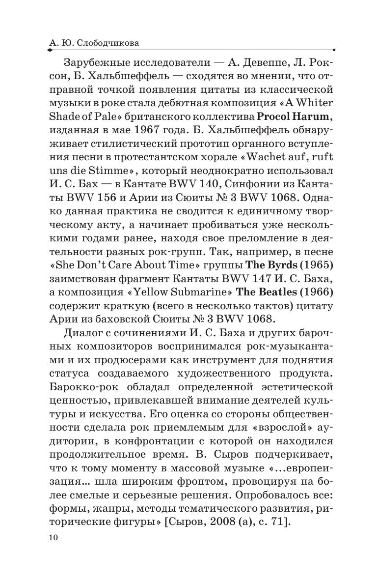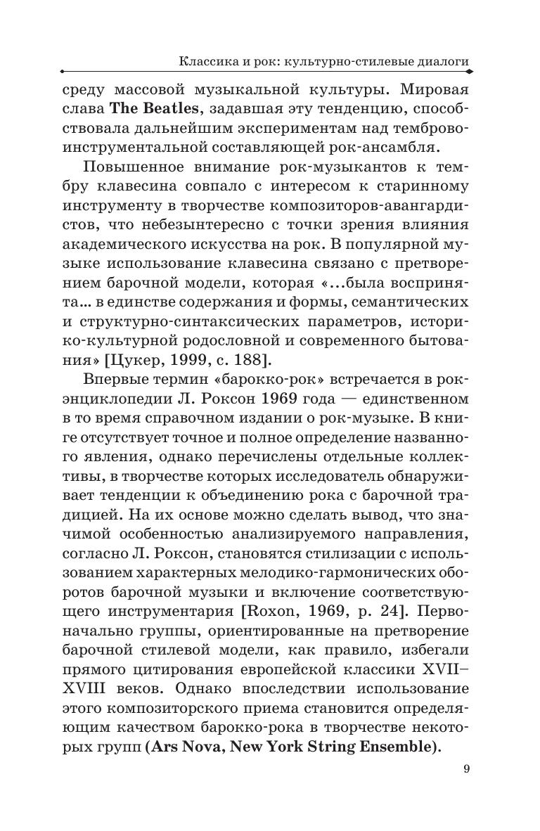 Предпосылки для диалога рок-музыки со стилевыми и жанровыми моделями академической традиции заложены в его синкретичной природе. Активное проникновение выразительных ресурсов классического наследия в область массовой культуры становится одной из очевидных тенденций, обозначенной В. Сыровым термином «артизация». Под этим понимается художественная ориентация на усложнение и обогащение рок-музыки в аспекте культурно-стилевых взаимодействий с культурой вообще и с европейской музыкальной культурой в частности. Именно этот ракурс и составляет центральный аспект настоящего издания. Пособие адресовано студентам и педагогам средних и высших музыкальных образовательных учреждений, а также широкому кругу читателей, интересующихся массовой музыкальной культурой. The prerequisites for a dialogue between rock music and the stylistic and genre models of the academic tradition are inherent in the rock music syncretic nature. The active pervasion of the expression resources of the classical heritage into the mass culture area is becoming one of the obvious trends, denominated by V. Syrov as “artization”. This means an artistic orientation towards the complication and enrichment of rock music in terms of cultural and stylistic interactions with culture in general and with European music culture in particular. It is this perspective that constitutes the central aspect of the current publication. The textbook is addressed to students and teachers of music colleges and higher schools, as well as a wide range of readers interested in mass music culture.