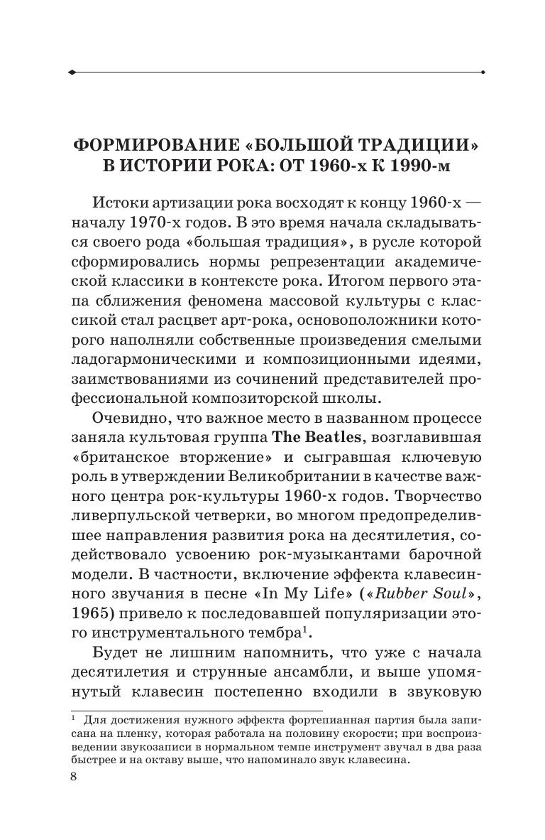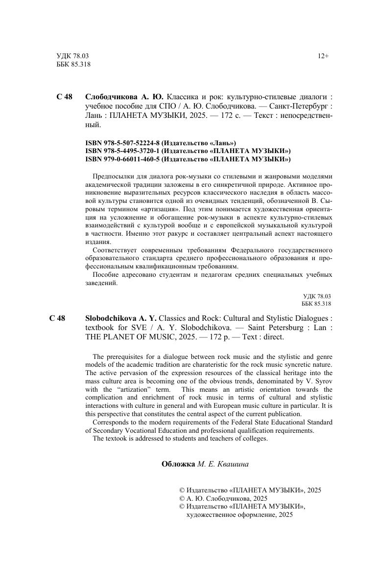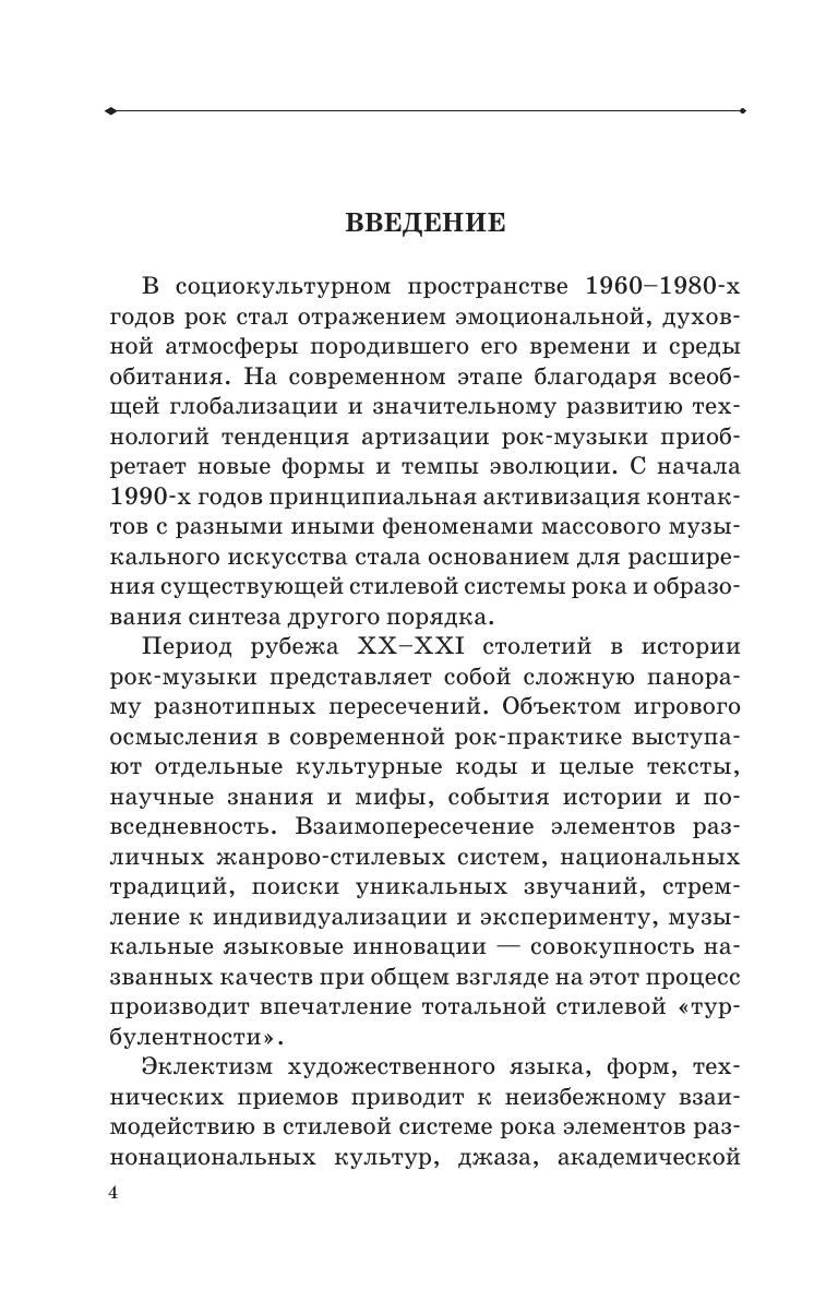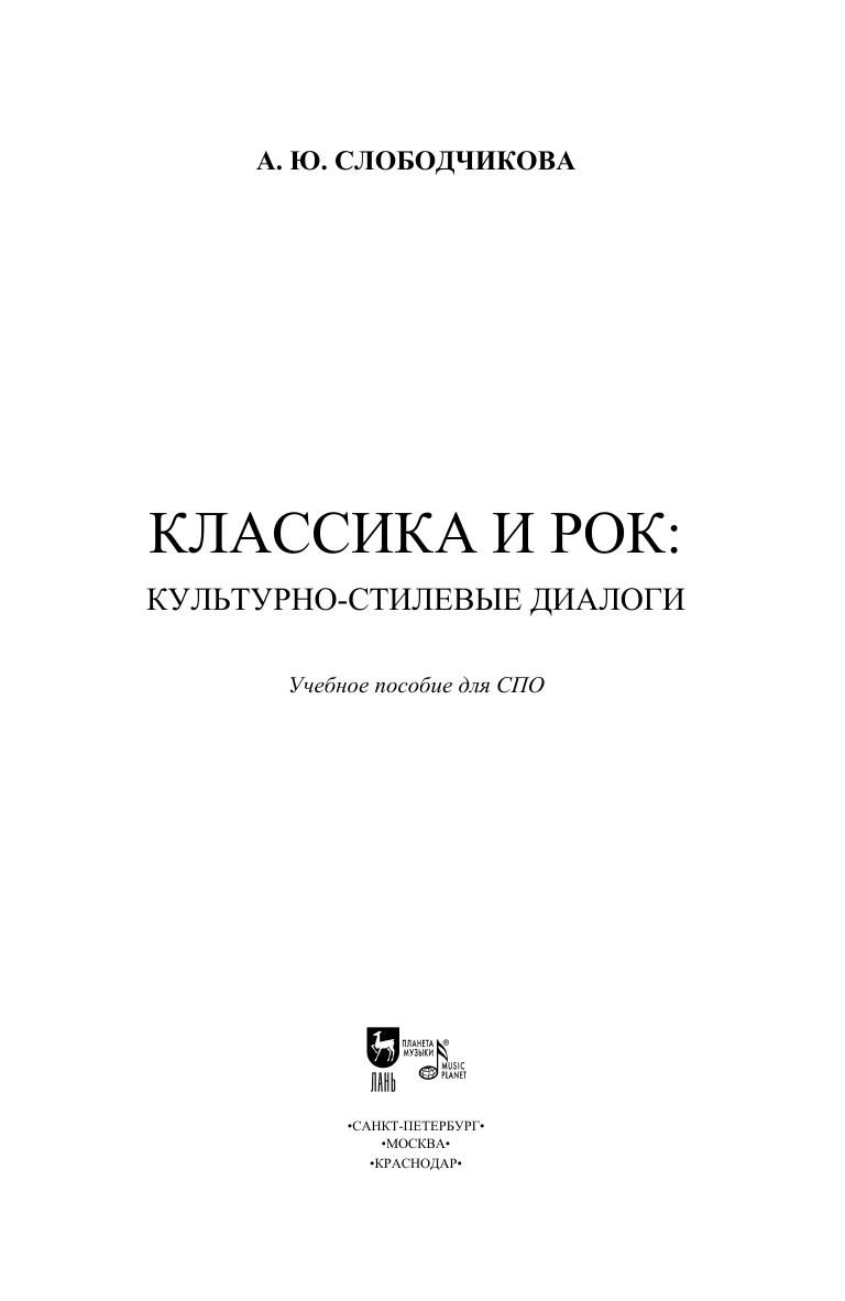 Предпосылки для диалога рок-музыки со стилевыми и жанровыми моделями академической традиции заложены в его синкретичной природе. Активное проникновение выразительных ресурсов классического наследия в область массовой культуры становится одной из очевидных тенденций, обозначенной В. Сыровым термином «артизация». Под этим понимается художественная ориентация на усложнение и обогащение рок-музыки в аспекте культурно-стилевых взаимодействий с культурой вообще и с европейской музыкальной культурой в частности. Именно этот ракурс и составляет центральный аспект настоящего издания. Соответствует современным требованиям Федерального государственного образовательного стандарта среднего профессионального образования и профессиональным квалификационным требованиям. Пособие адресовано студентам и педагогам средних специальных учебных заведений. The prerequisites for a dialogue between rock music and the stylistic and genre models of the academic tradition are charateristic for the rock music syncretic nature. The active pervasion of the expression resources of the classical heritage into the mass culture area is becoming one of the obvious trends, denominated by V. Syrov with the “artization” term. This means an artistic orientation towards the complication and enrichment of rock music in terms of cultural and stylistic interactions with culture in general and with European music culture in particular. It is this perspective that constitutes the central aspect of the current publication. Corresponds to the modern requirements of the Federal State Educational Standard of Secondary Vocational Education and professional qualification requirements. The textook is addressed to students and teachers of colleges.