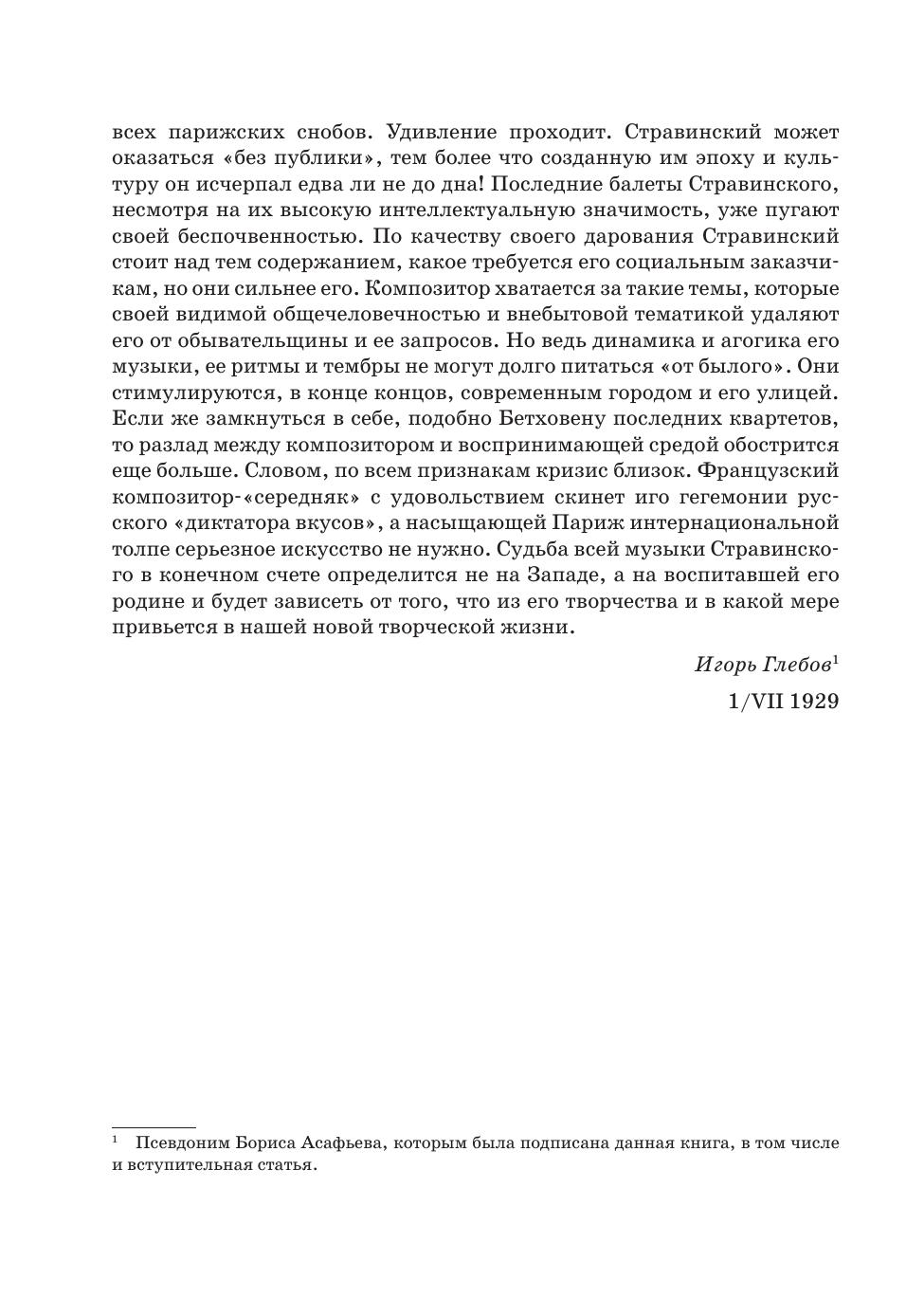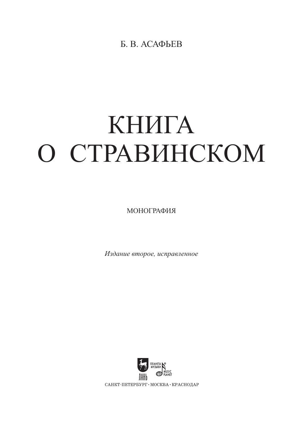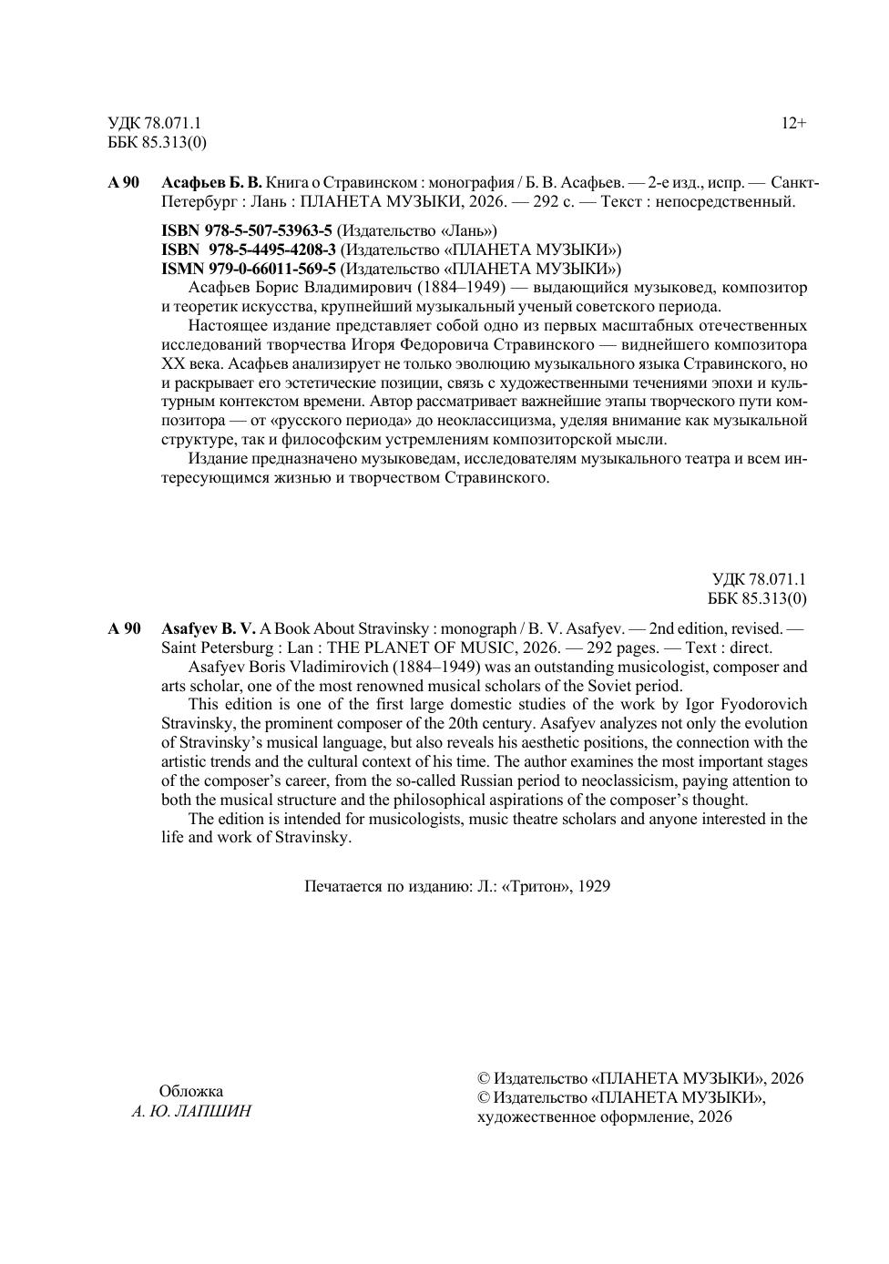 Асафьев Борис Владимирович (1884–1949) — выдающийся музыковед, композитор и теоретик искусства, крупнейший музыкальный ученый советского периода. Настоящее издание представляет собой одно из первых масштабных отечественных исследований творчества Игоря Фёдоровича Стравинского — виднейшего композитора XX века. Асафьев анализирует не только эволюцию музыкального языка Стравинского, но и раскрывает его эстетические позиции, связь с художественными течениями эпохи и культурным контекстом времени. Автор рассматривает важнейшие этапы творческого пути композитора — от «русского периода» до неоклассицизма, уделяя внимание как музыкальной структуре, так и философским устремлениям композиторской мысли. Издание предназначено музыковедам, исследователям музыкального театра и всем интересующихся жизнью и творчеством Стравинского. Asafyev Boris Vladimirovich (1884–1949) was an outstanding musicologist, composer and arts scholar, one of the most renowned musical scholars of the Soviet period. This edition is one of the first large domestic studies of the work by Igor Fyodorovich Stravinsky, the prominent composer of the 20th century. Asafyev analyzes not only the evolution of Stravinsky’s musical language, but also reveals his aesthetic positions, the connection with the artistic trends and the cultural context of his time. The author examines the most important stages of the composer’s career, from the so-called Russian period to neoclassicism, paying attention to both the musical structure and the philosophical aspirations of the composer’s thought. The edition is intended for musicologists, music theatre scholars and anyone interested in the life and work of Stravinsky.