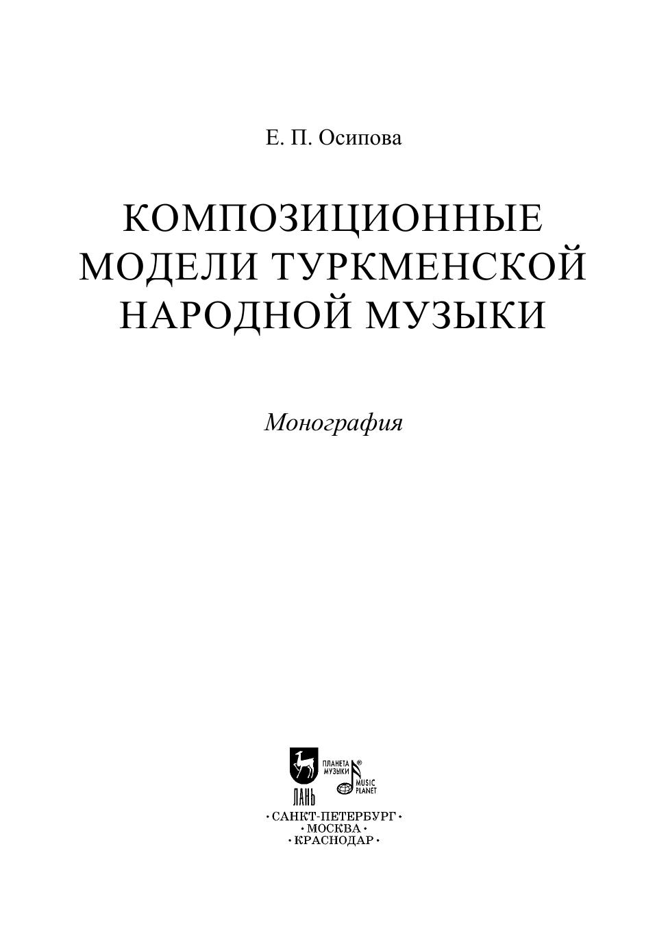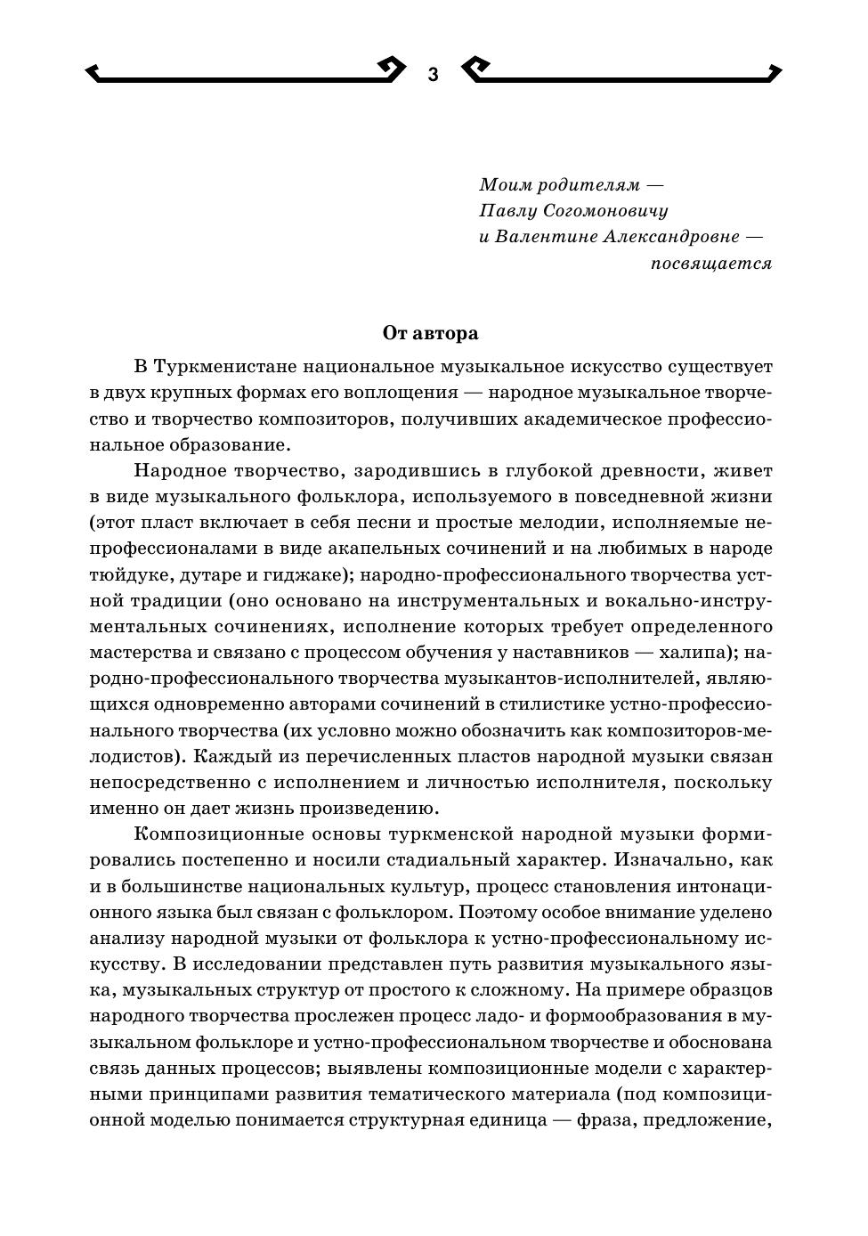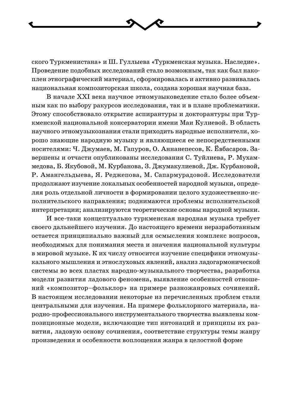 Монография посвящена исследованию композиционных моделей в туркменской народной музыке. На примере фольклорных образцов прослеживается процесс развития ладовых структур, организации интонационного словаря и его формообразующих компонентов. В исследуемых произведениях туркменской народной профессиональной инструментальной музыки (тюйдуковая, дутарная, гиджаковая музыка) определяются методы использования выявленных в фольклоре закономерностей, а также обозначается многообразие новых музыкально-выразительных средств. Книга предназначается для музыковедов, фольклористов, культурологов, преподавателей и студентов музыкальных учебных заведений и широкого круга читателей, интересующихся традиционной туркменской музыкой. The monograph is devoted to the study of compositional models in Turkmen folk music. The process of evolution of modal structures, establishing of intonation vocabulary and its form-generating components is traced using folklore samples as an example. In the studied works of Turkmen folk professional instrumental music (tuyduk, dutar, gidzhak music), methods of using patterns identified in folklore are determined, and a variety of new musical expressive means is also indicated. The book is intended for musicologists, folklorists, culture experts, teachers and students of music educational institutions and a wide range of readers interested in traditional Turkmen music.