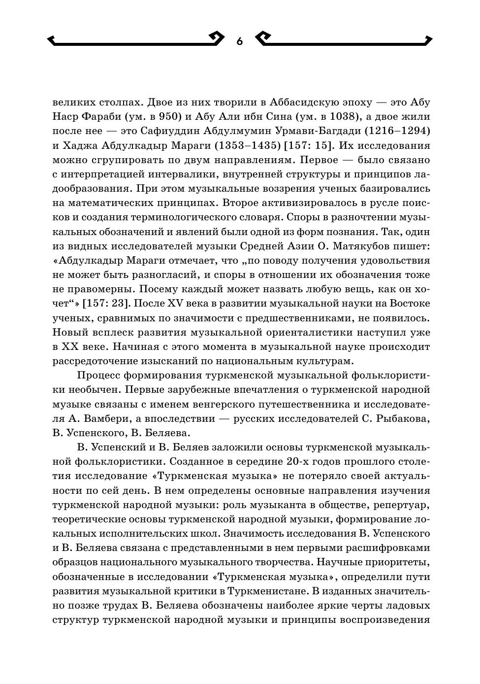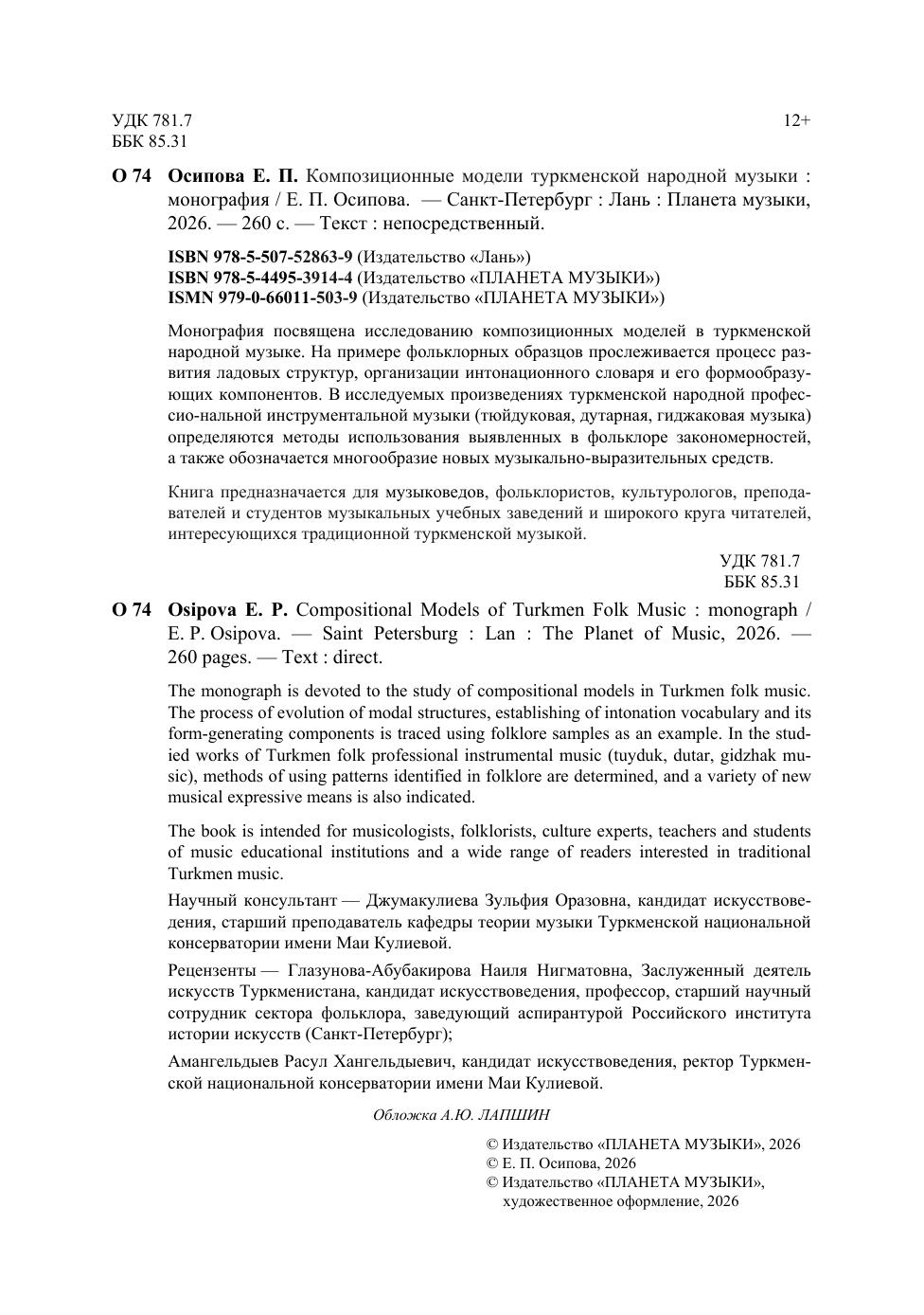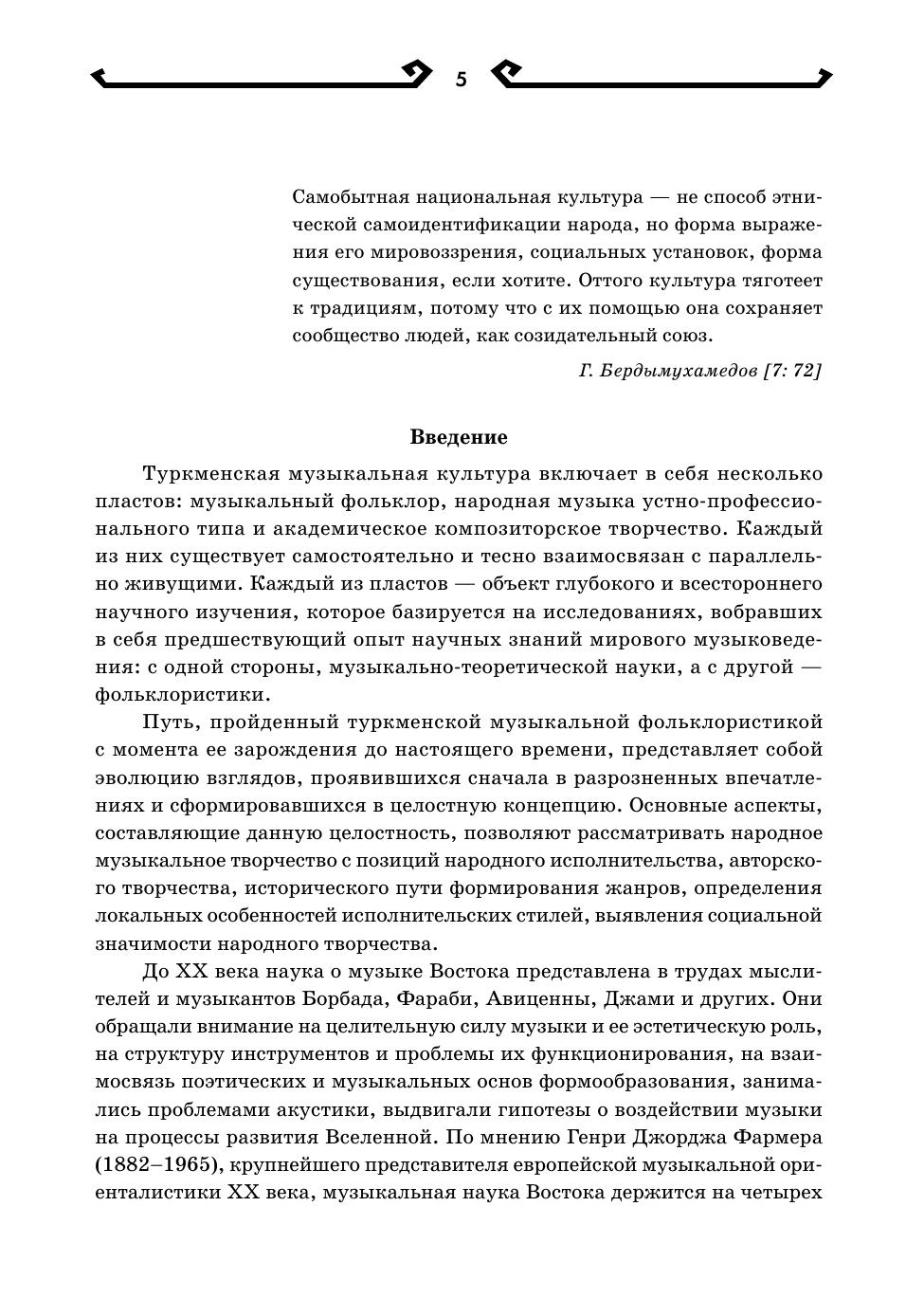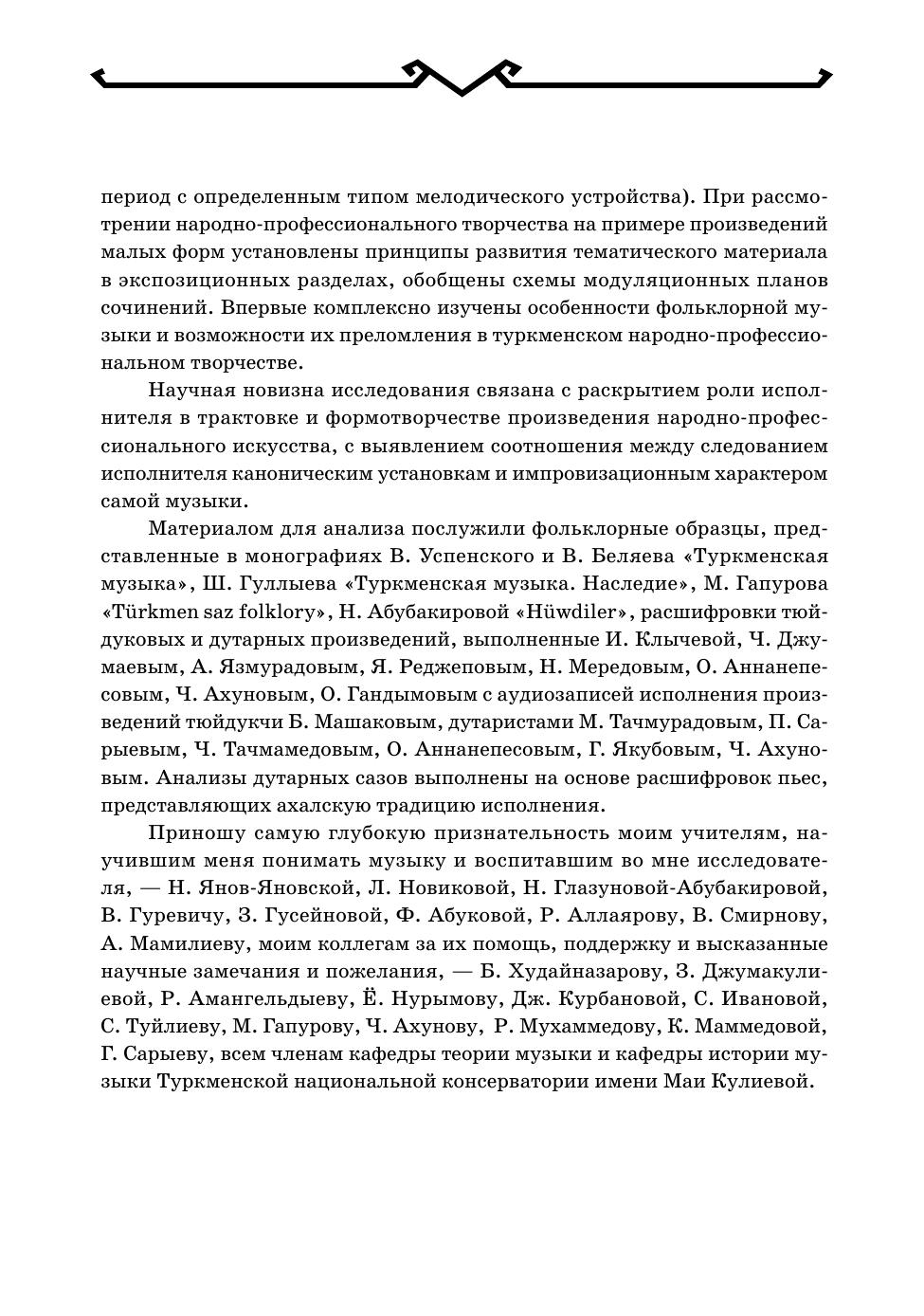 Монография посвящена исследованию композиционных моделей в туркменской народной музыке. На примере фольклорных образцов прослеживается процесс развития ладовых структур, организации интонационного словаря и его формообразующих компонентов. В исследуемых произведениях туркменской народной профессиональной инструментальной музыки (тюйдуковая, дутарная, гиджаковая музыка) определяются методы использования выявленных в фольклоре закономерностей, а также обозначается многообразие новых музыкально-выразительных средств. Книга предназначается для музыковедов, фольклористов, культурологов, преподавателей и студентов музыкальных учебных заведений и широкого круга читателей, интересующихся традиционной туркменской музыкой. The monograph is devoted to the study of compositional models in Turkmen folk music. The process of evolution of modal structures, establishing of intonation vocabulary and its form-generating components is traced using folklore samples as an example. In the studied works of Turkmen folk professional instrumental music (tuyduk, dutar, gidzhak music), methods of using patterns identified in folklore are determined, and a variety of new musical expressive means is also indicated. The book is intended for musicologists, folklorists, culture experts, teachers and students of music educational institutions and a wide range of readers interested in traditional Turkmen music.