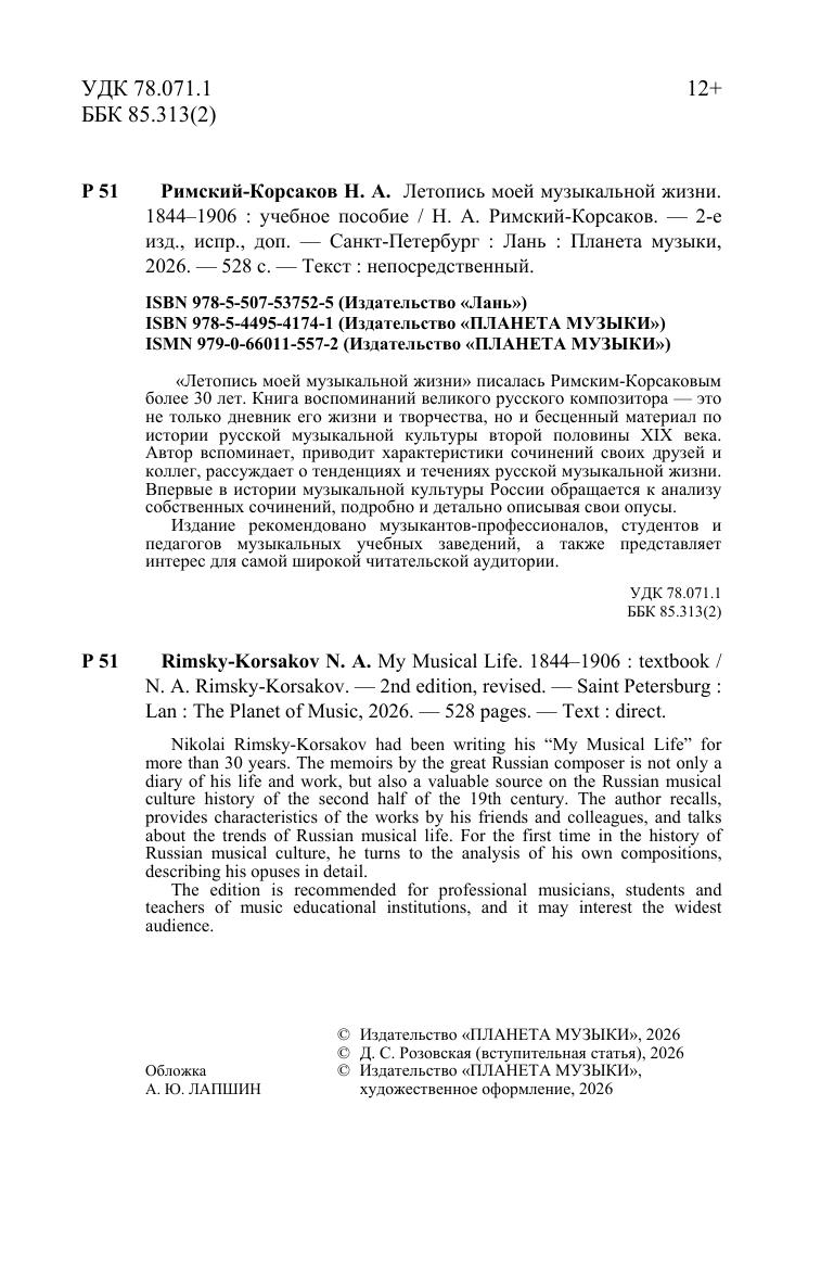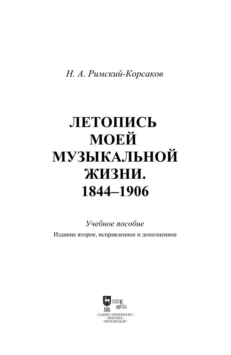 «Летопись моей музыкальной жизни» писалась Римским-Корсаковым более 30 лет. Книга воспоминаний великого русского композитора — это не только дневник его жизни и творчества, но и бесценный материал по истории русской музыкальной культуры второй половины XIX века. Автор вспоминает, приводит характеристики сочинений своих друзей и коллег, рассуждает о тенденциях и течениях русской музыкальной жизни. Впервые в истории музыкальной культуры России обращается к анализу собственных сочинений, подробно и детально описывая свои опусы. Издание рекомендовано музыкантам-профессионалам, студентам и педагогам музыкальных учебных заведений, а также представляет интерес для самой широкой читательской аудитории. Nikolai Rimsky-Korsakov had been writing his “My Musical Life” for more than 30 years. The memoirs by the great Russian composer is not only a diary of his life and work, but also a valuable source on the Russian musical culture history of the second half of the 19th century. The author recalls, provides characteristics of the works by his friends and colleagues, and talks about the trends of Russian musical life. For the first time in the history of Russian musical culture, he turns to the analysis of his own compositions, describing his opuses in detail. The edition is recommended for professional musicians, students and teachers of music educational institutions, and it may interest the widest audience.