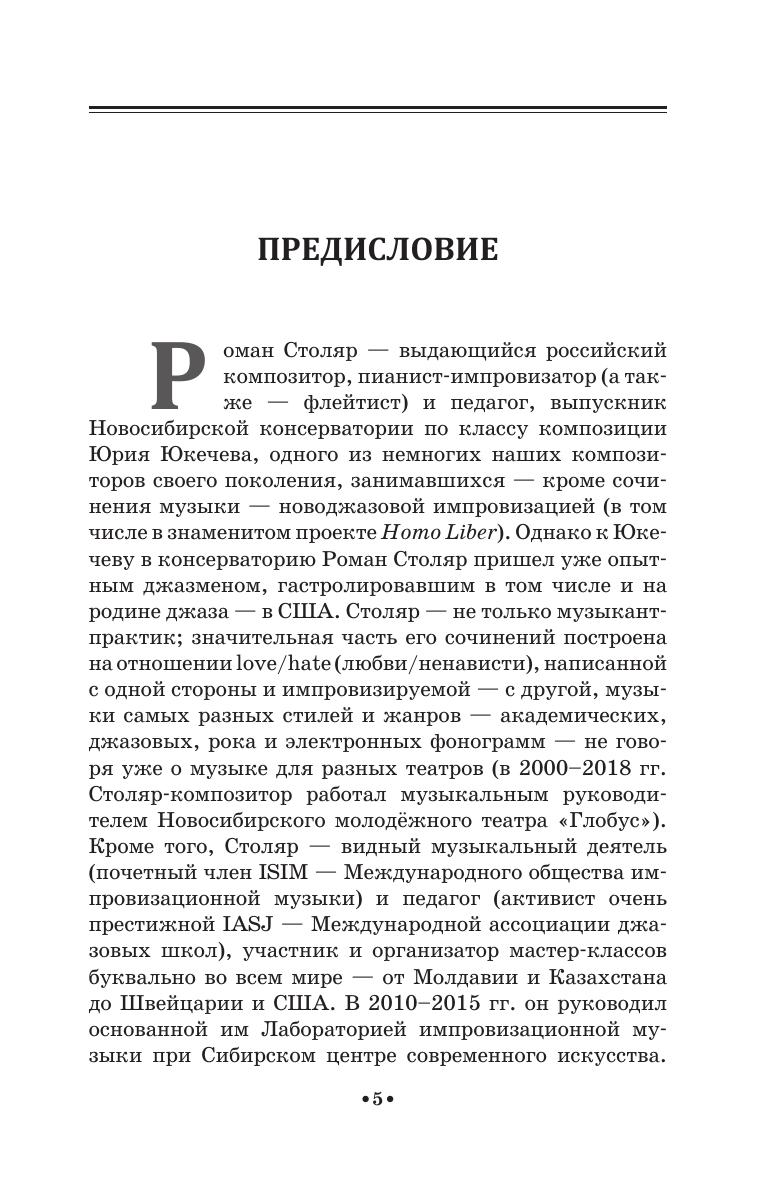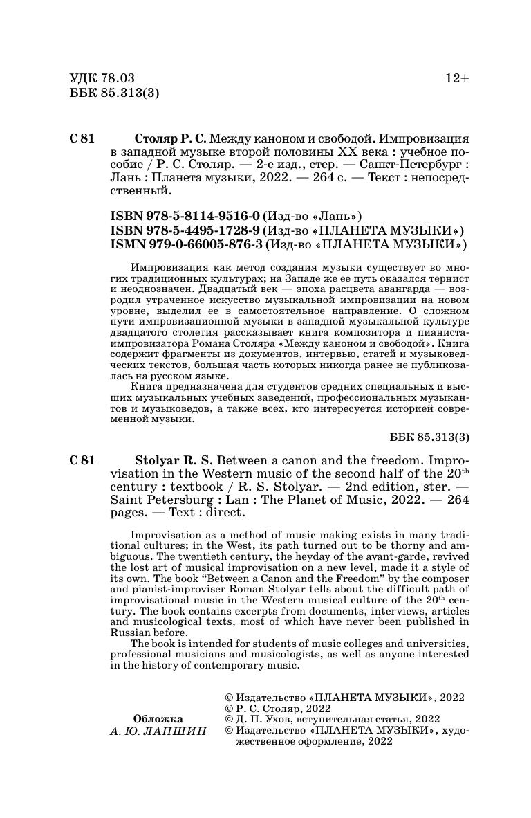 Импровизация как метод создания музыки существует во многих традиционных культурах; на Западе же ее путь оказался тернист и неоднозначен. Двадцатый век — эпоха расцвета авангарда — возродил утраченное искусство музыкальной импровизации на новом уровне, выделил ее в самостоятельное направление. О сложном пути импровизационной музыки в западной музыкальной культуре двадцатого столетия рассказывает книга композитора и пианиста-импровизатора Романа Столяра «Между каноном и свободой». Книга содержит фрагменты из документов, интервью, статей и музыковедческих текстов, большая часть которых никогда ранее не публиковалась на русском языке.