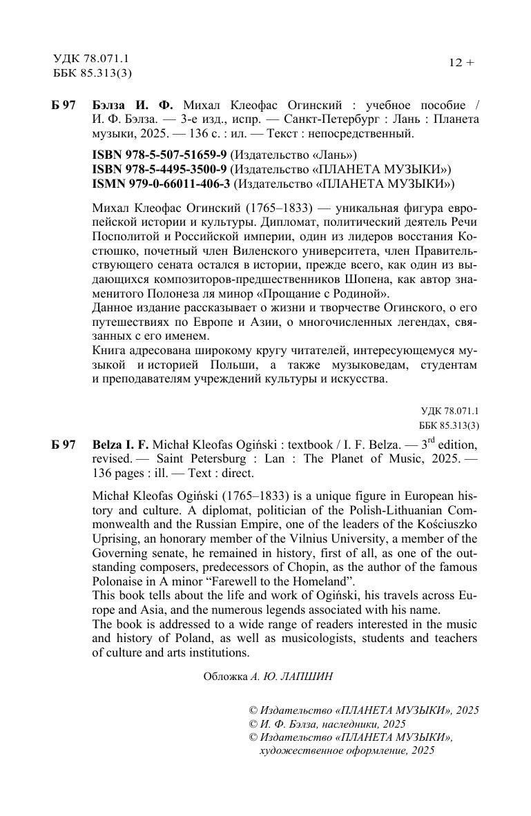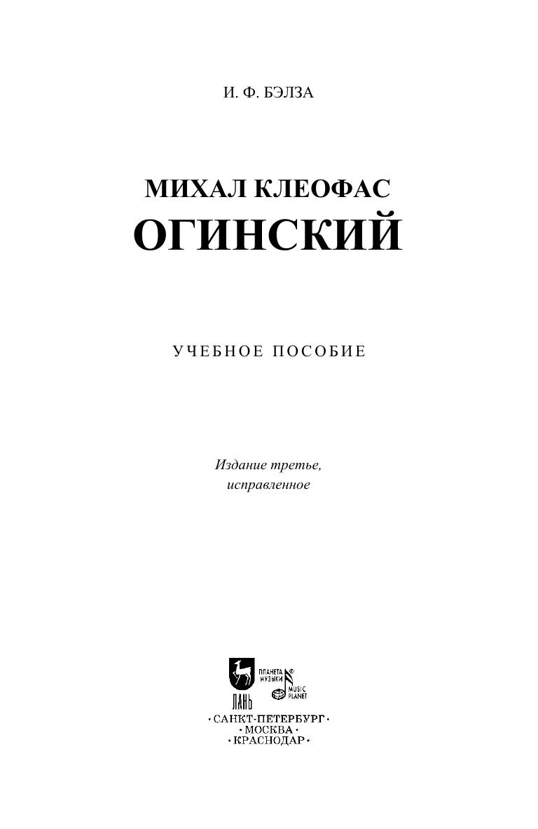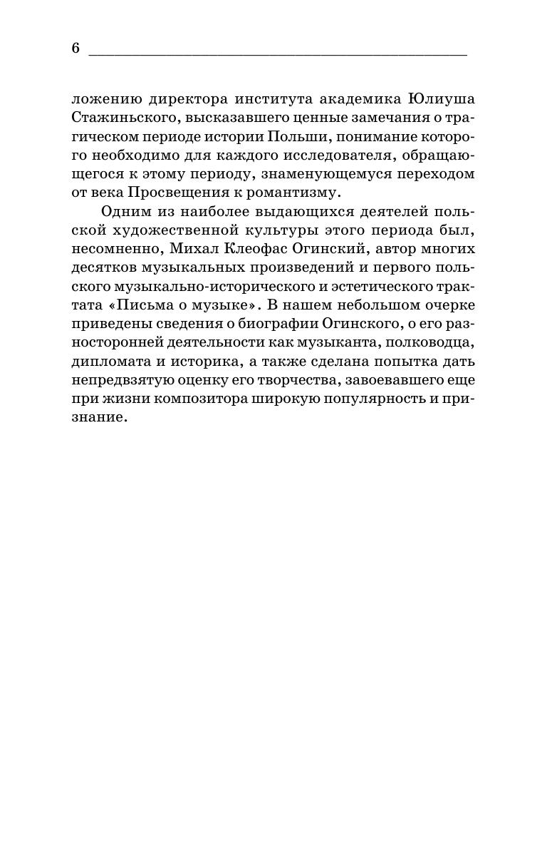 Михал Клеофас Огинский (1765-1833) – уникальная фигура европейской истории и культуры. Дипломат, политический деятель Речи Посполитой и Российской империи, один из лидеров восстания Костюшко, почетный член Виленского университета, член Правительствующего Сената остался в истории, прежде всего, как один из выдающихся композиторов-предшественников Шопена, как автор знаменитого Полонеза ля минор «Прощание с Родиной». Данное издание рассказывает о жизни и творчестве Огинского, о его путешествиях по Европе и Азии, о многочисленных легендах, связанных с его именем. Книга адресована широкому кругу читателей, интересующемуся музыкой и историей Польши, а также музыковедам, студентам и преподавателям учреждений культуры и искусства. Michał Kleofas Ogiński (1765–1833) is a unique figure in European his-tory and culture. A diplomat, politician of the Polish-Lithuanian Com-monwealth and the Russian Empire, one of the leaders of the Kościuszko Uprising, an honorary member of the Vilnius University, a member of the Governing senate, he remained in history, first of all, as one of the out-standing composers, predecessors of Chopin, as the author of the famous Polonaise in A minor “Farewell to the Homeland”. This book tells about the life and work of Ogiński, his travels across Eu-rope and Asia, and the numerous legends associated with his name. The book is addressed to a wide range of readers interested in the music and history of Poland, as well as musicologists, students and teachers of culture and arts institutions.