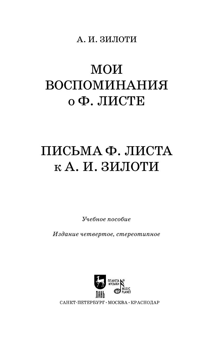 А.И.Зилоти (1863–1945) – видный русский дирижер и пианист. После окончания Московской консерватории брал уроки у Ф. Листа. В книге можно обнаружить много интересных фактов из жизни Листа, увидеть его отношение к музыке, к искусству; погрузиться в атмосферу того времени, понаблюдать за тем, как проистекал творческий учебный процесс, что собой представляли концерты. Письма Листа к Зилоти – подлинные документы, рассказывающие о творческом союзе двух выдающихся личностей.