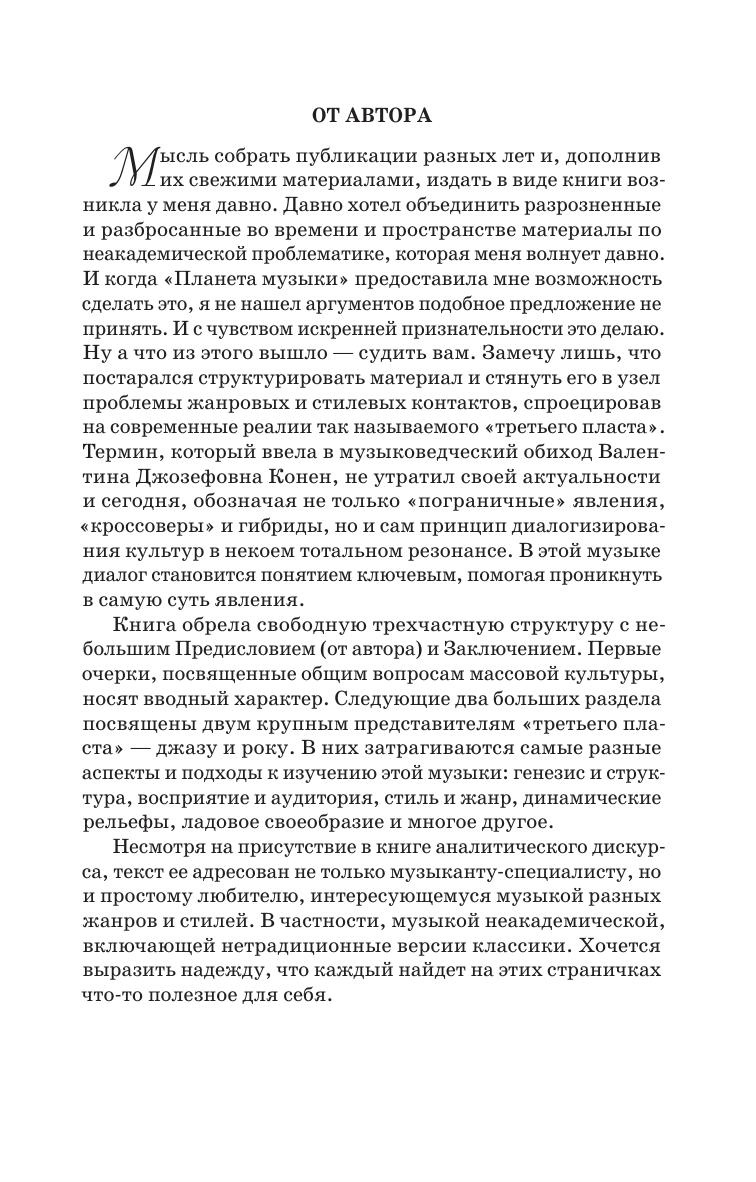 Первые очерки, посвященные общим вопросам массовой культуры, носят вводный характер. Следующие два больших раздела посвящены двум крупным представителям «третьего пласта» — джазу и року. В них затрагиваются самые разные аспекты и подходы к изучению этой музыки: генезис и структура, восприятие и аудитория, стиль и жанр, динамические рельефы, ладовое своеобразие и многое другое.